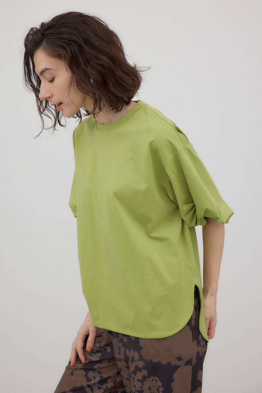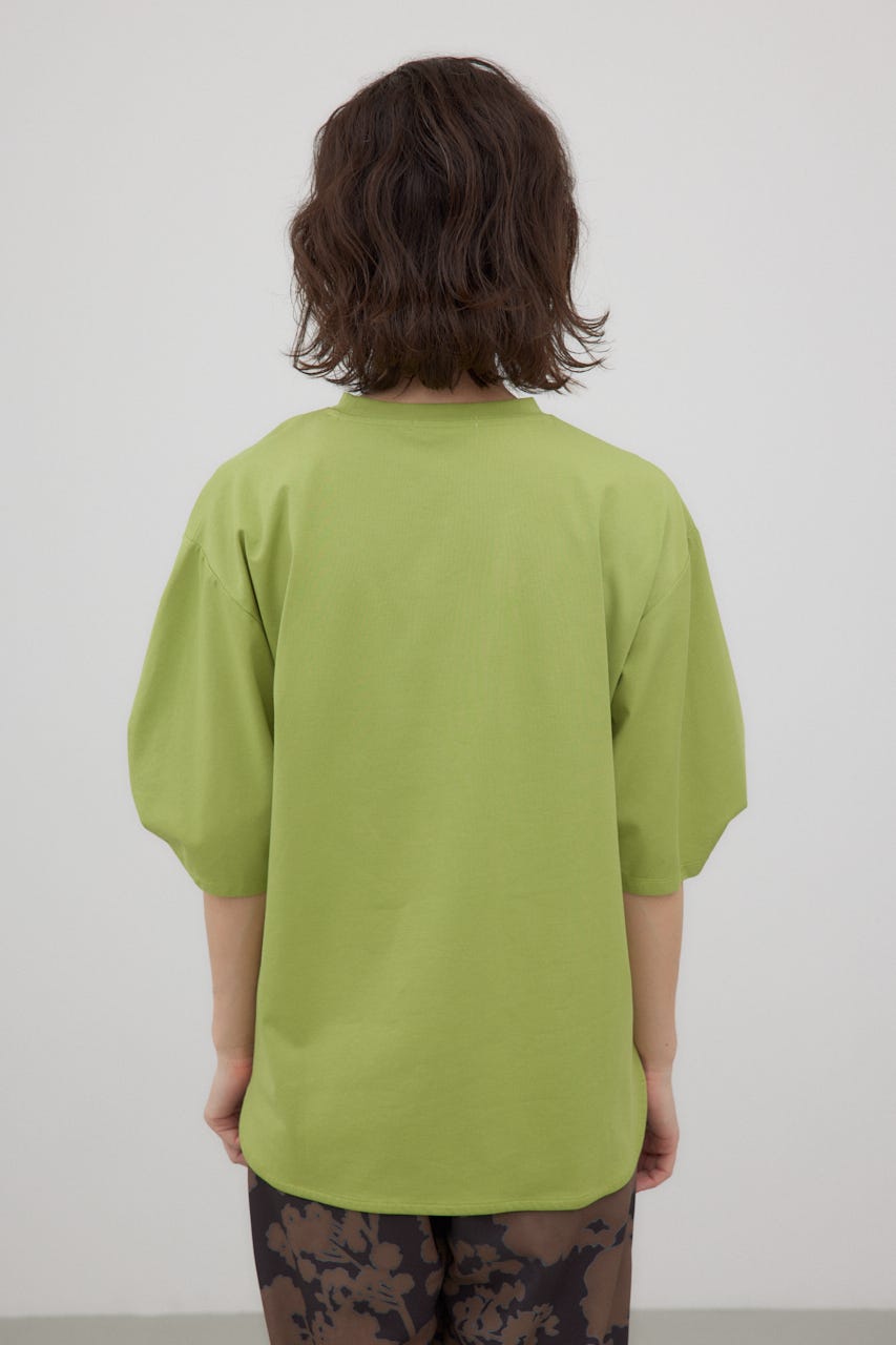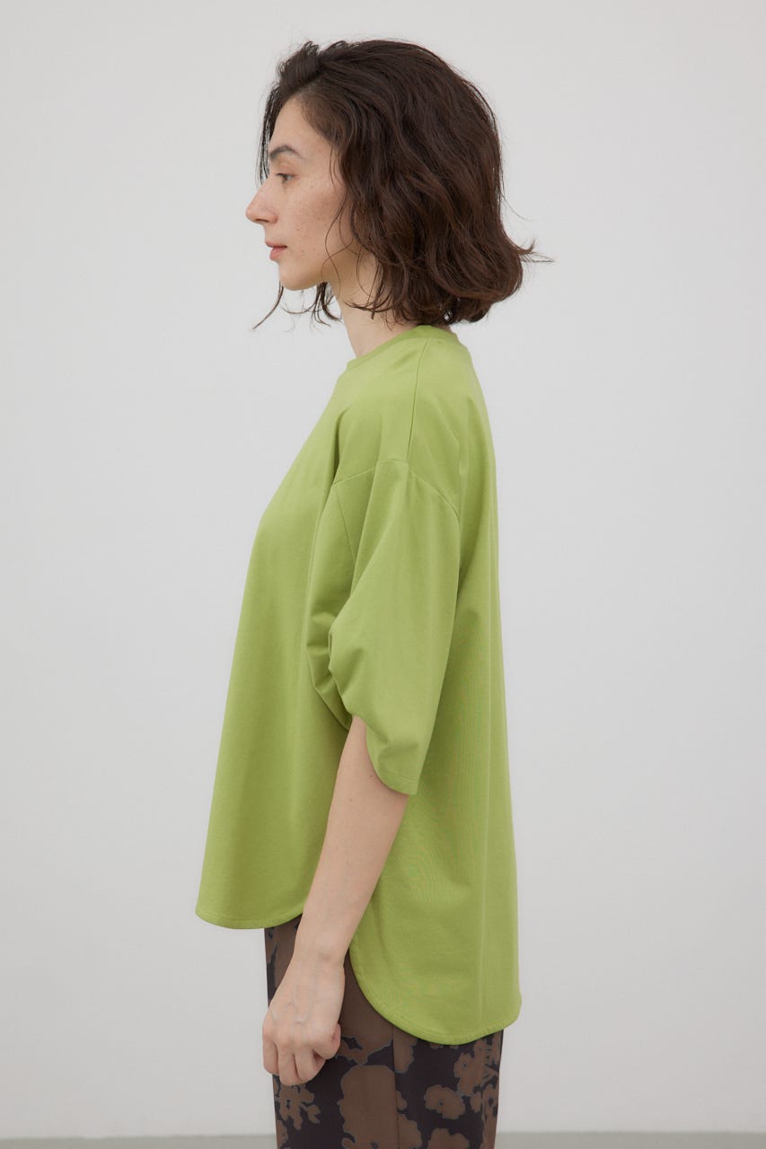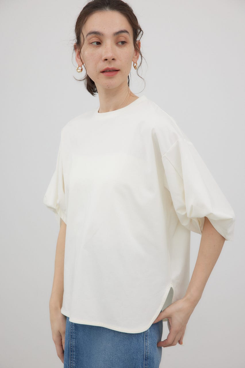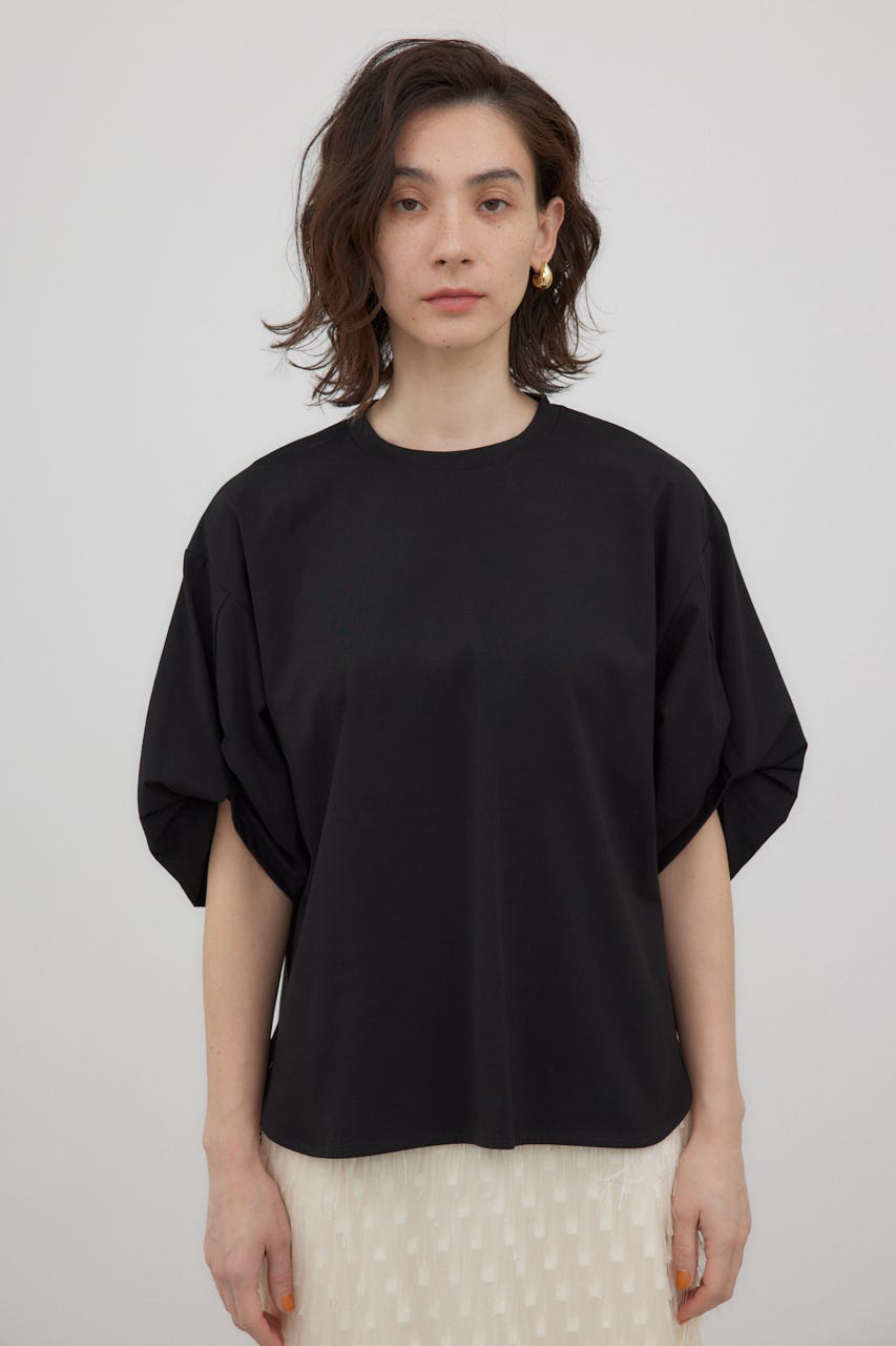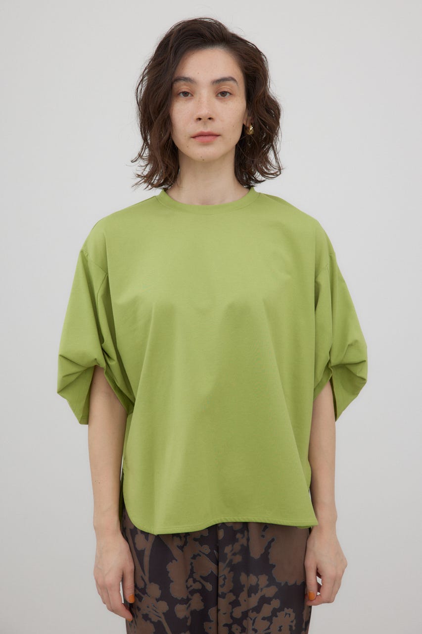 袖を捻ったようなデザインを加えた、シンプルなTシャツ。