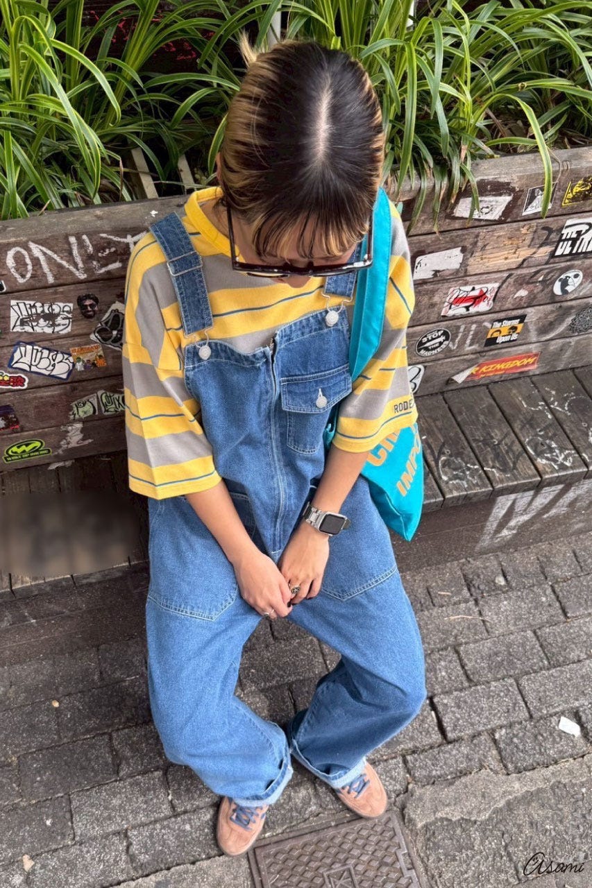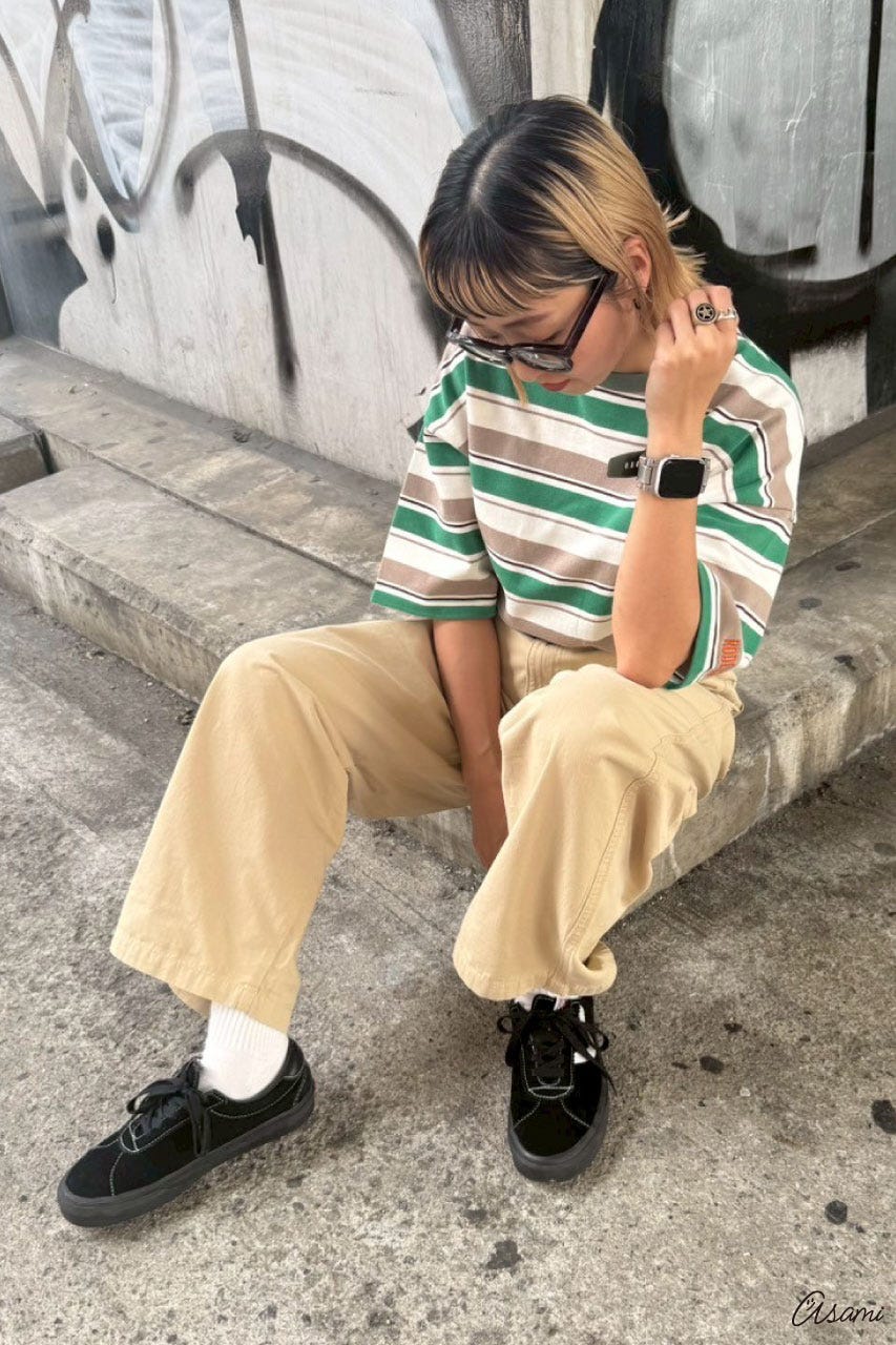 長めの着丈を活かし、バミューダパンツやルーズボトムでメンズライクなスタイリングもおすすめ。