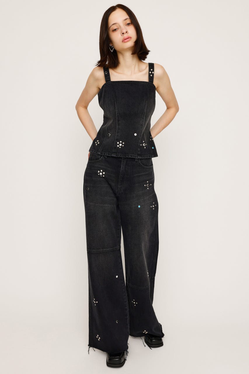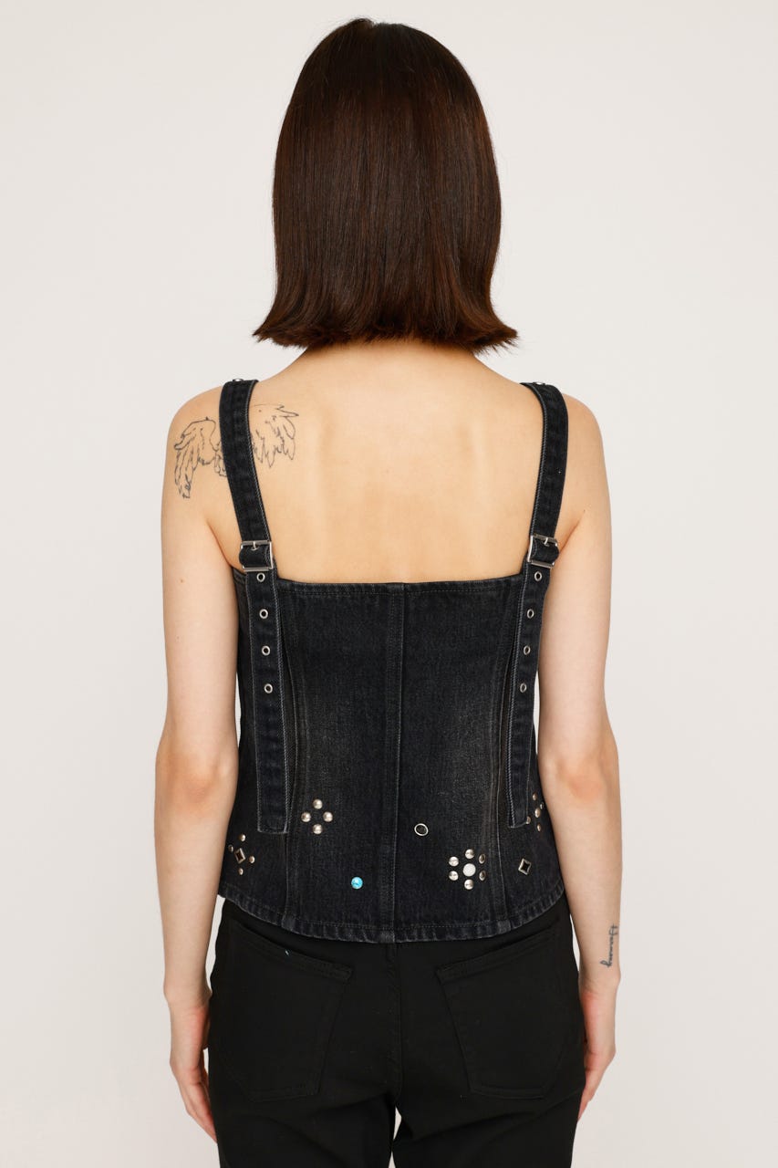 ■POINT:大胆にスタッズを散りばめたレイヤードスタイルのアクセントとしてかかせないデニムビスチェが登場。