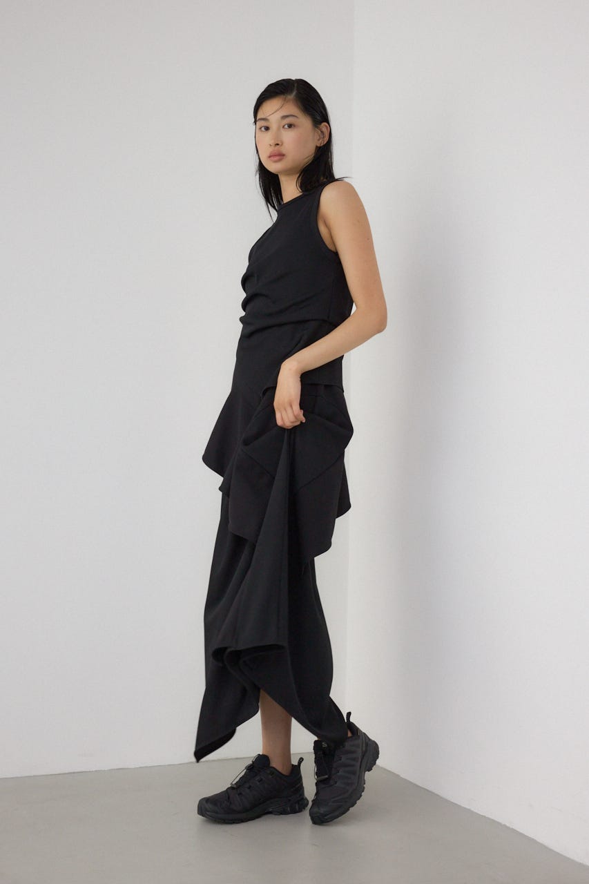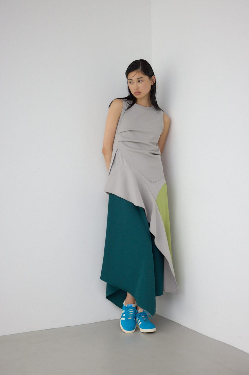 一枚着、セット着用はもちろん、インナーワンピースをニットベスト(250ISP70-368E PLUSアシンメトリードレープニットベスト)やシャツと合わせたレイヤードスタイルもおすすめです。