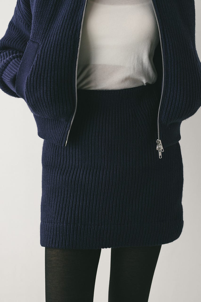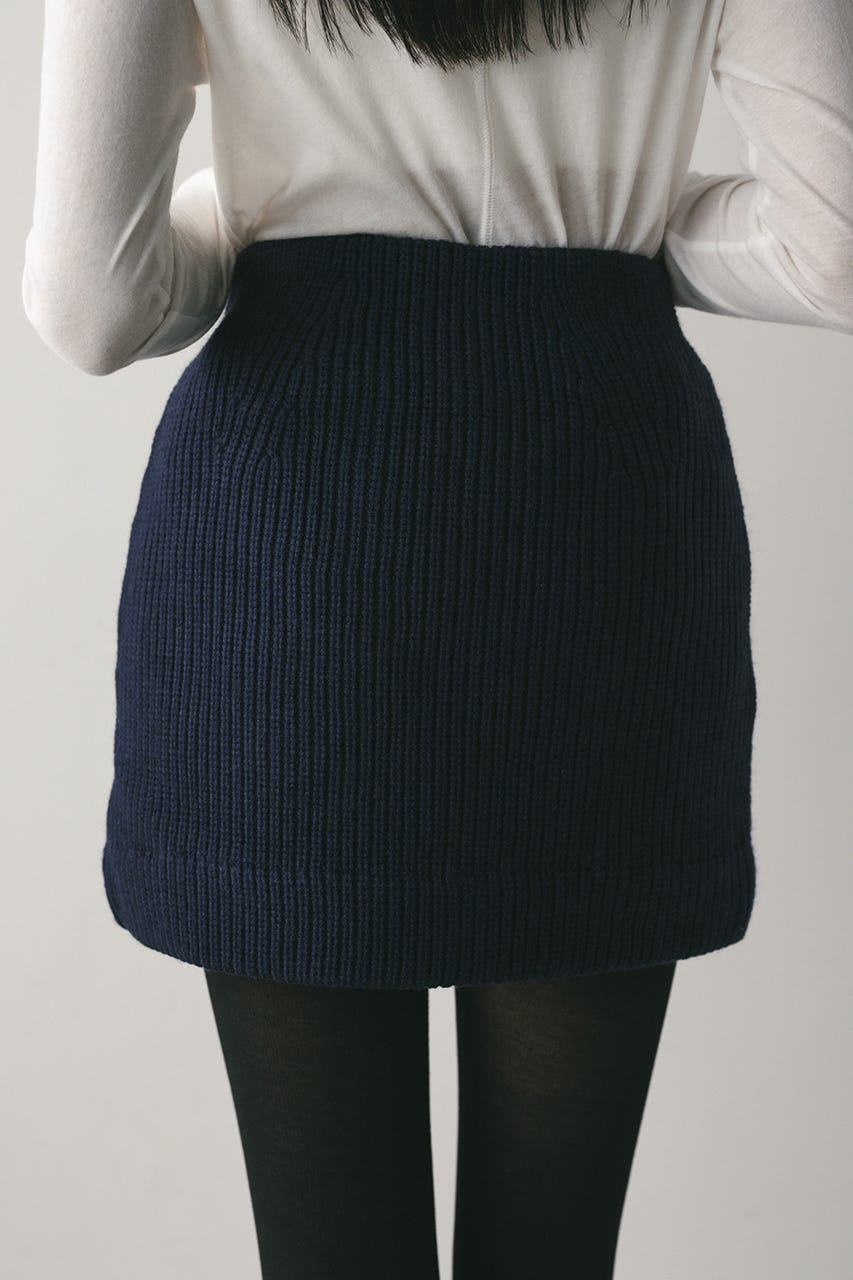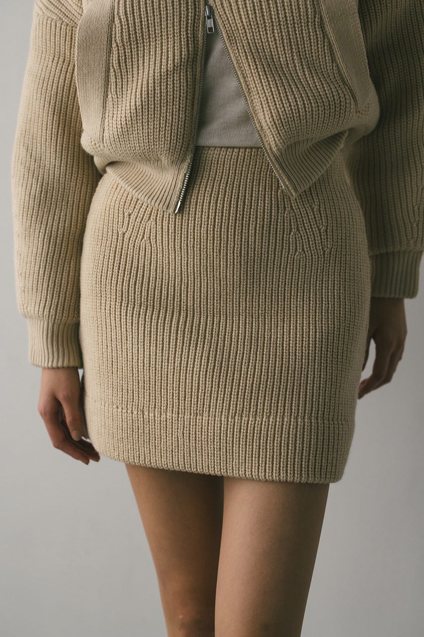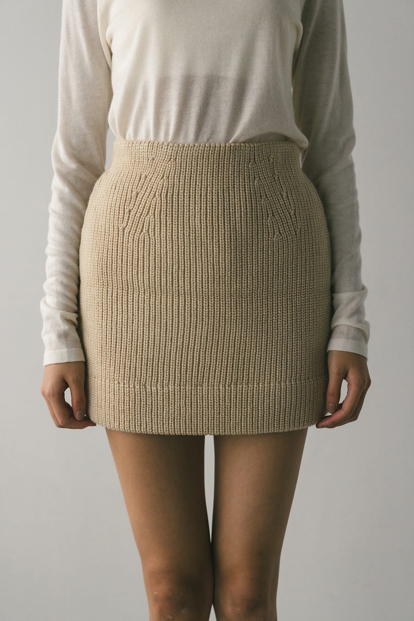 中綿のスカートを温かみのあるニット素材で編立てで仕上げたニットパッファーミニスカート。