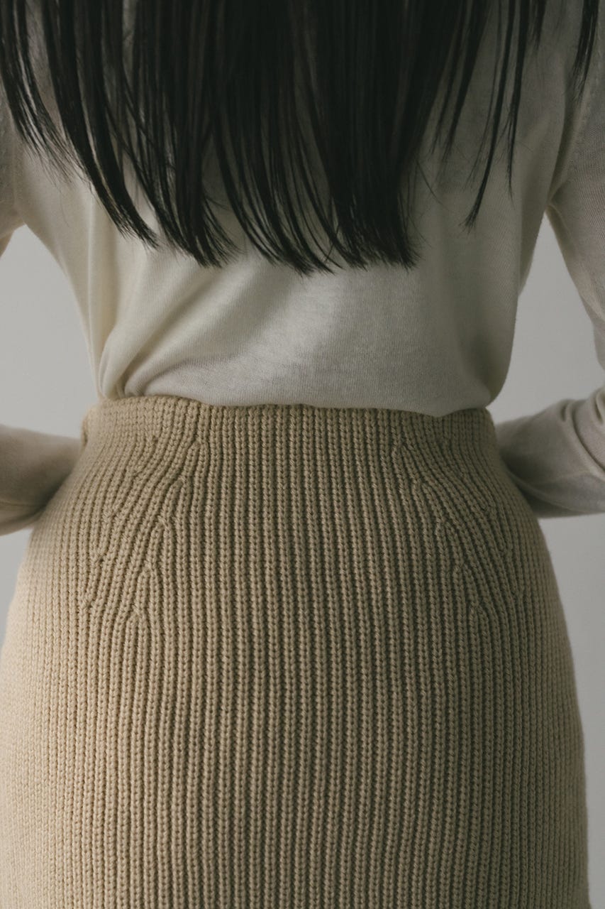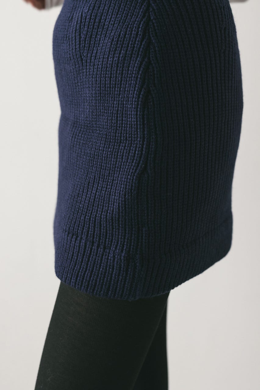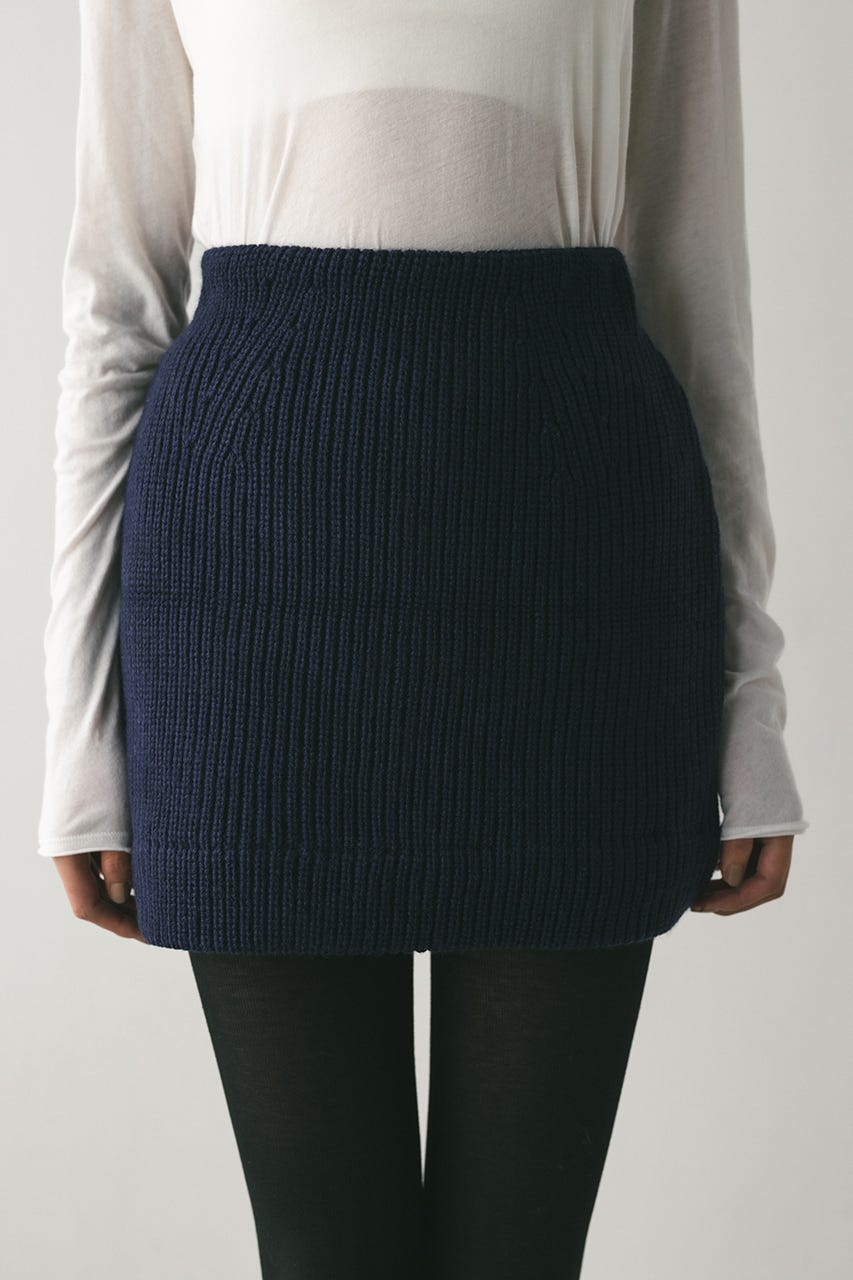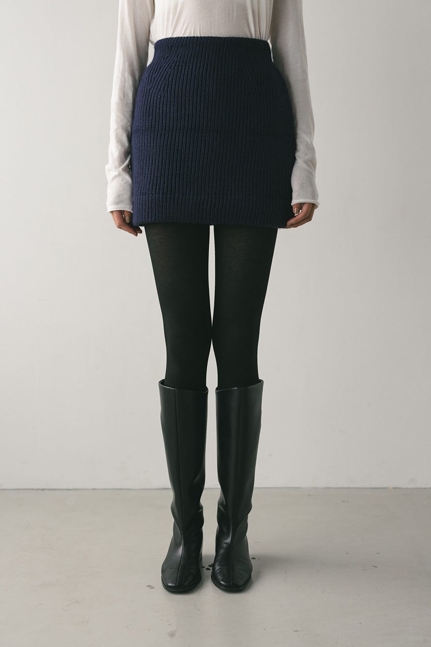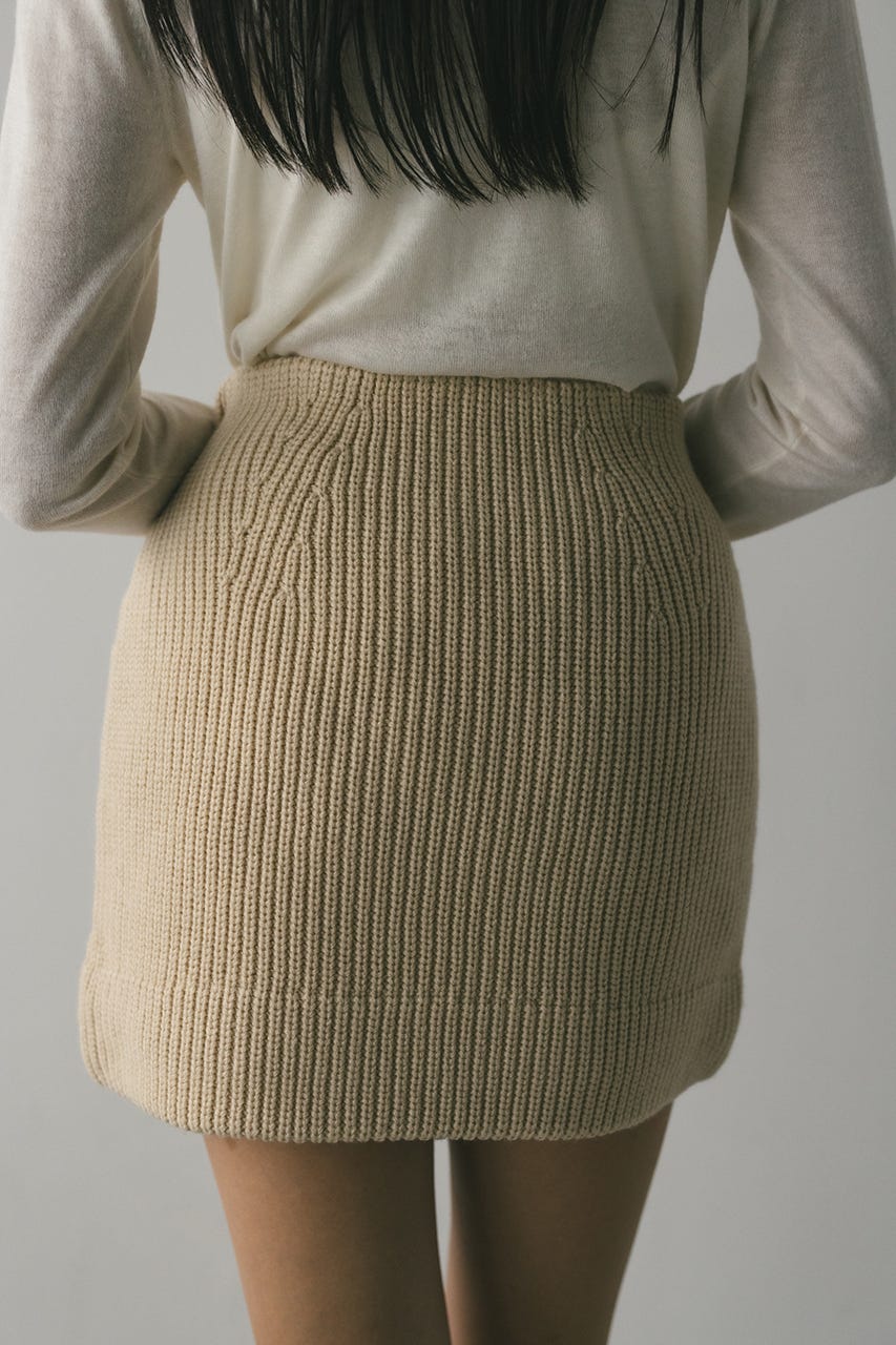 中綿のスカートを温かみのあるニット素材で編立てで仕上げたニットパッファーミニスカート。