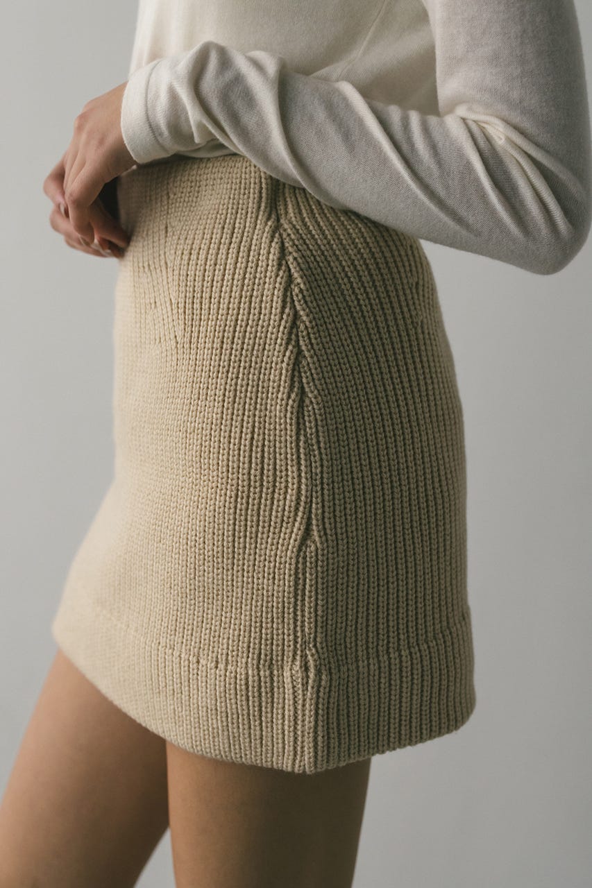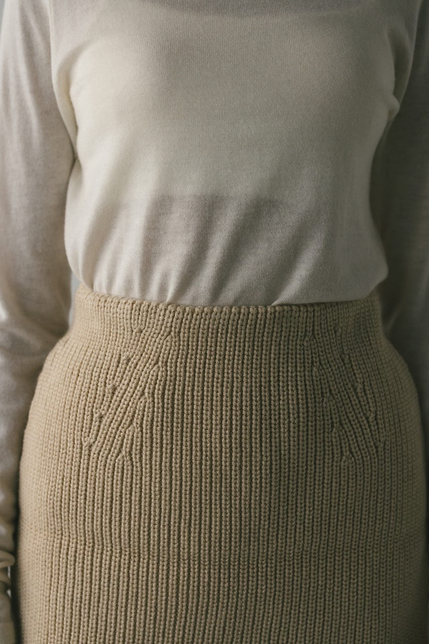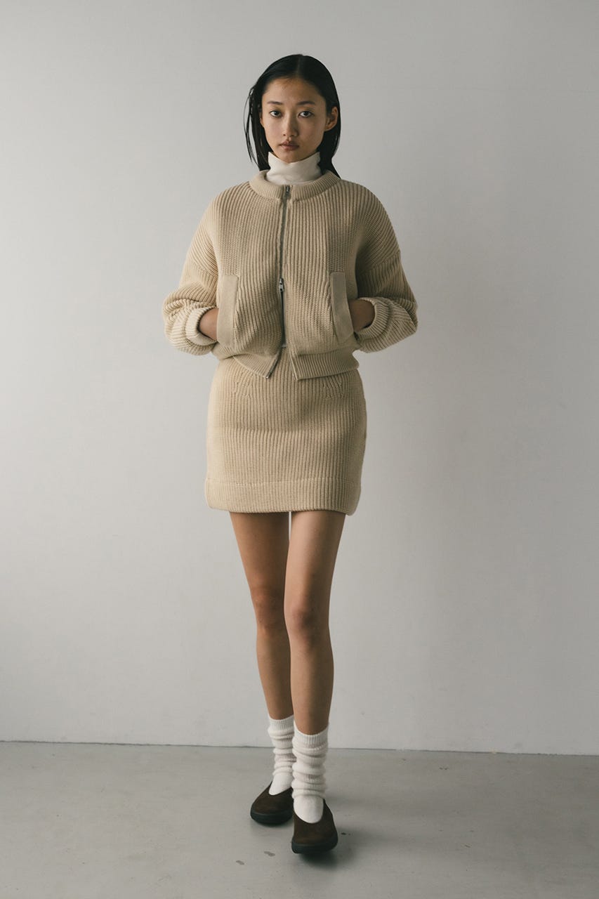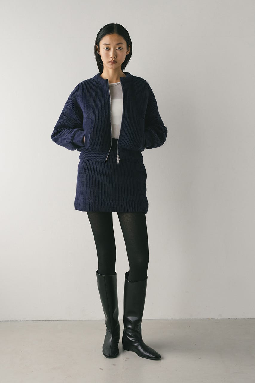 中綿のスカートを温かみのあるニット素材で編立てで仕上げたニットパッファーミニスカート。