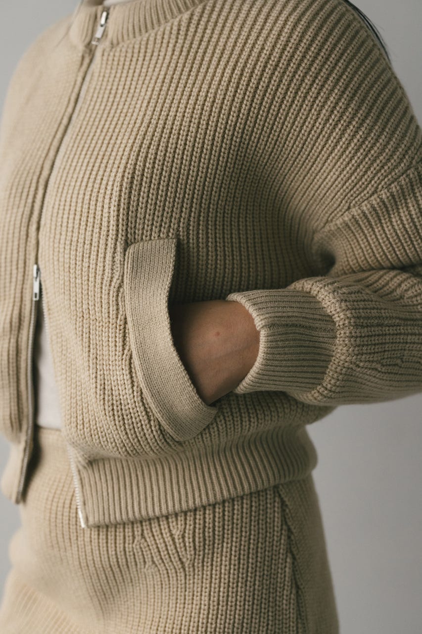 中綿ジャケットを暖か味のあるニット素材で編立てたニットパッファーブルゾン。
