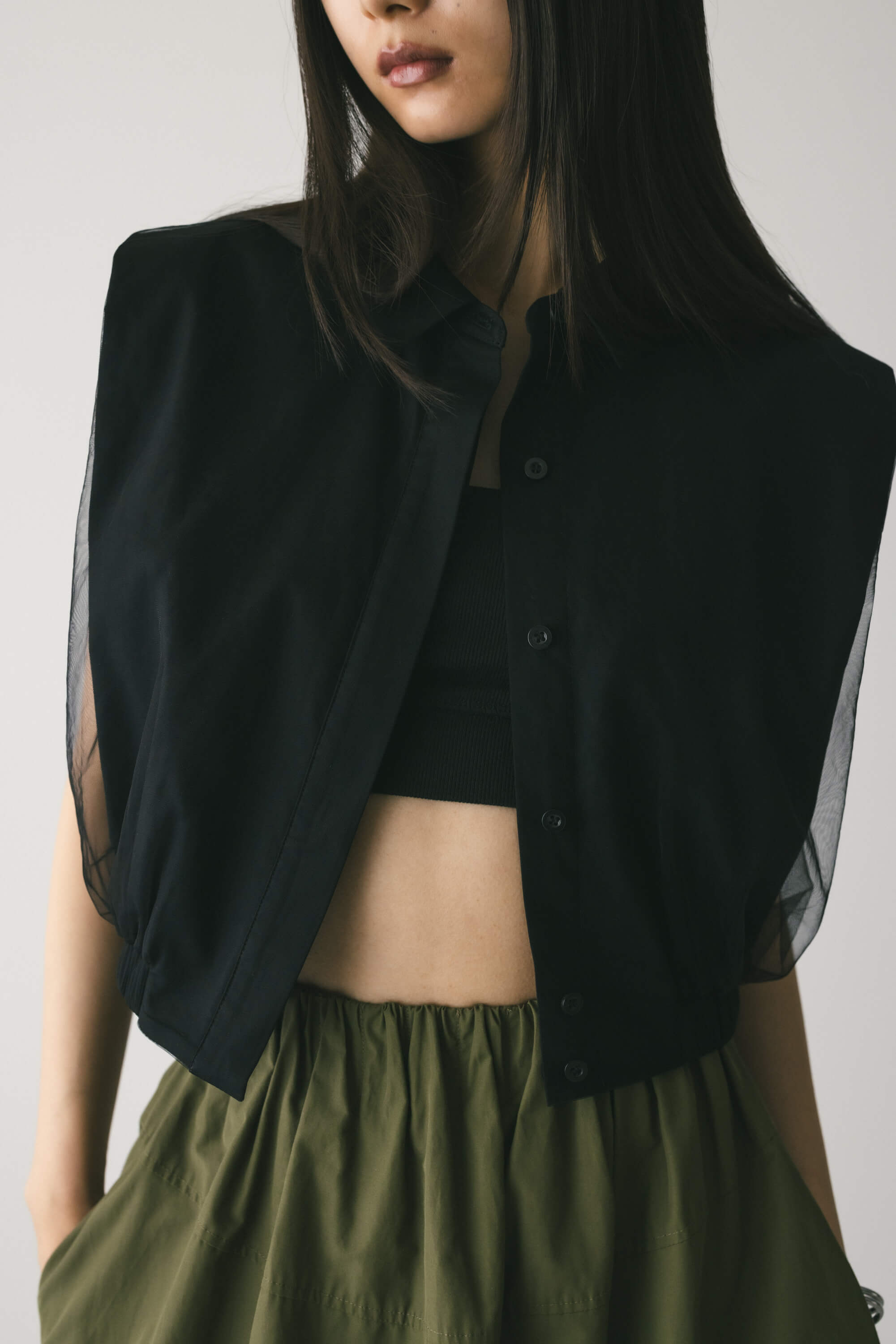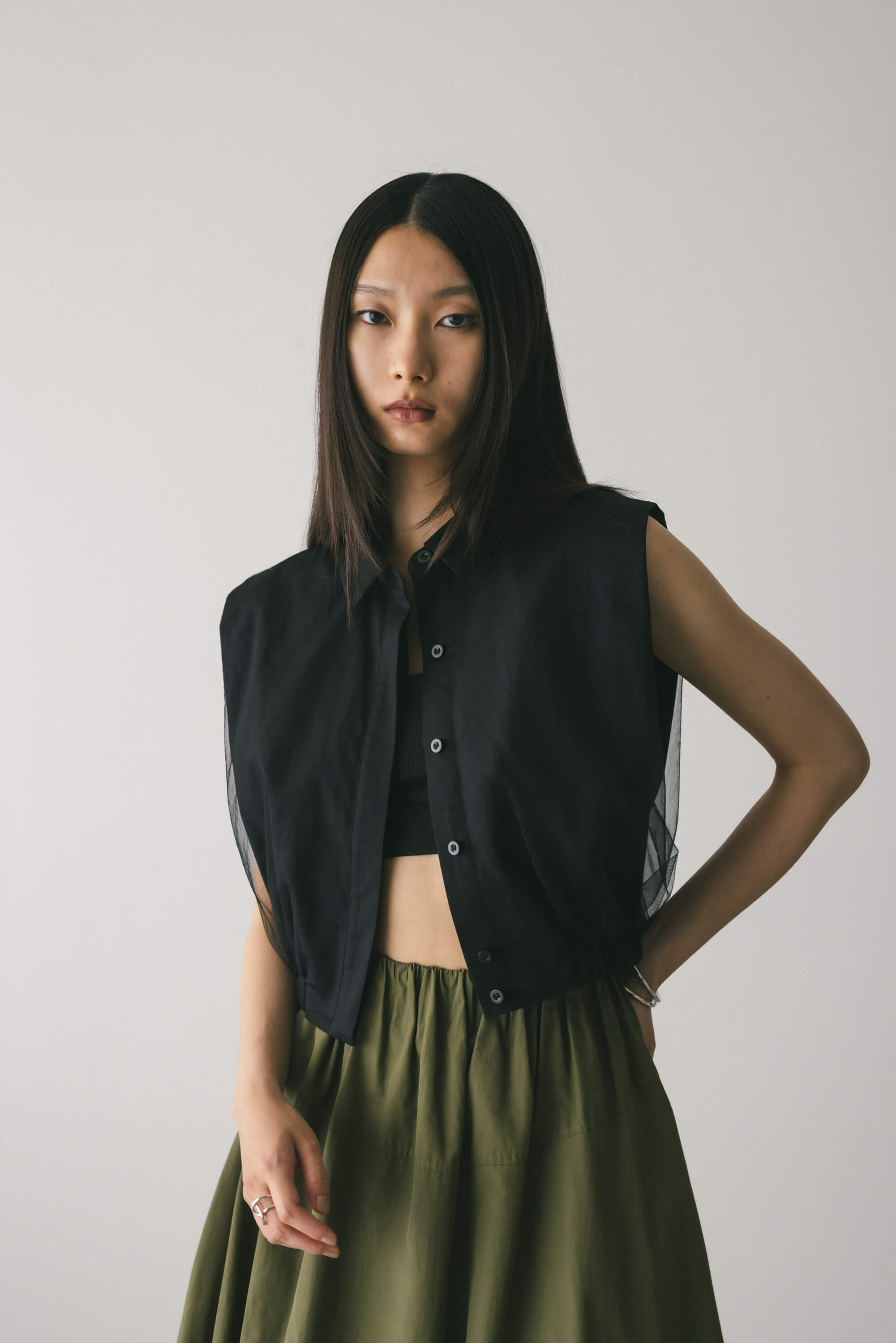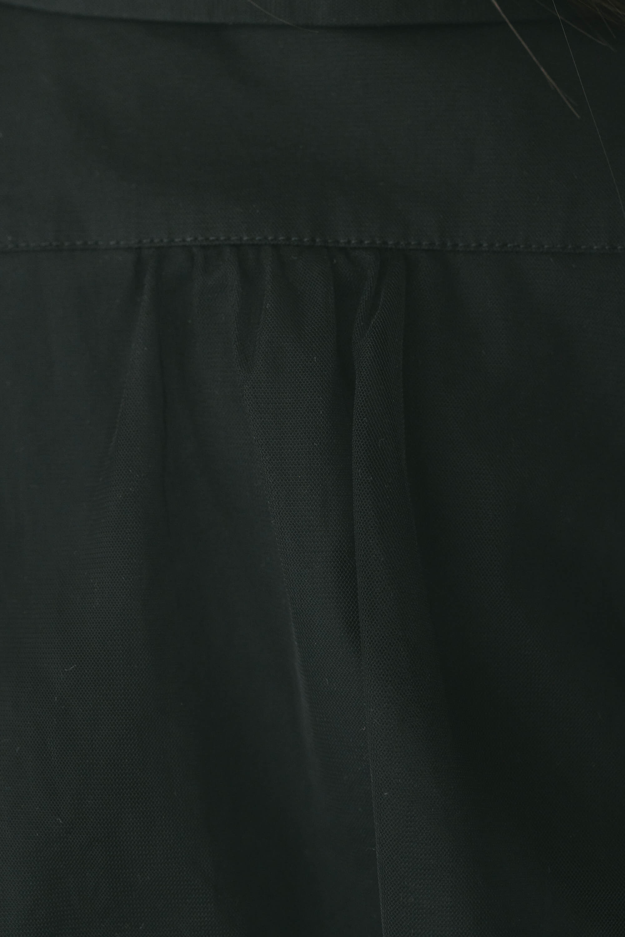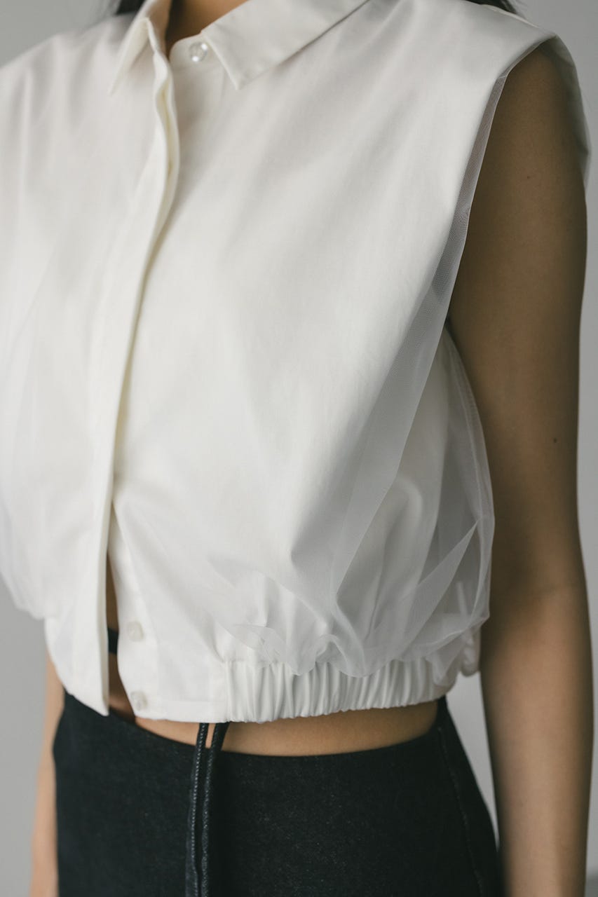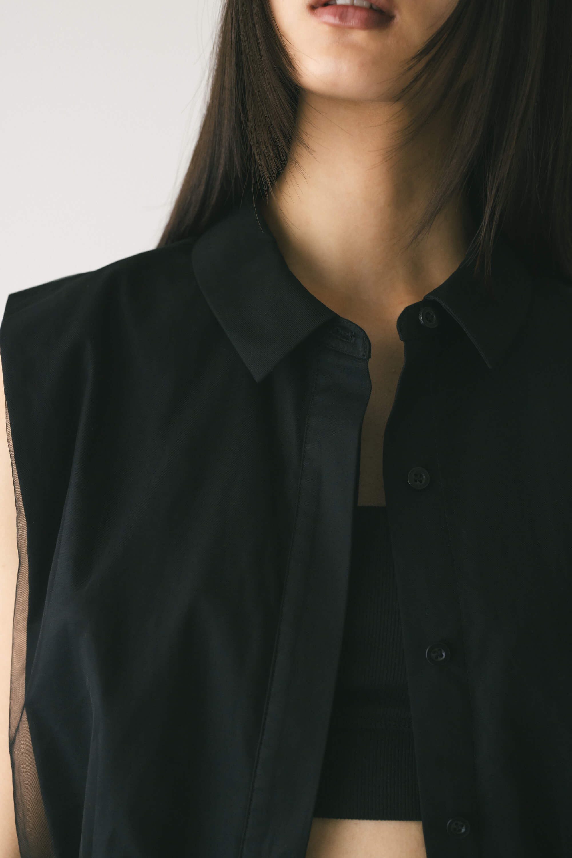 シャツとチュールをドッキングしたコンパクトレイヤードシャツ。