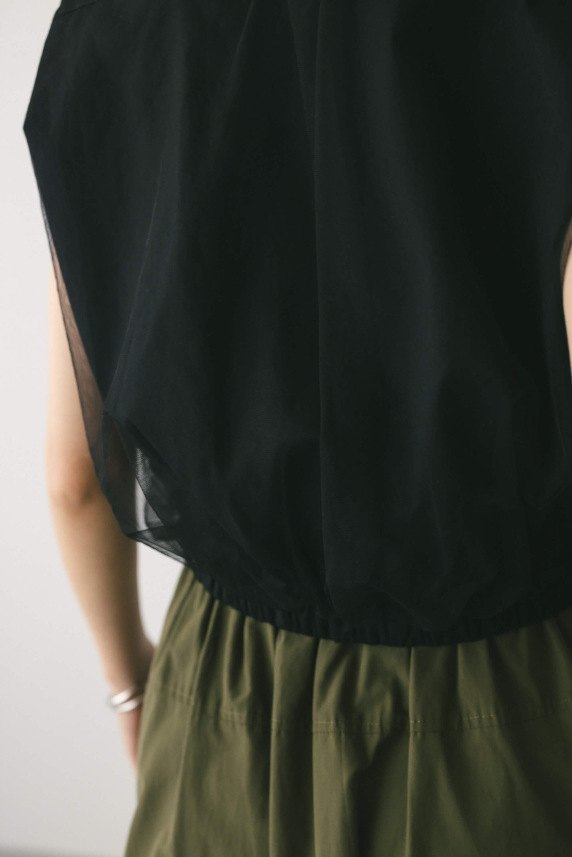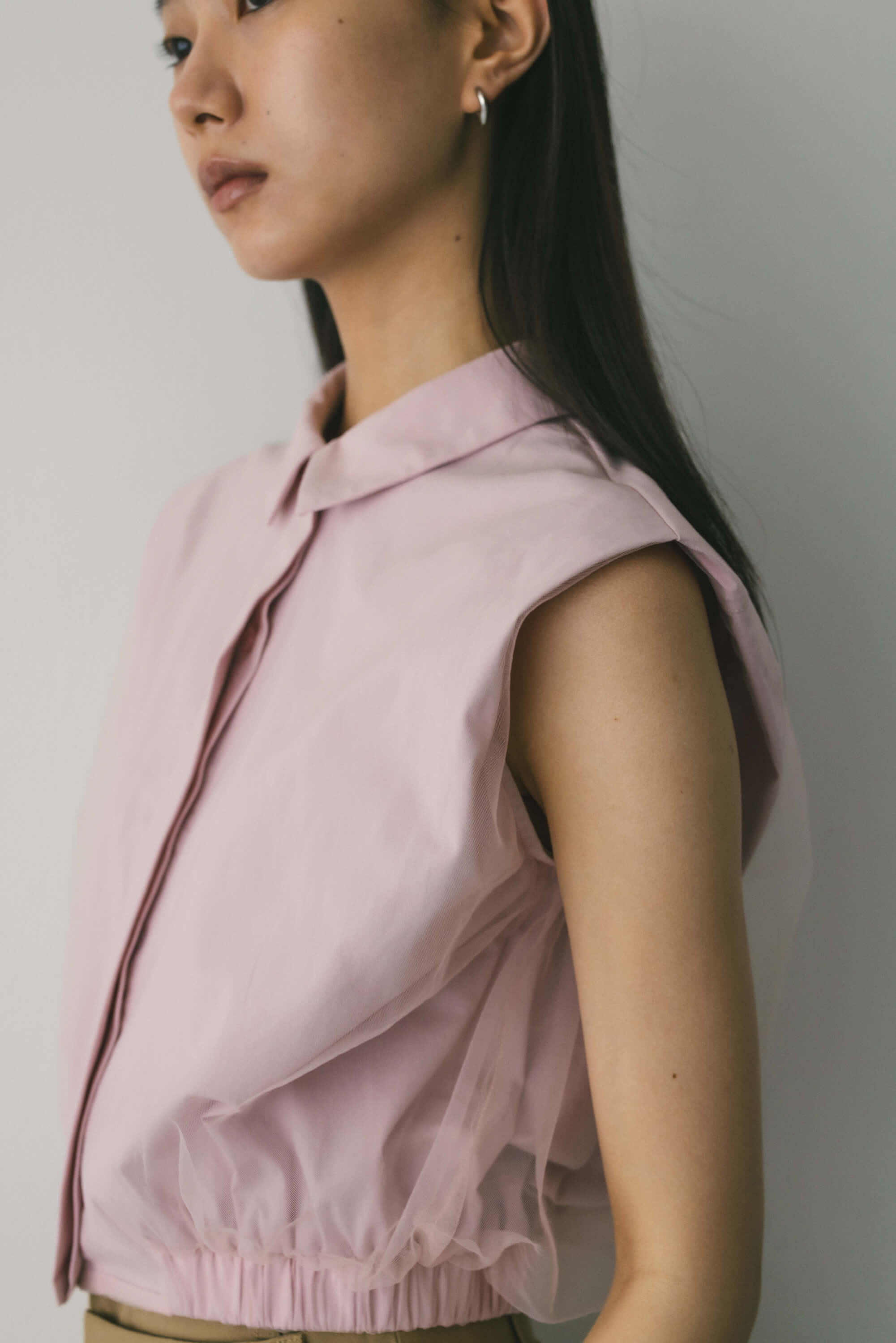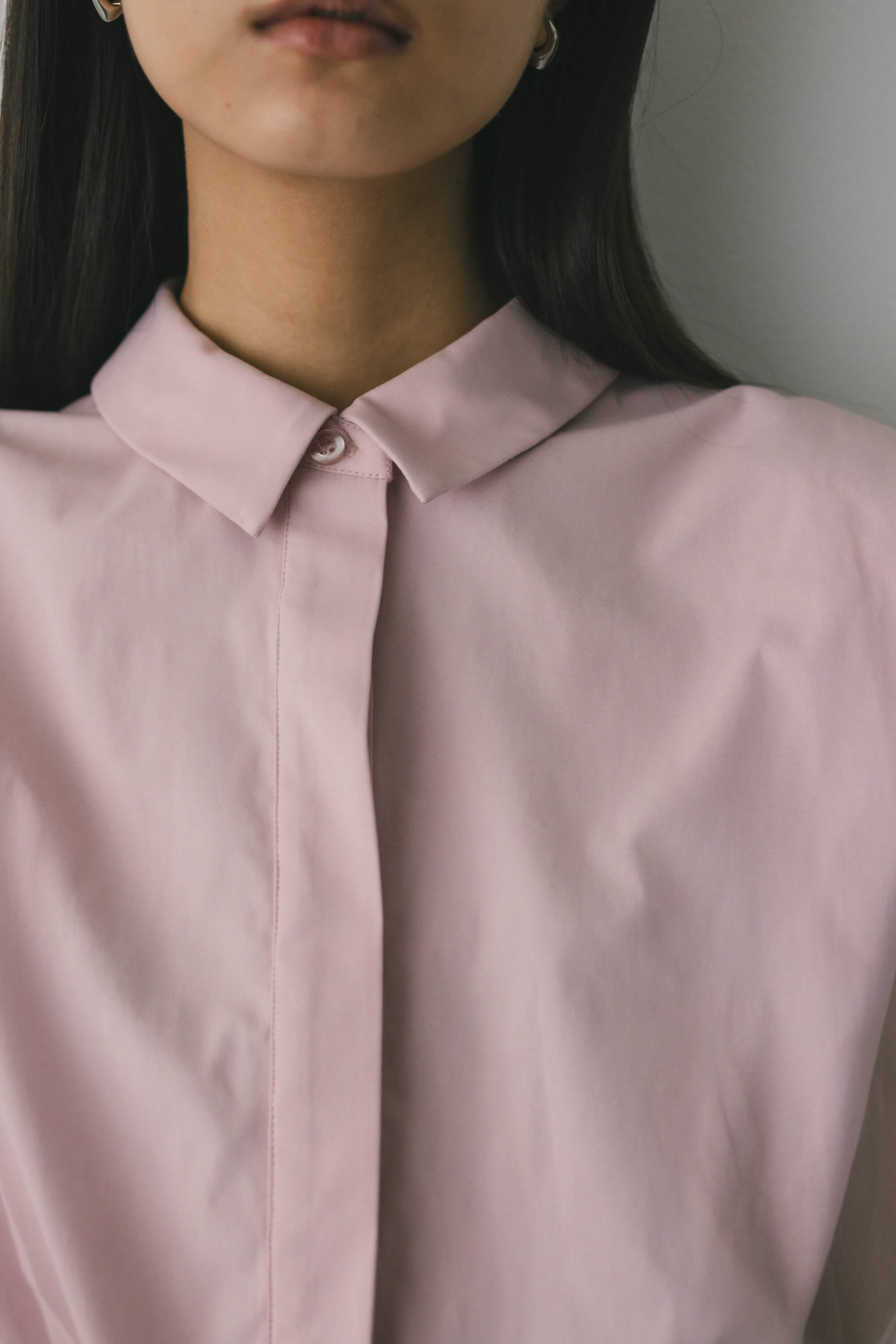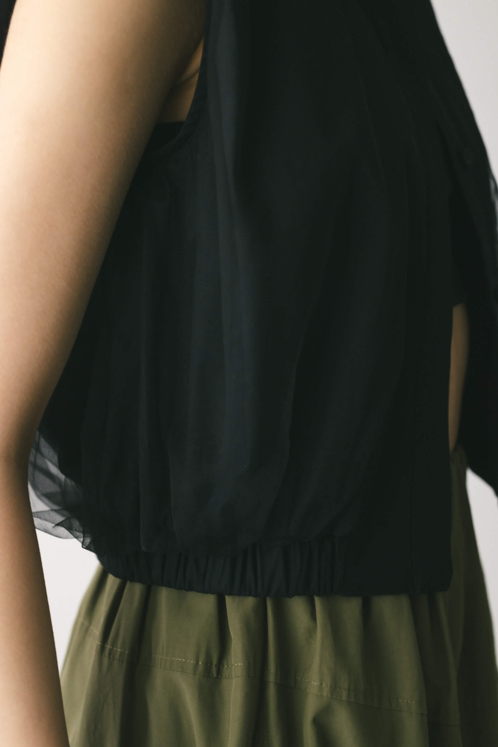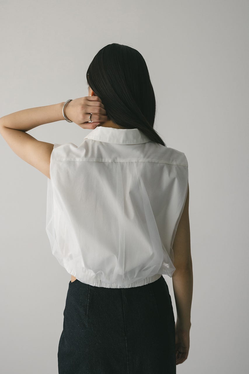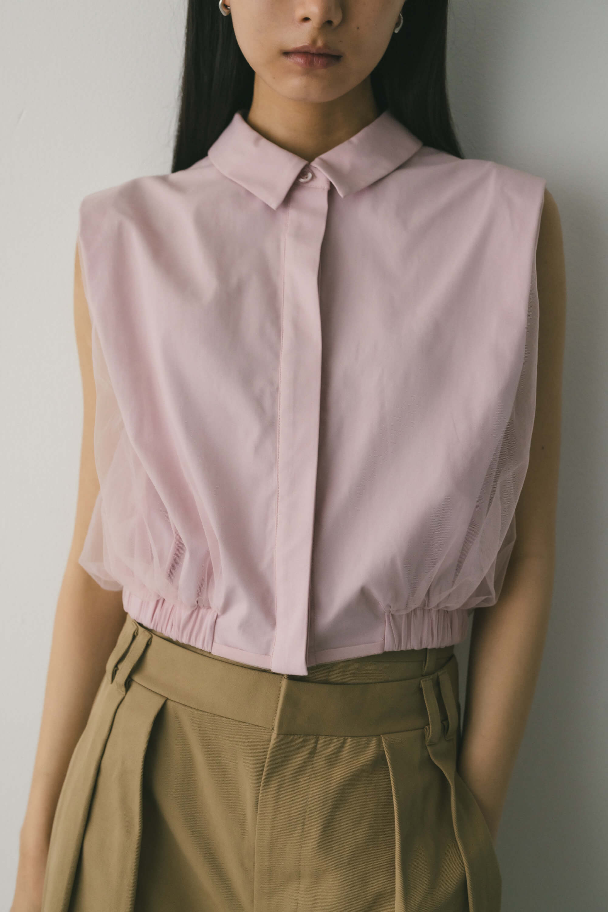 シャツとチュールをドッキングしたコンパクトレイヤードシャツ。