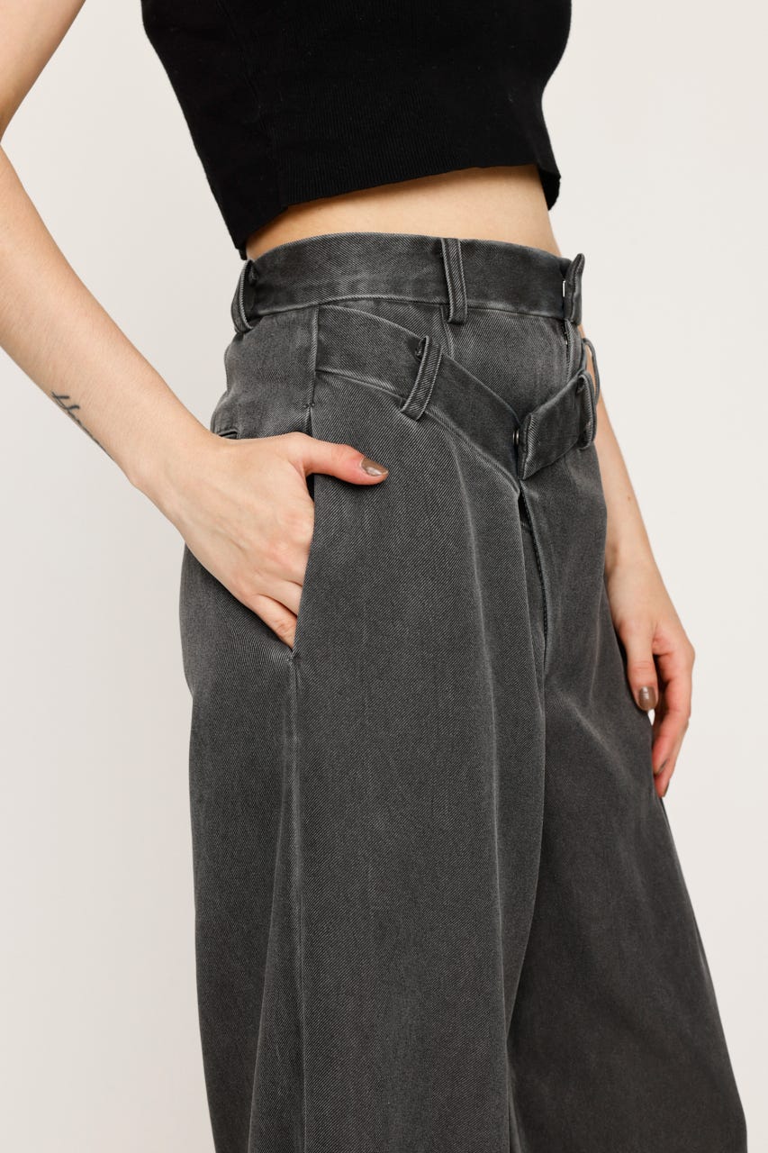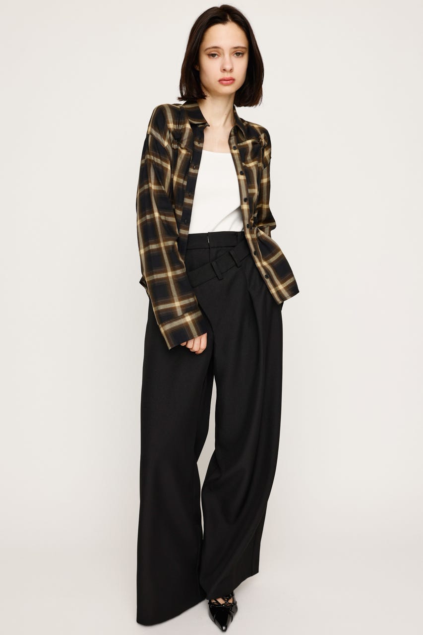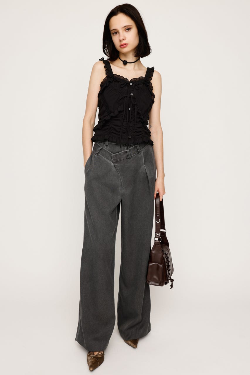 ■POINT:ウエストのアシンメトリーデザインが1枚で重ね着しているように見えるデザインパンツ。