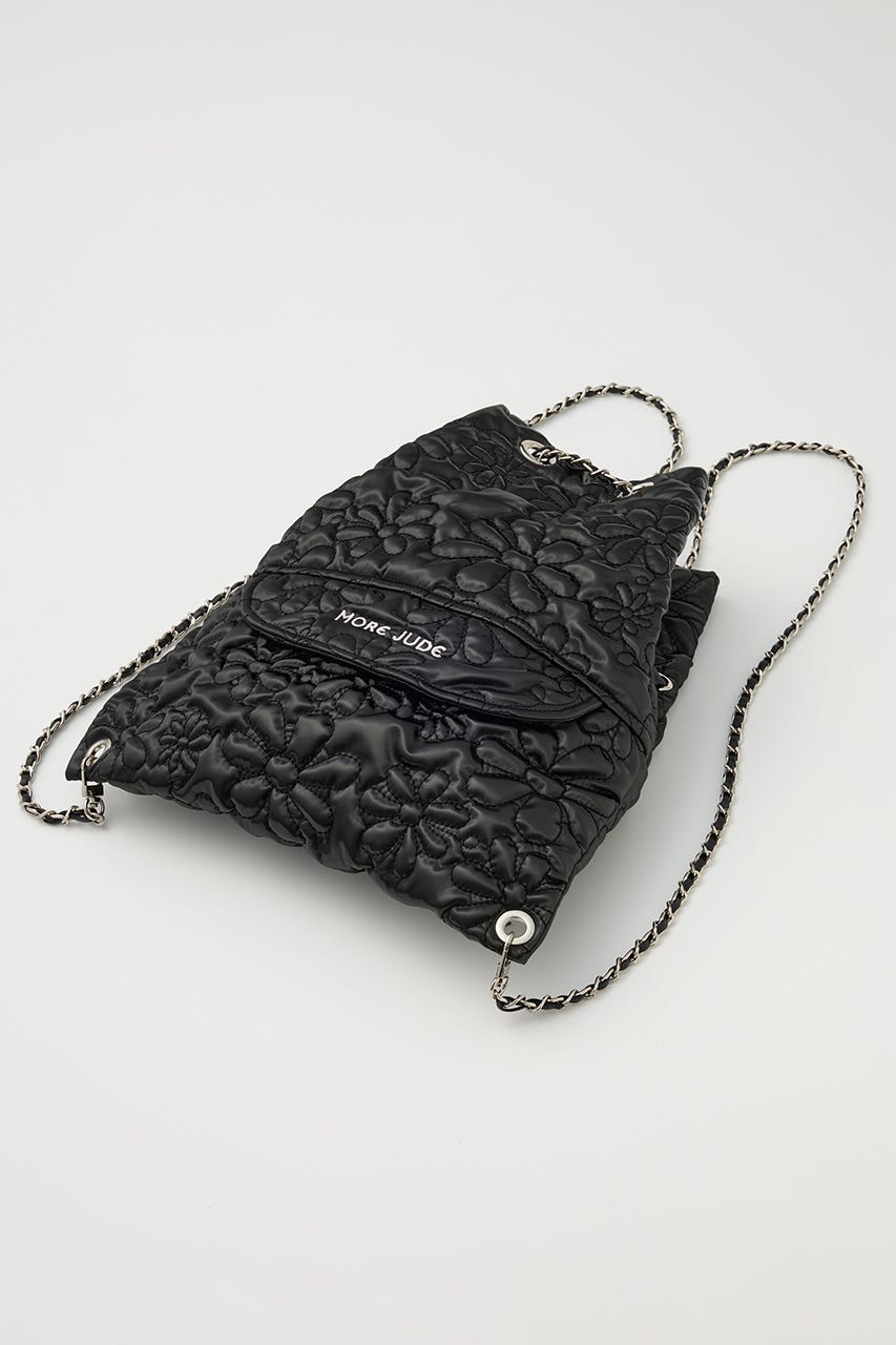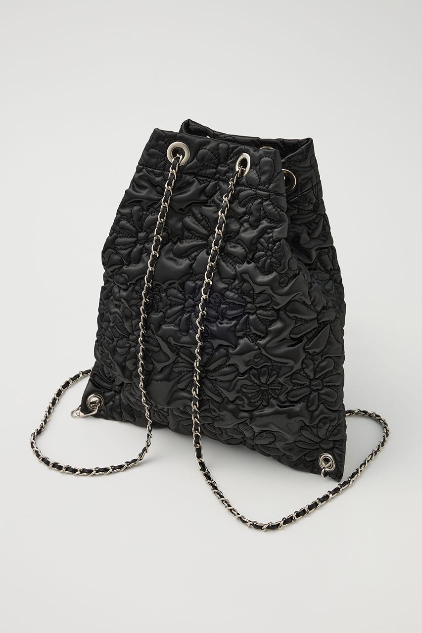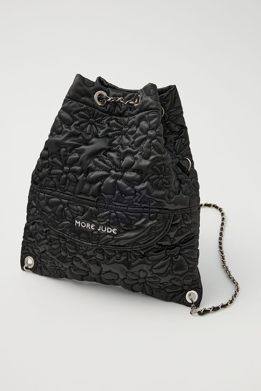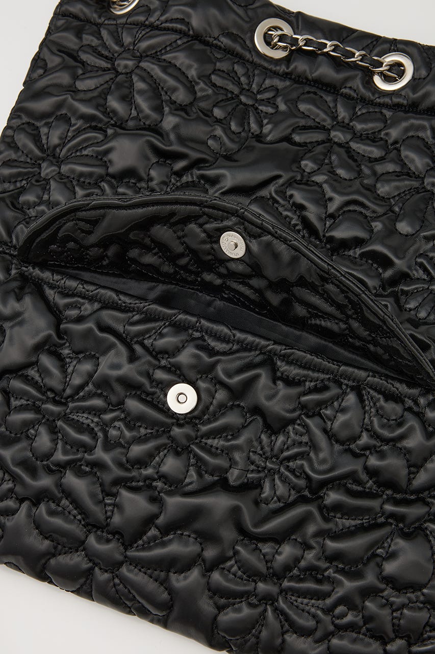 フラワー刺繍のキルティング生地で光沢感があり、高級感がありながらもカジュアルにも使えるアイテム。