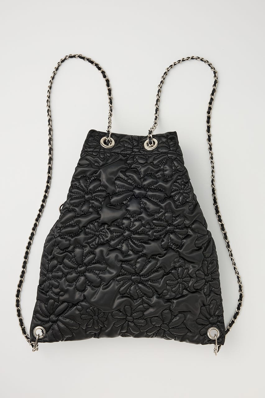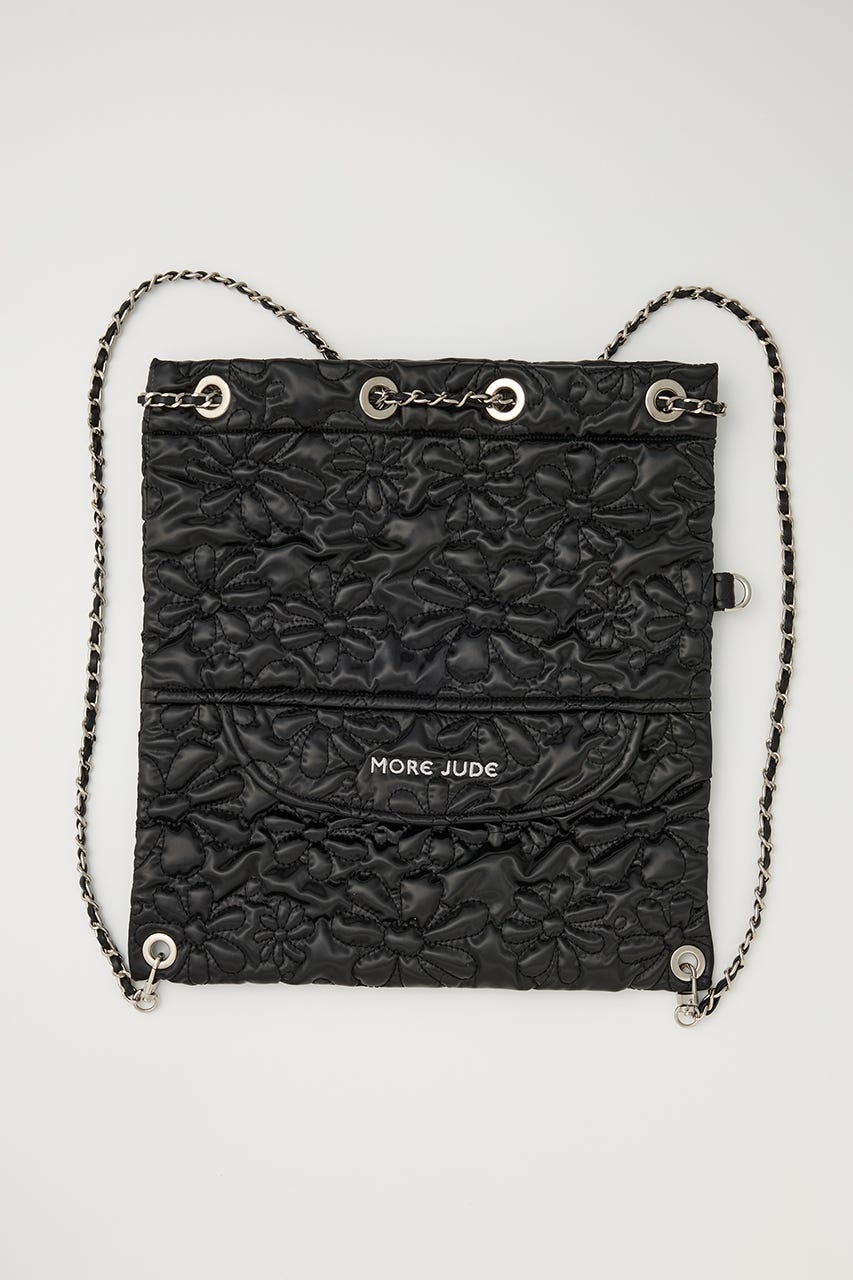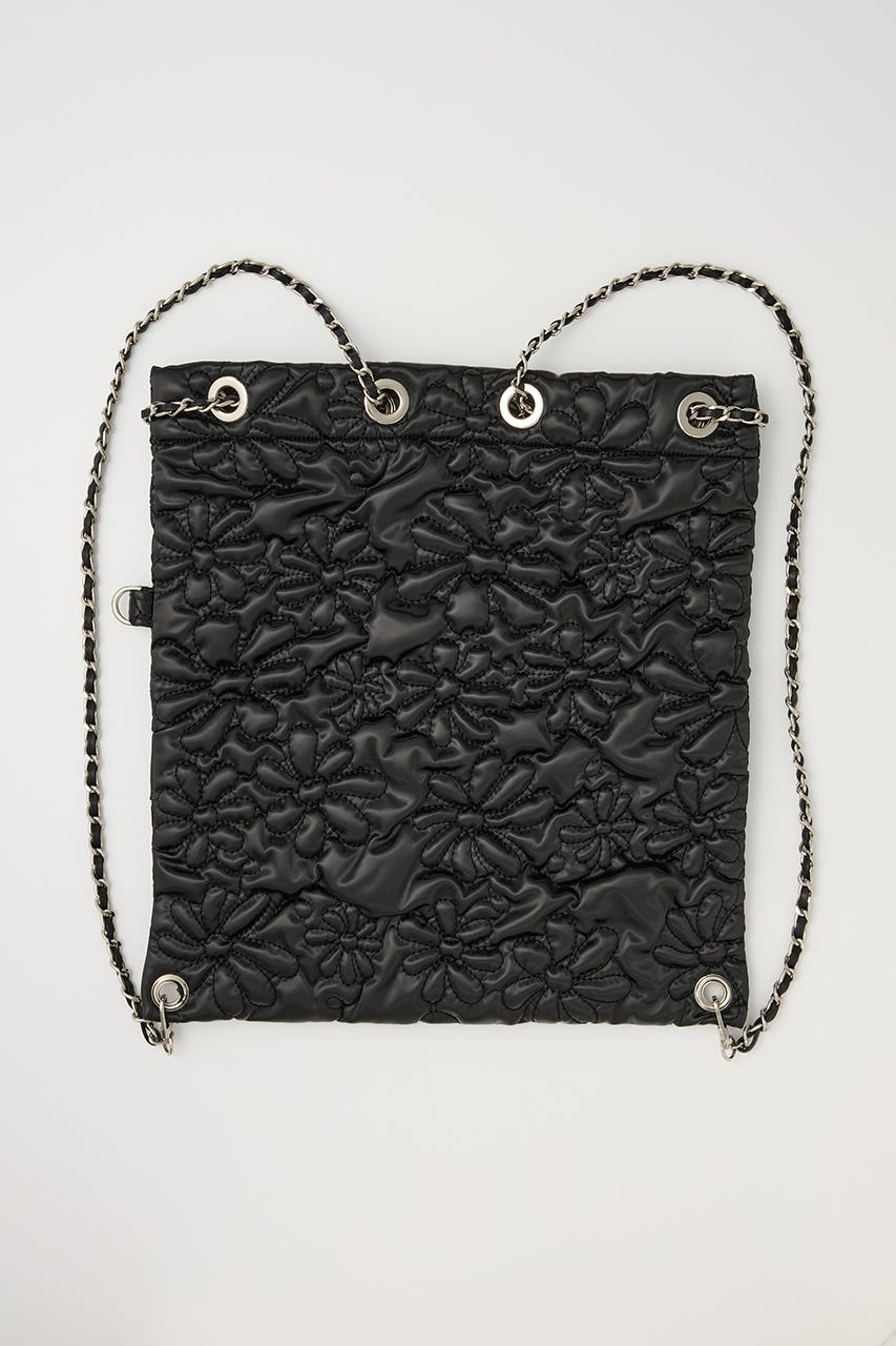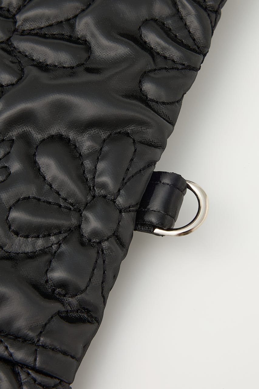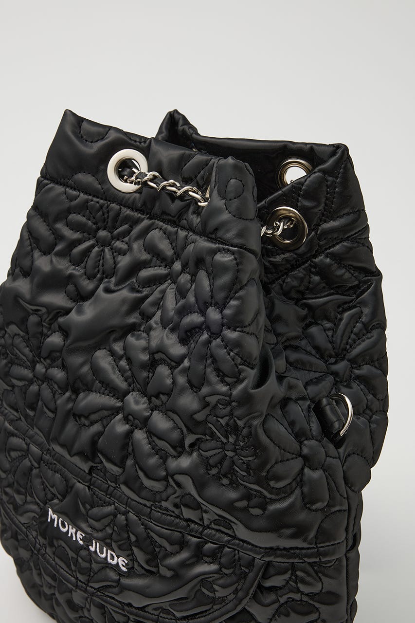 フラワー刺繍のキルティング生地で光沢感があり、高級感がありながらもカジュアルにも使えるアイテム。