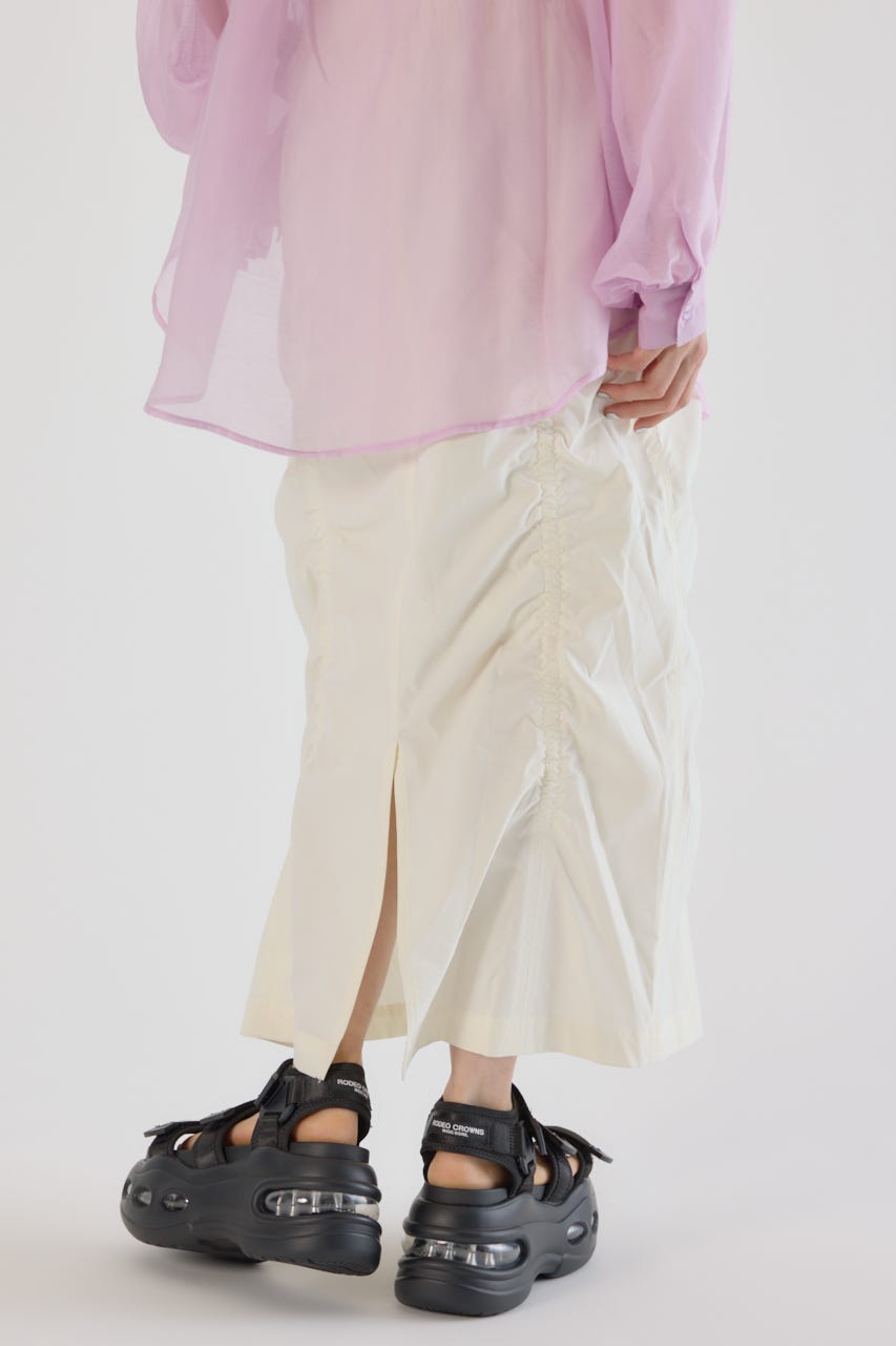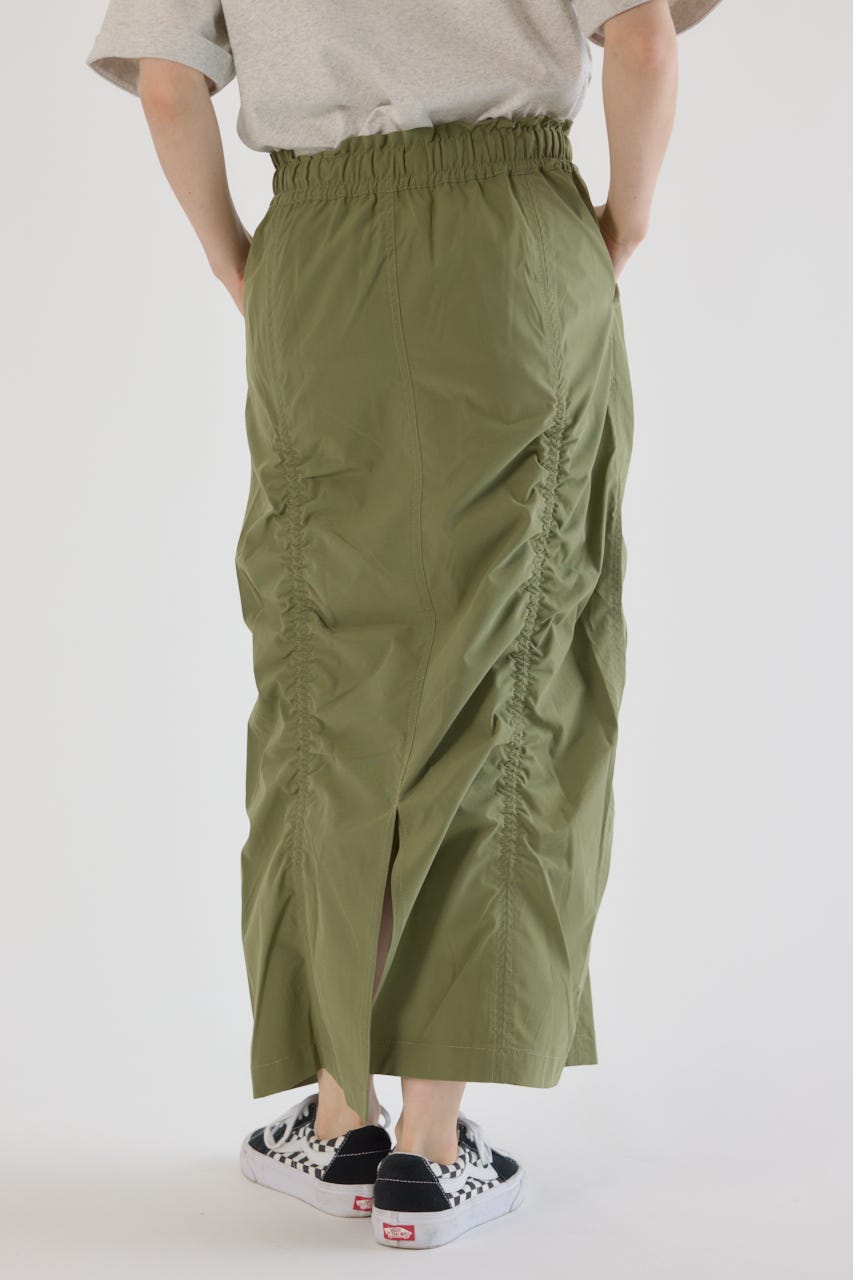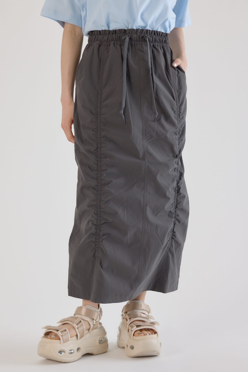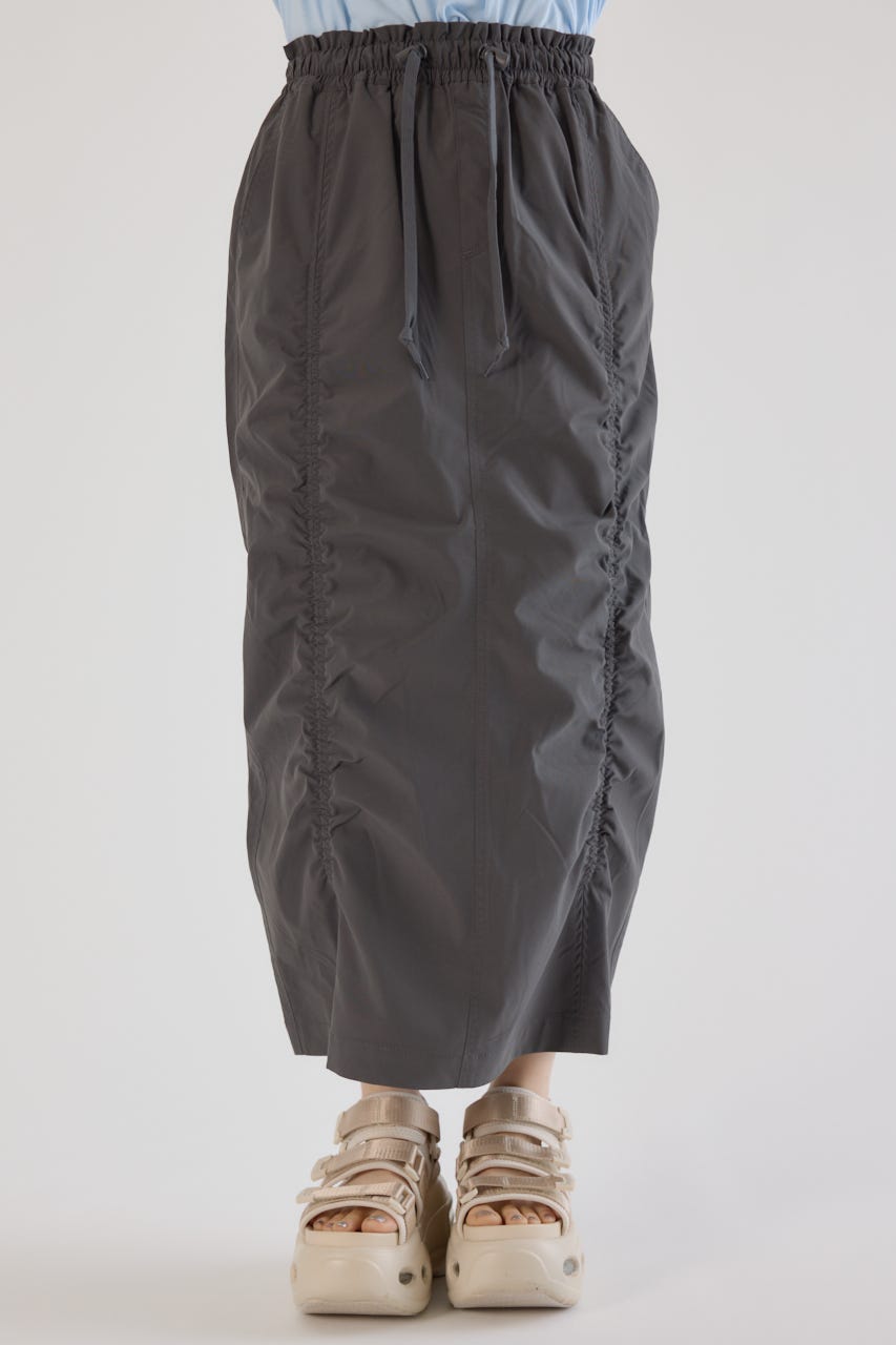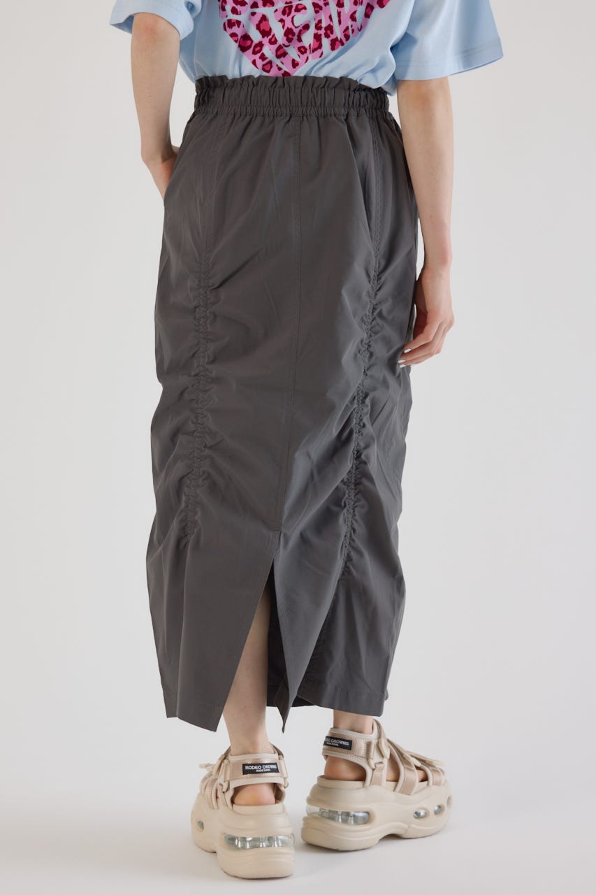 フロントとバックにシャーリングを効かせたデザインが目を惹くスカート。