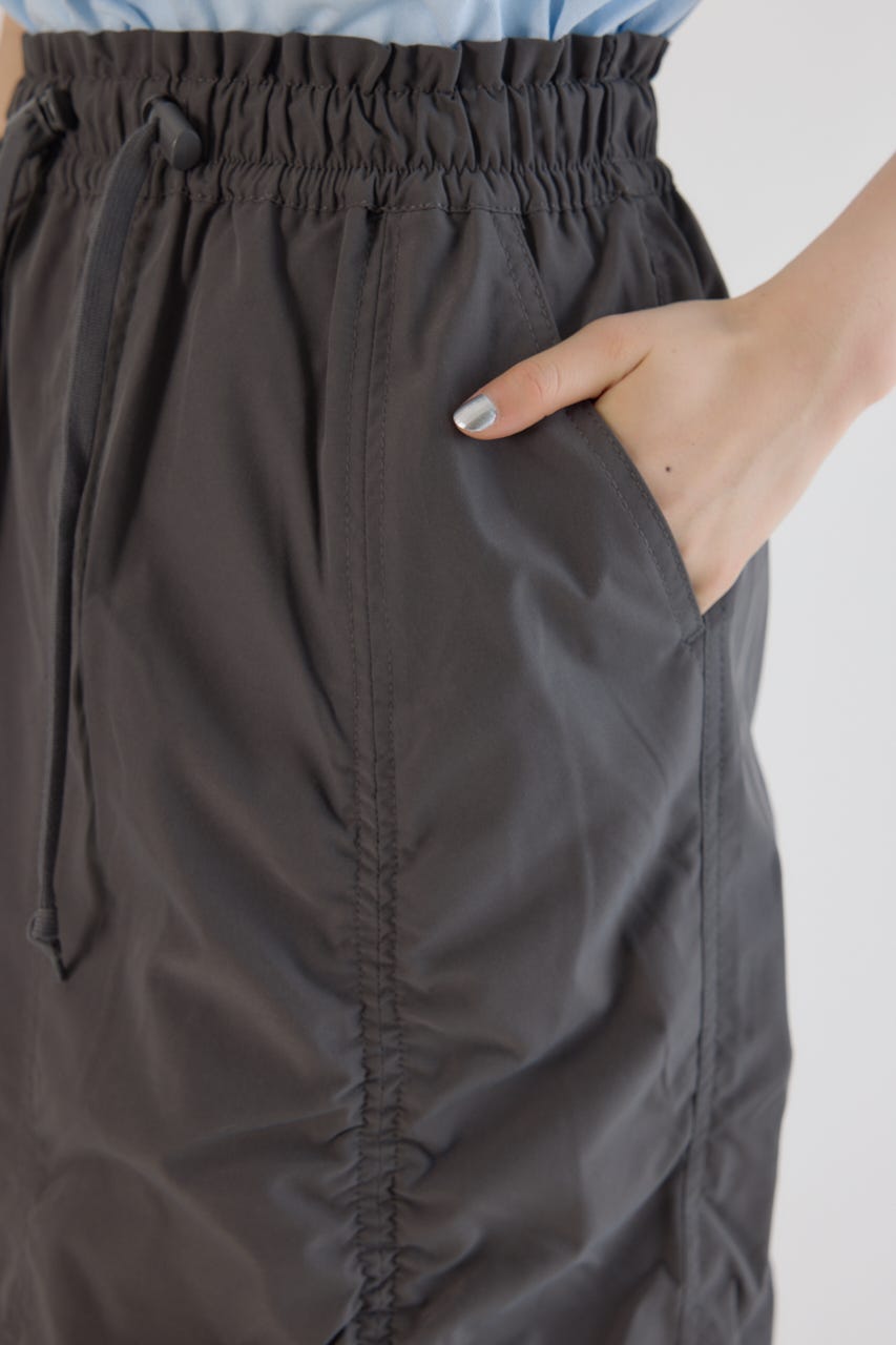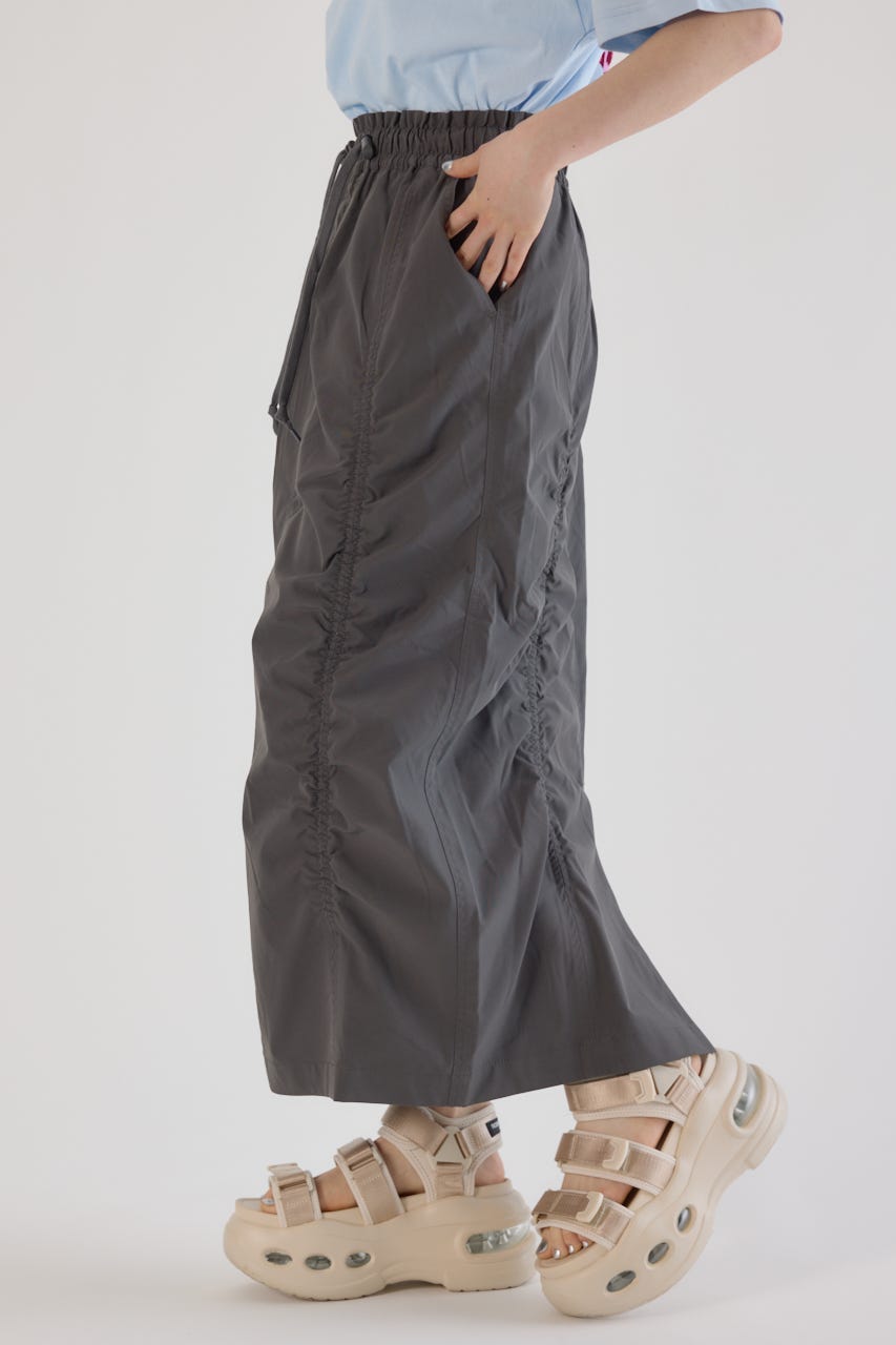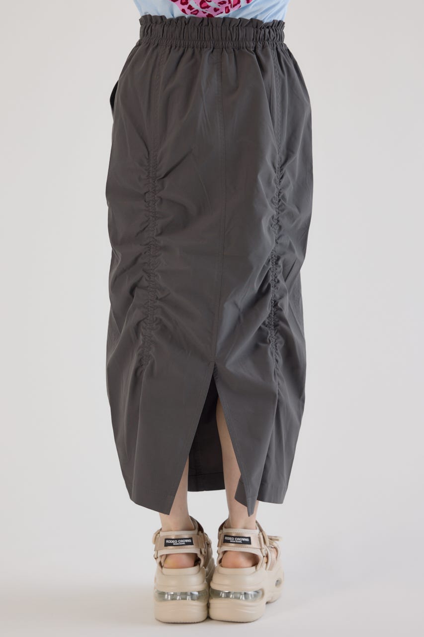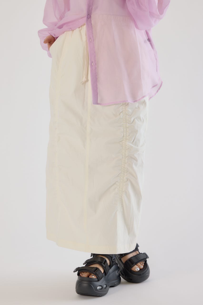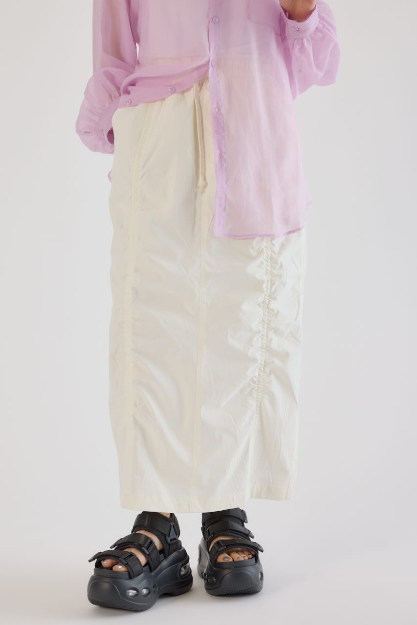フロントとバックにシャーリングを効かせたデザインが目を惹くスカート。