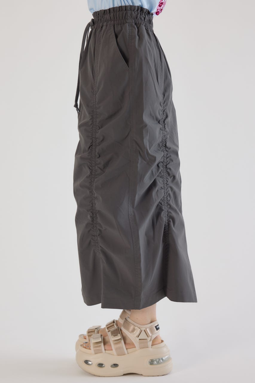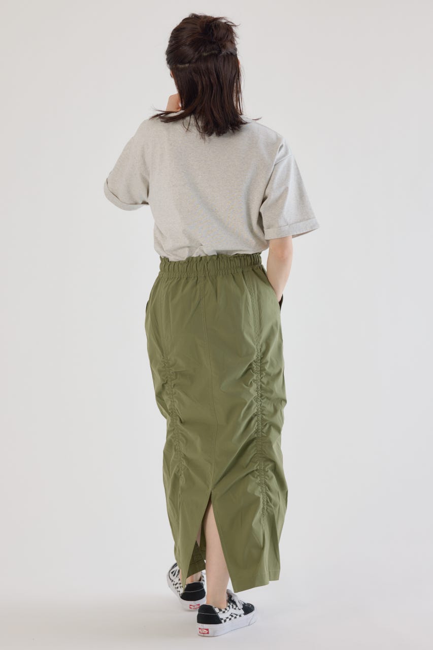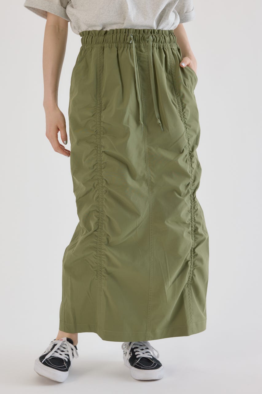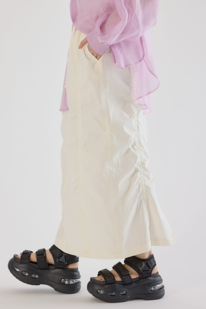 フロントとバックにシャーリングを効かせたデザインが目を惹くスカート。