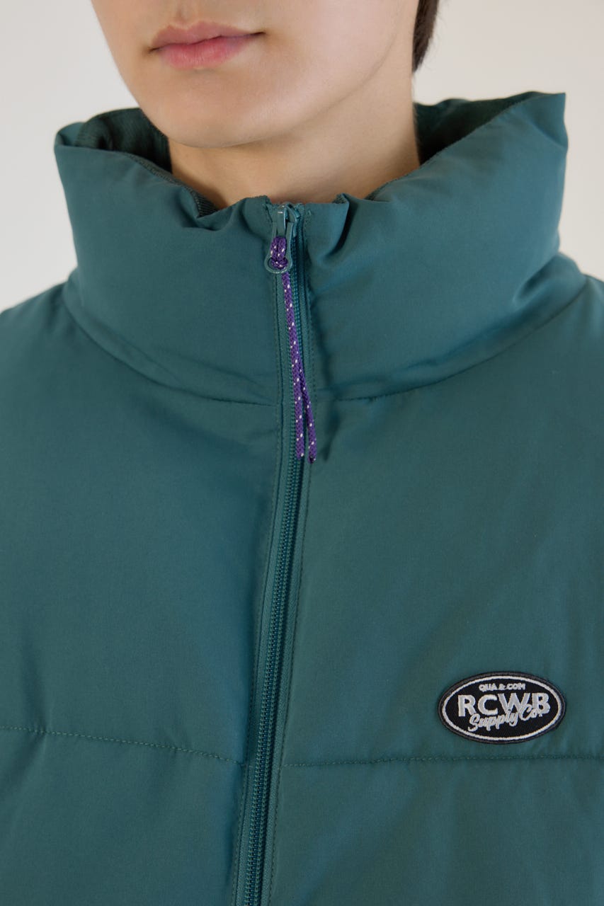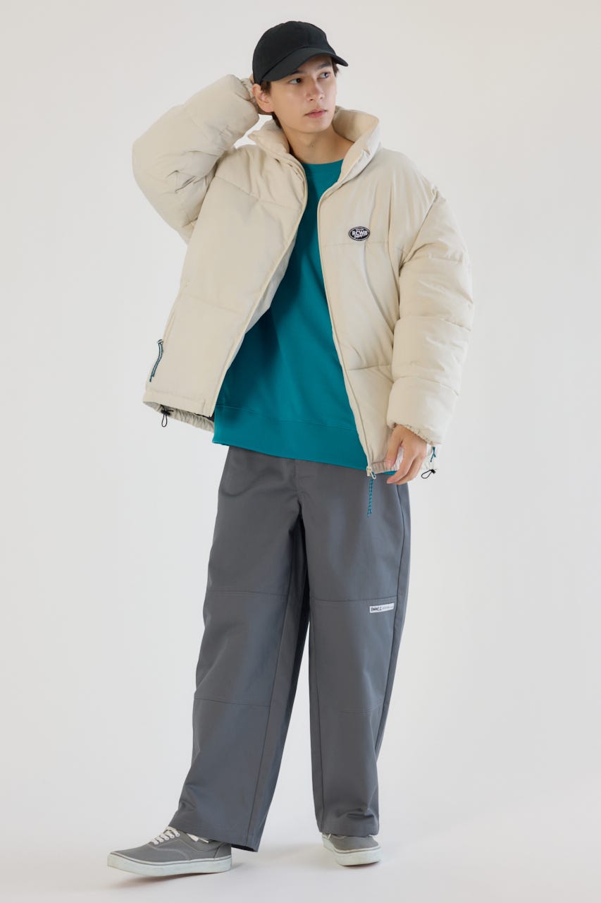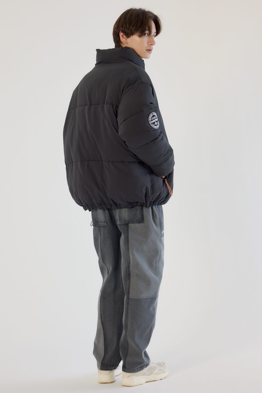 シンプルなスタイルにワッペンデザインを施し、ZIPの引き手にアクセントを持たせた着回しやすい中綿アウター。