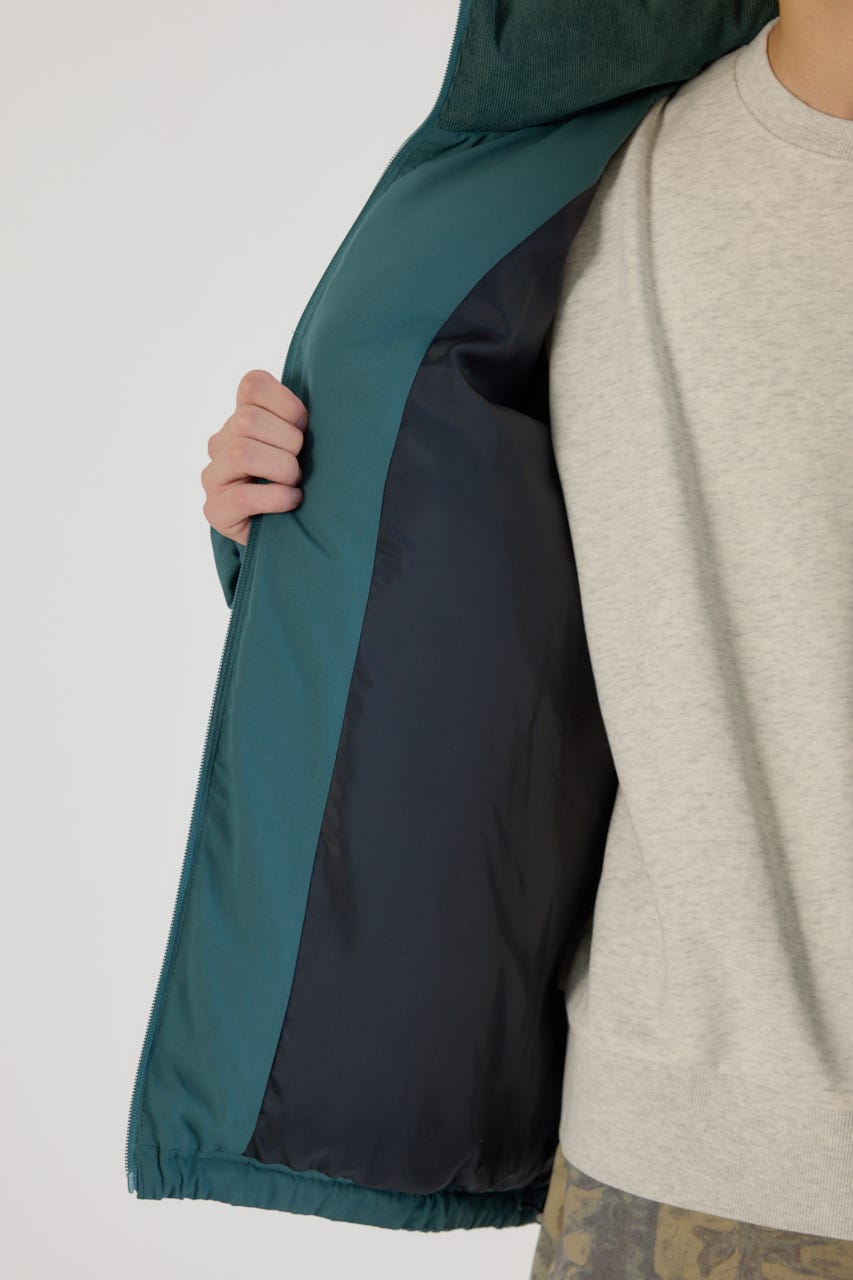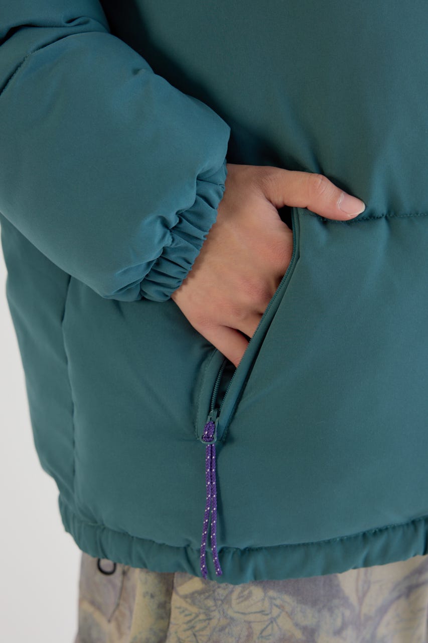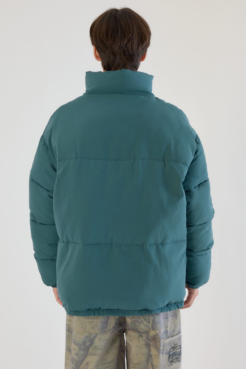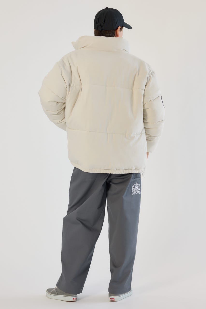 シンプルなスタイルにワッペンデザインを施し、ZIPの引き手にアクセントを持たせた着回しやすい中綿アウター。