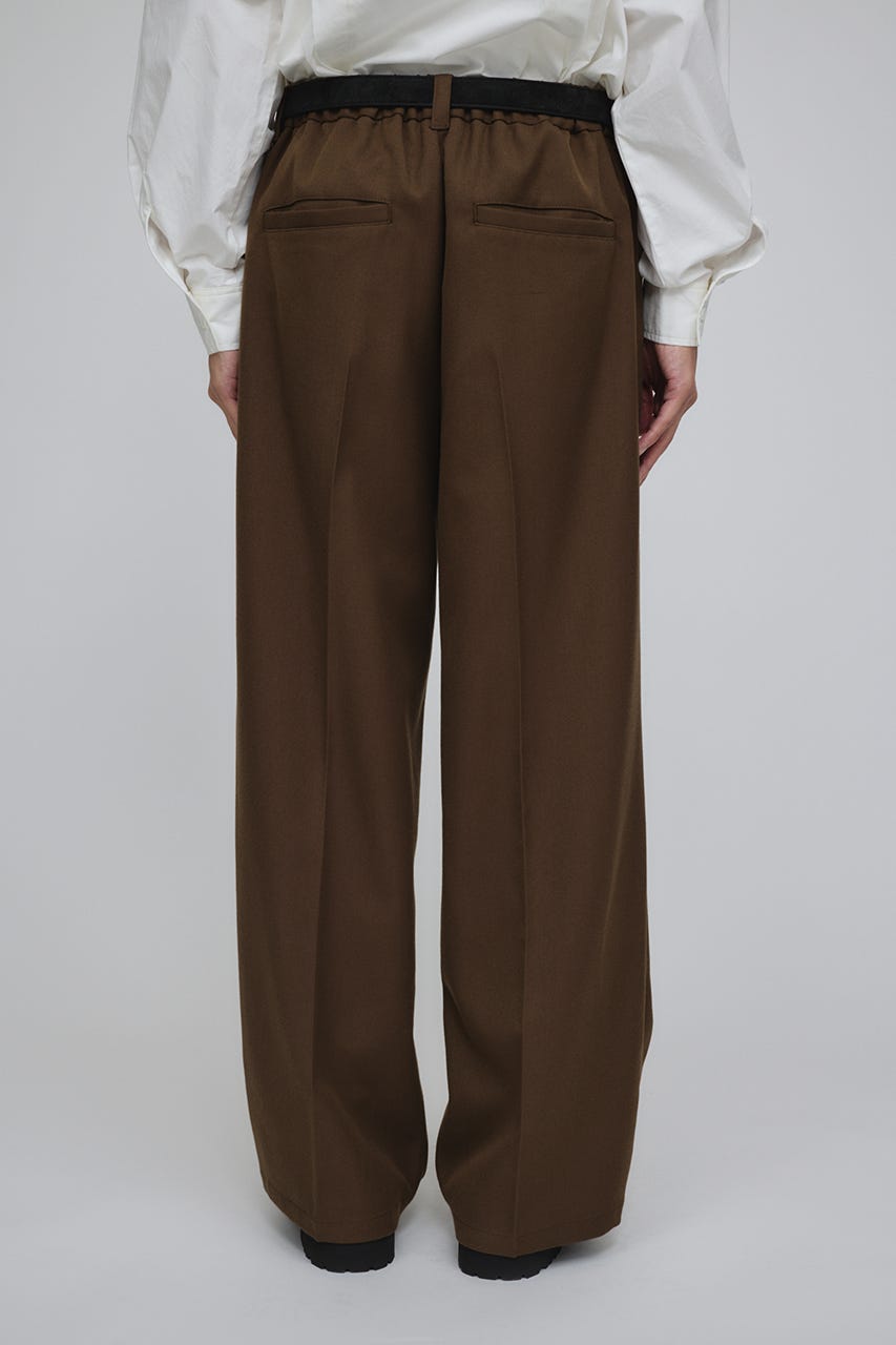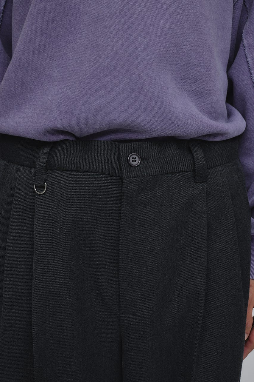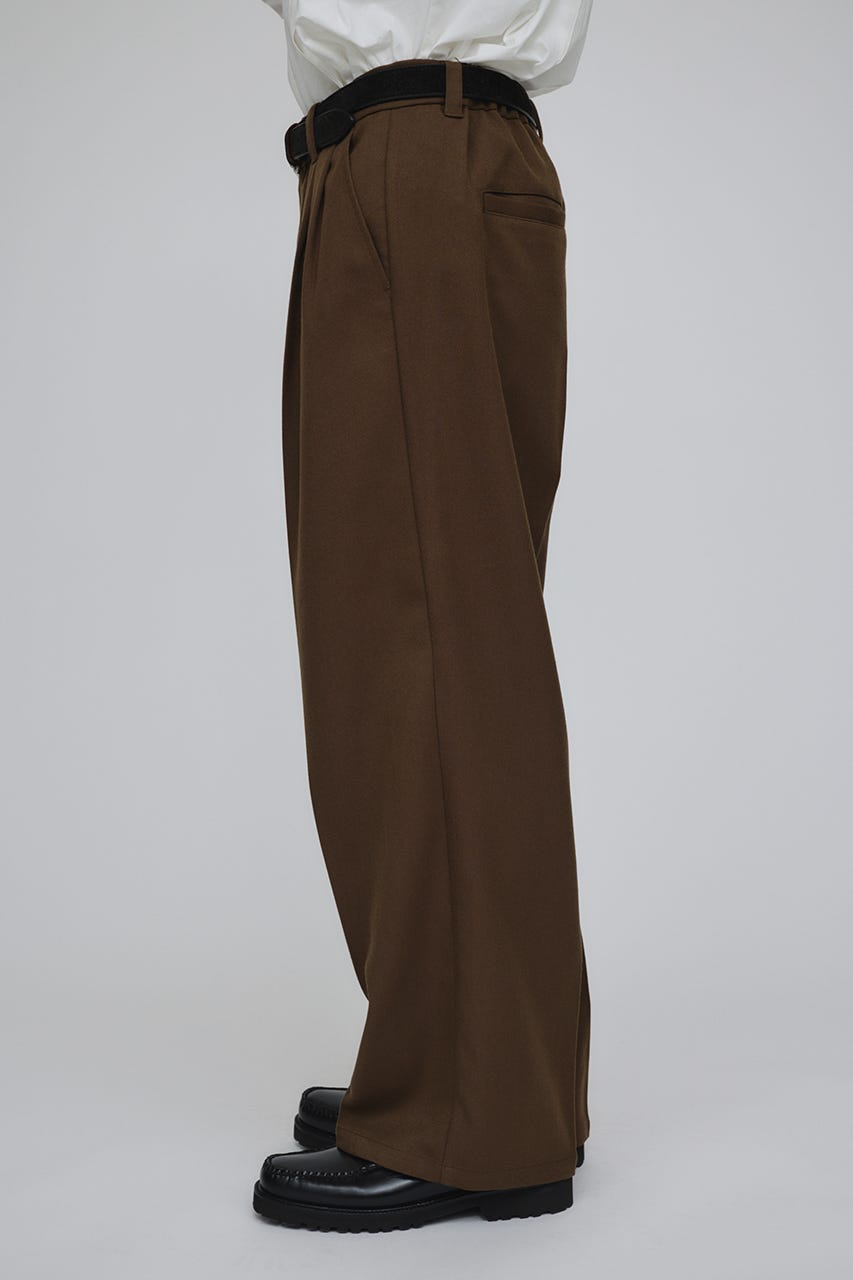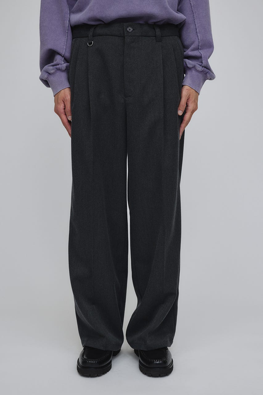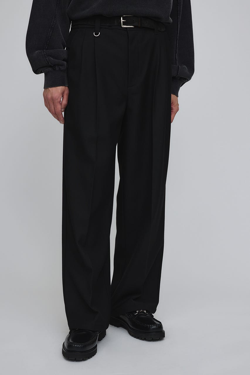 ウォーム感のあるTRツイルを使用したクリーンな表面感でしわになりにくく、落ち感のあるワイドトラウザー。