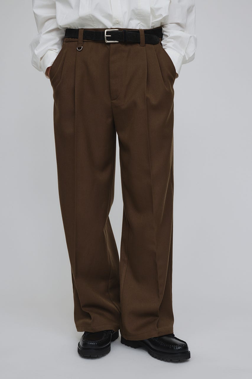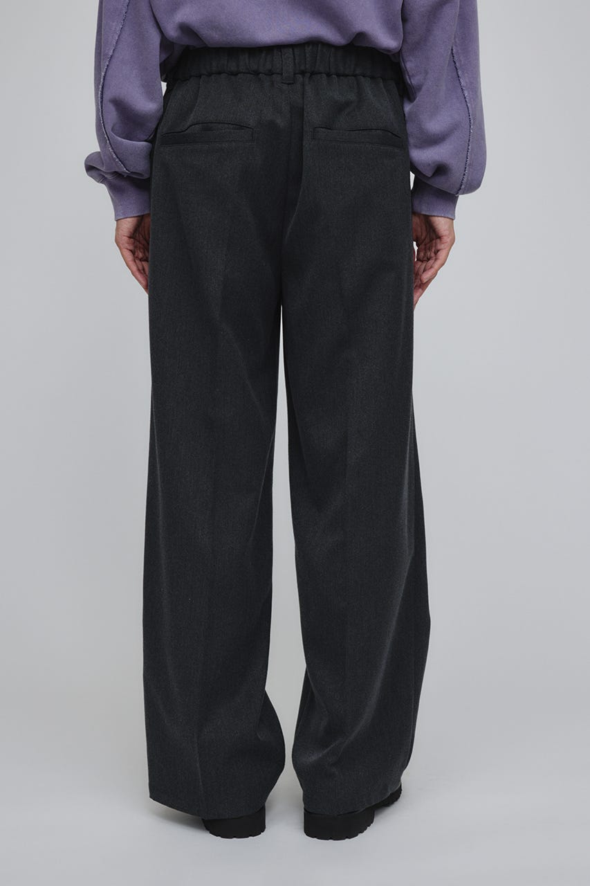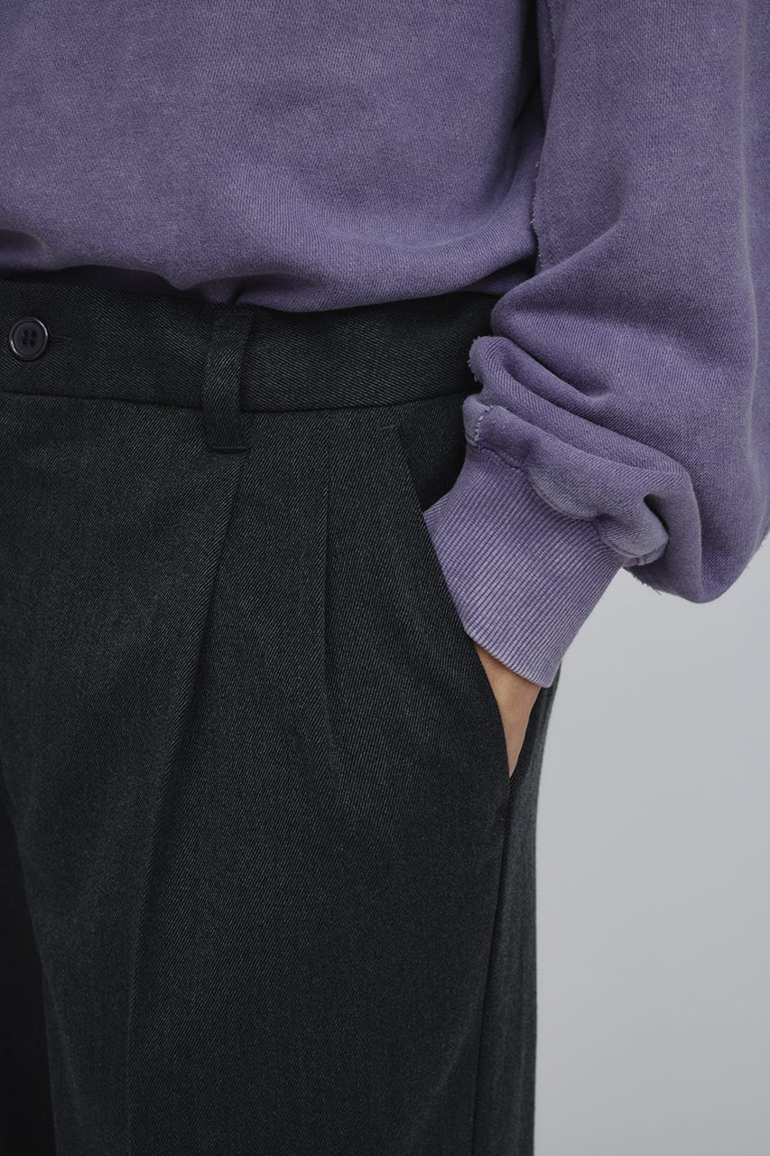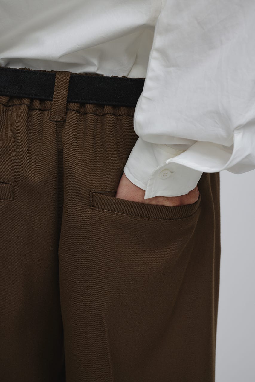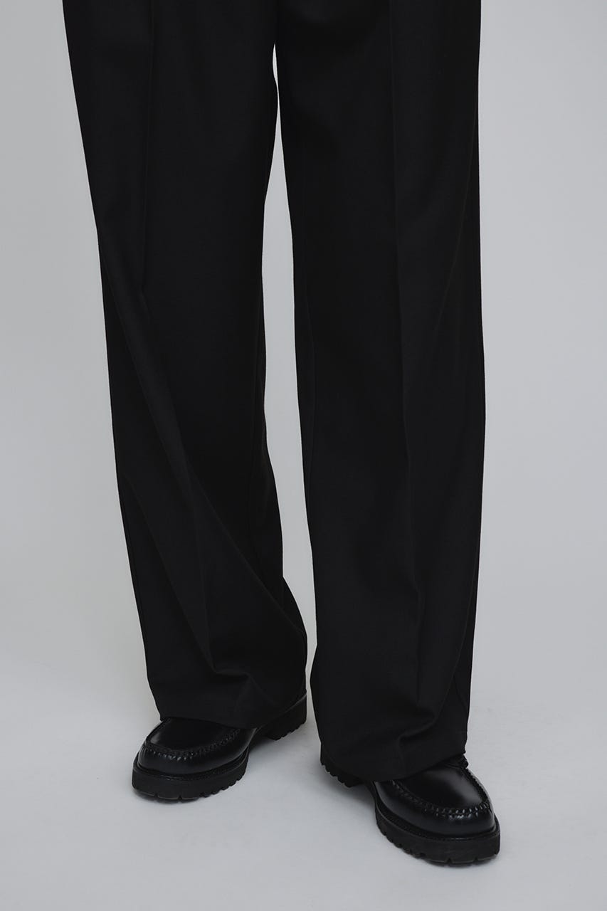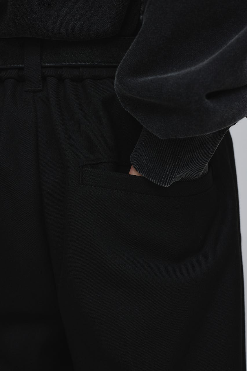 ウォーム感のあるTRツイルを使用したクリーンな表面感でしわになりにくく、落ち感のあるワイドトラウザー。