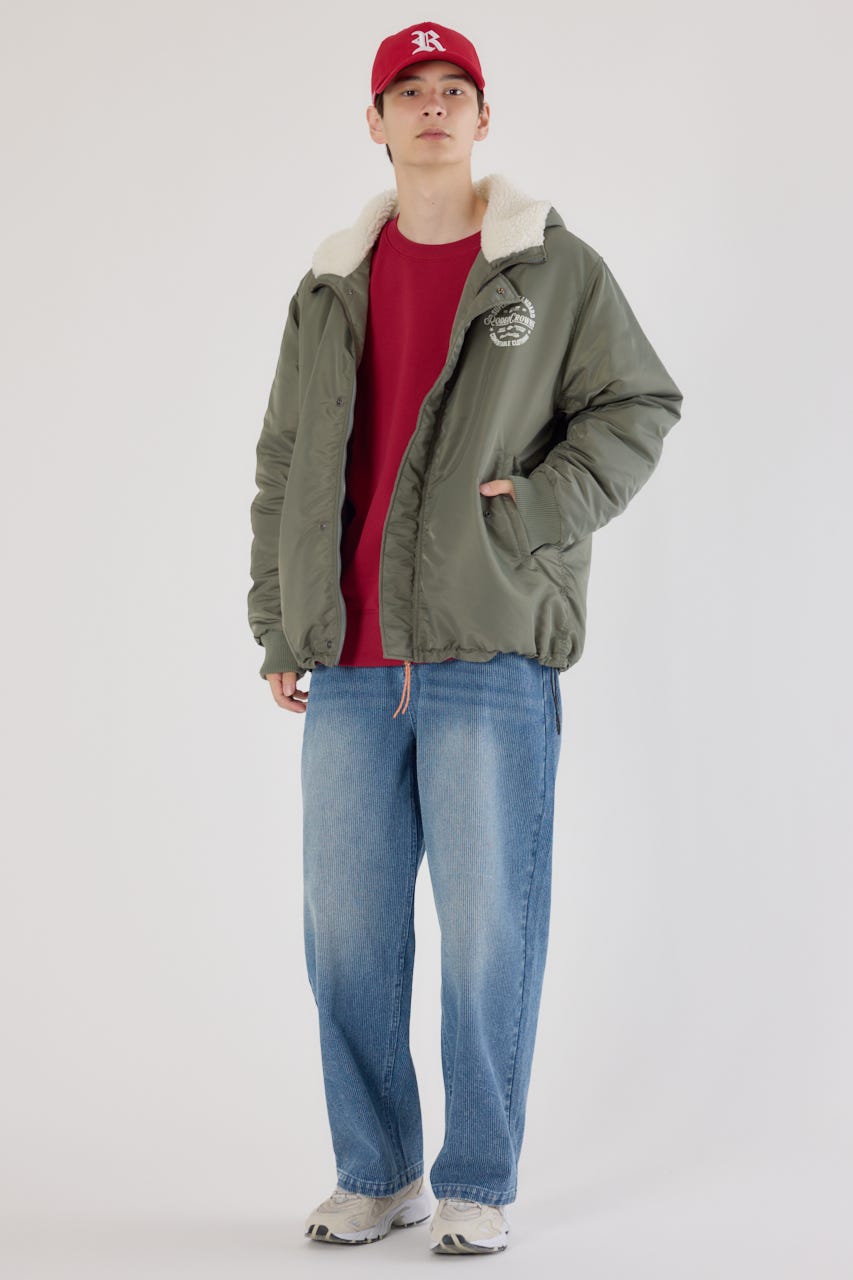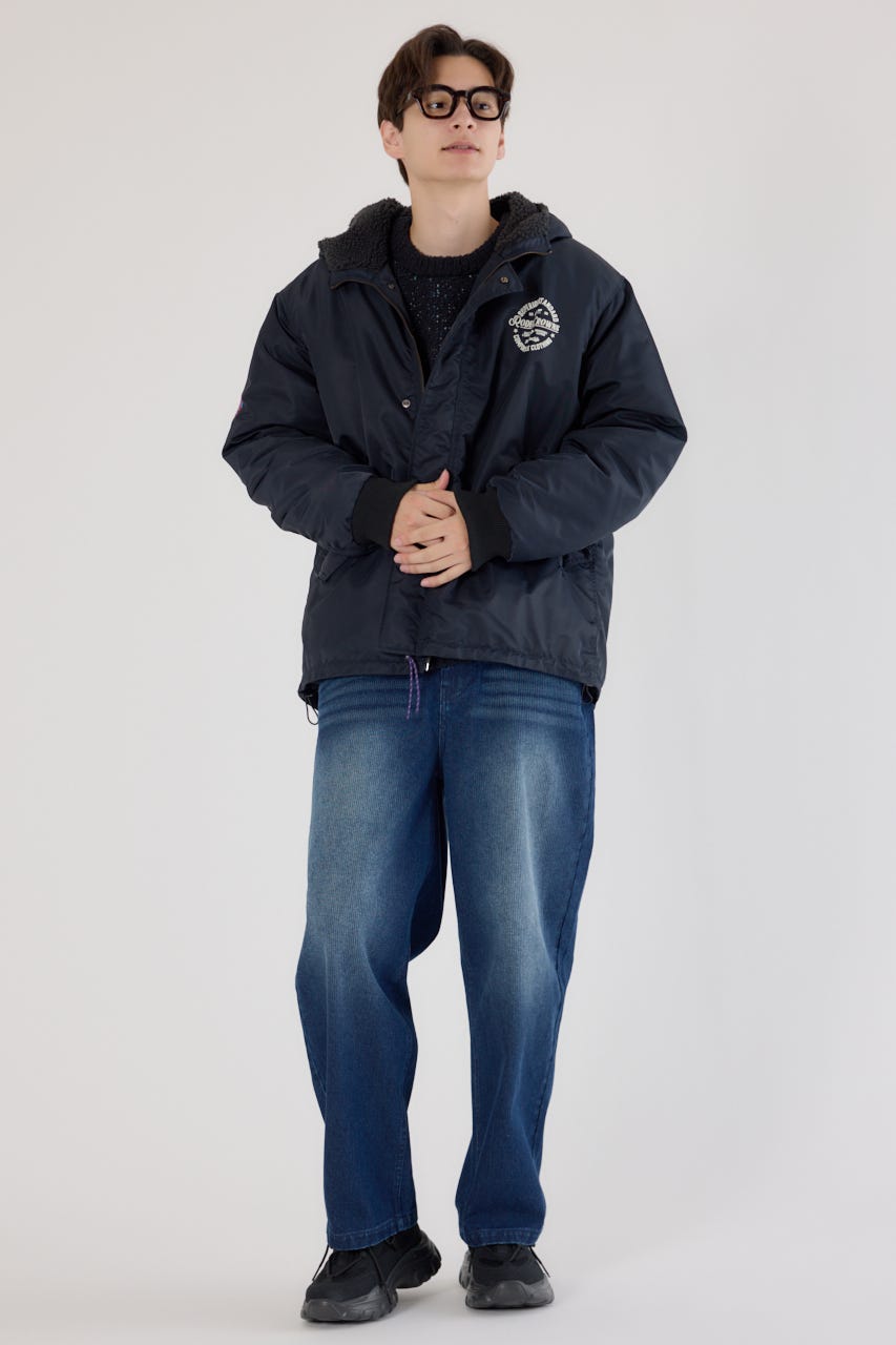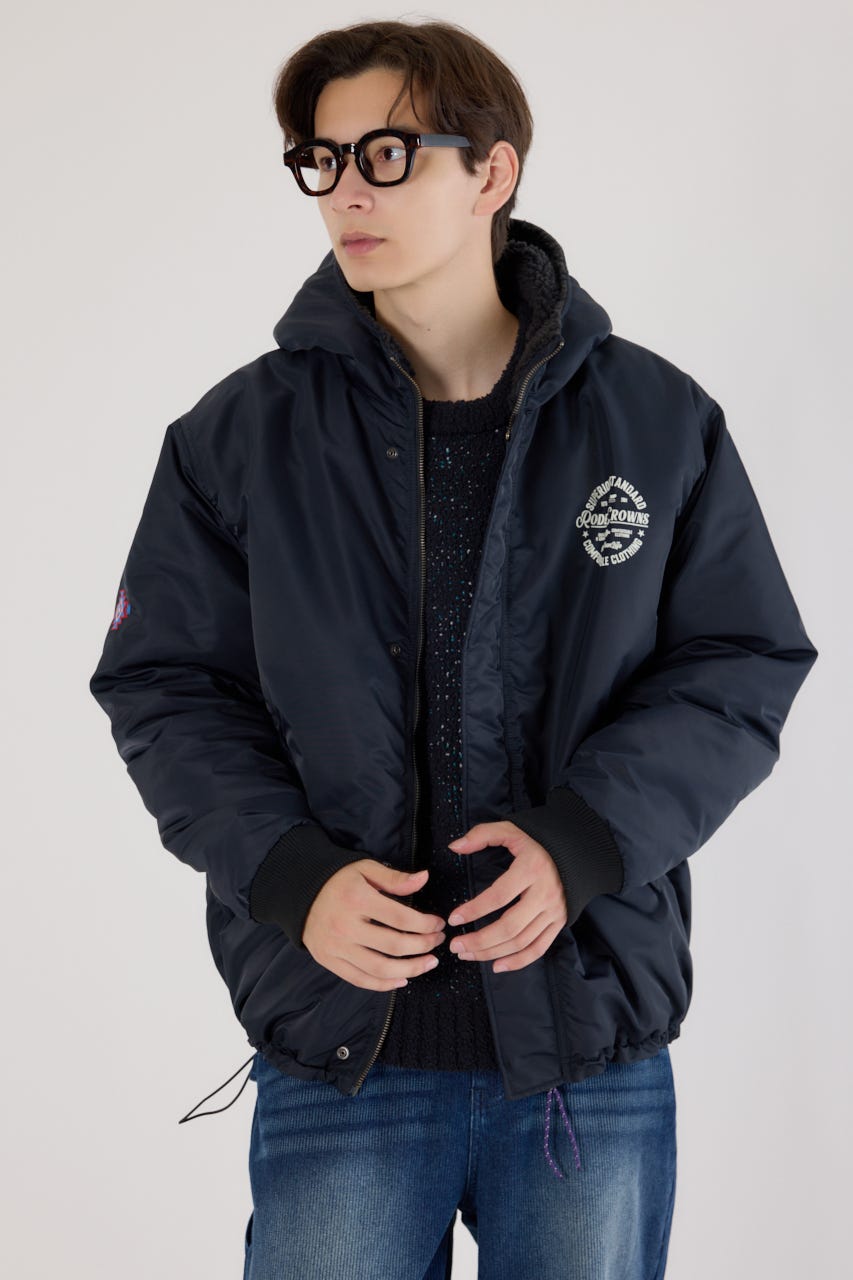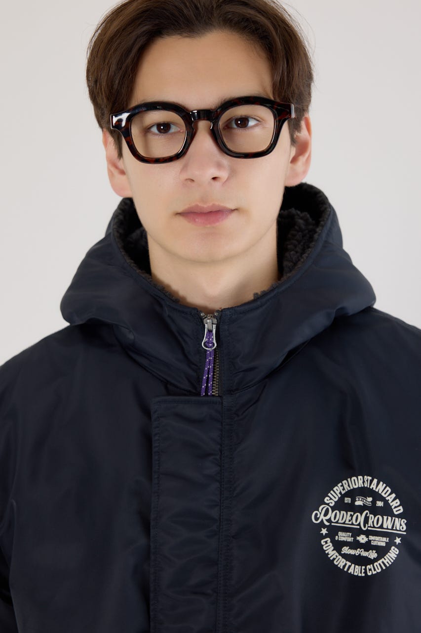 フード内のボアやカラースピンドルなどでアクセントを作り、バックスタイルの大胆な刺繍ロゴがポイントになっています。