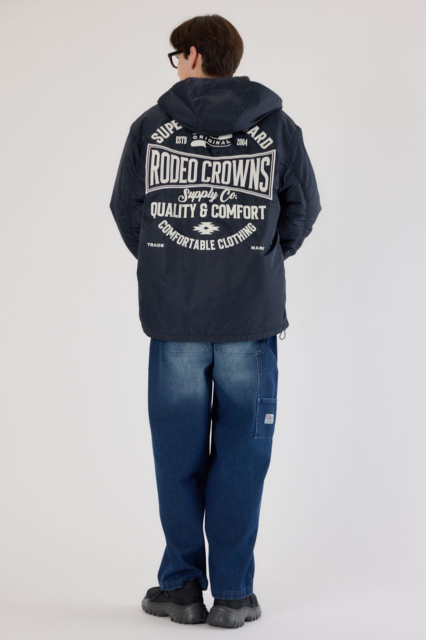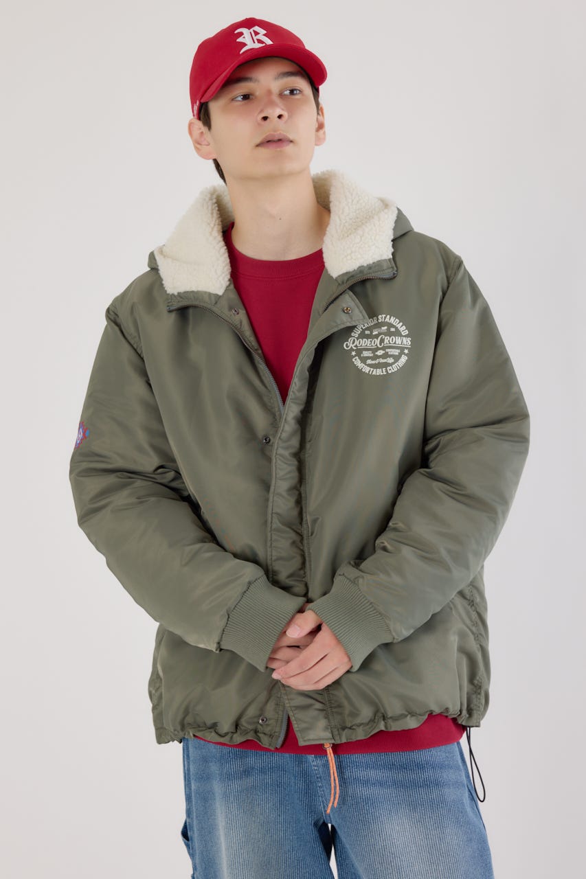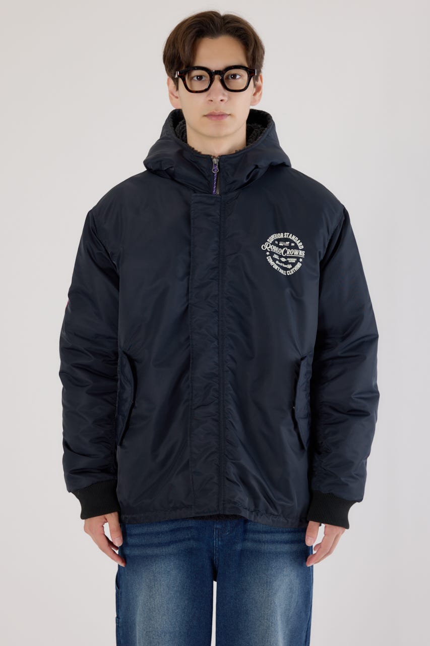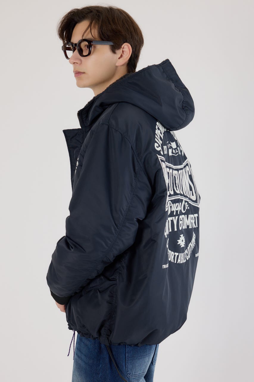 フード内のボアやカラースピンドルなどでアクセントを作り、バックスタイルの大胆な刺繍ロゴがポイントになっています。