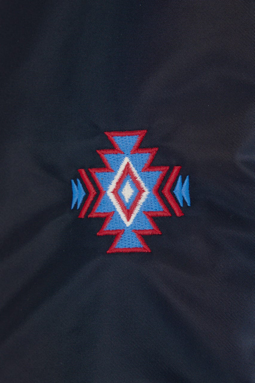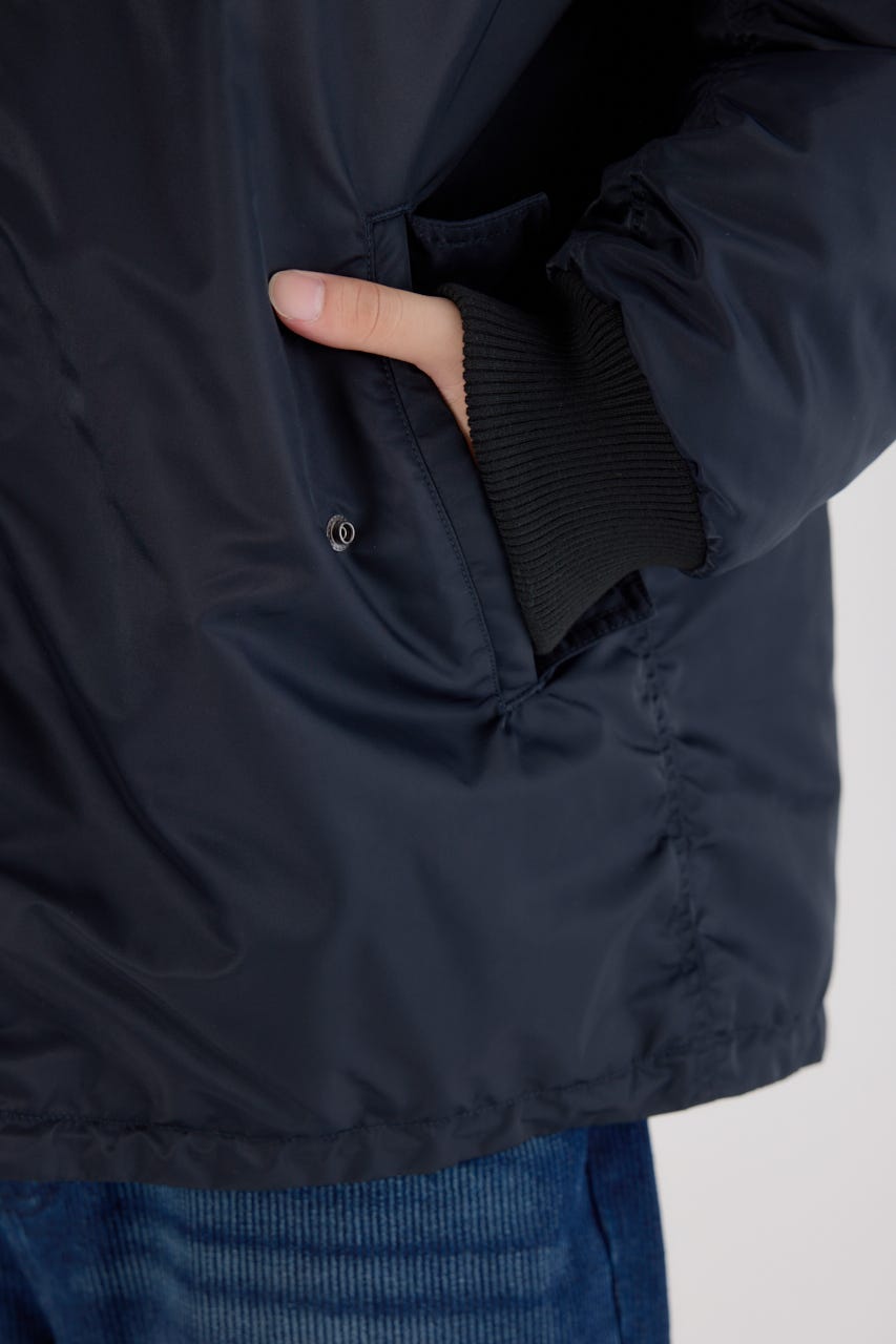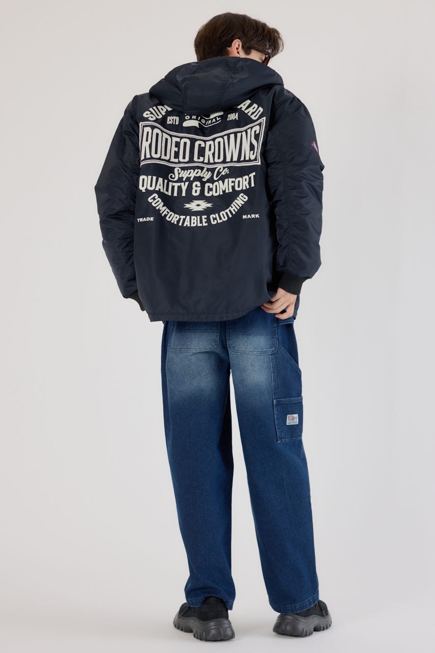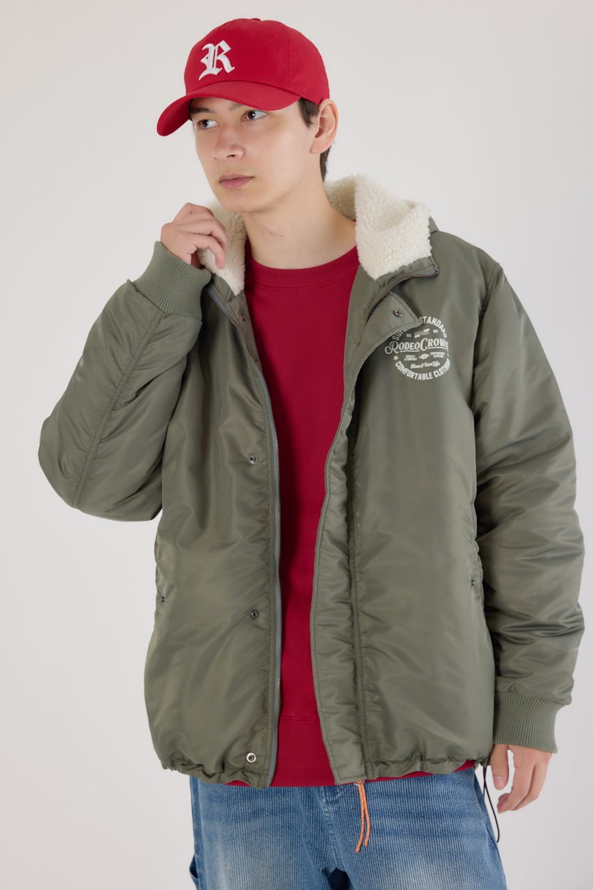 フード内のボアやカラースピンドルなどでアクセントを作り、バックスタイルの大胆な刺繍ロゴがポイントになっています。