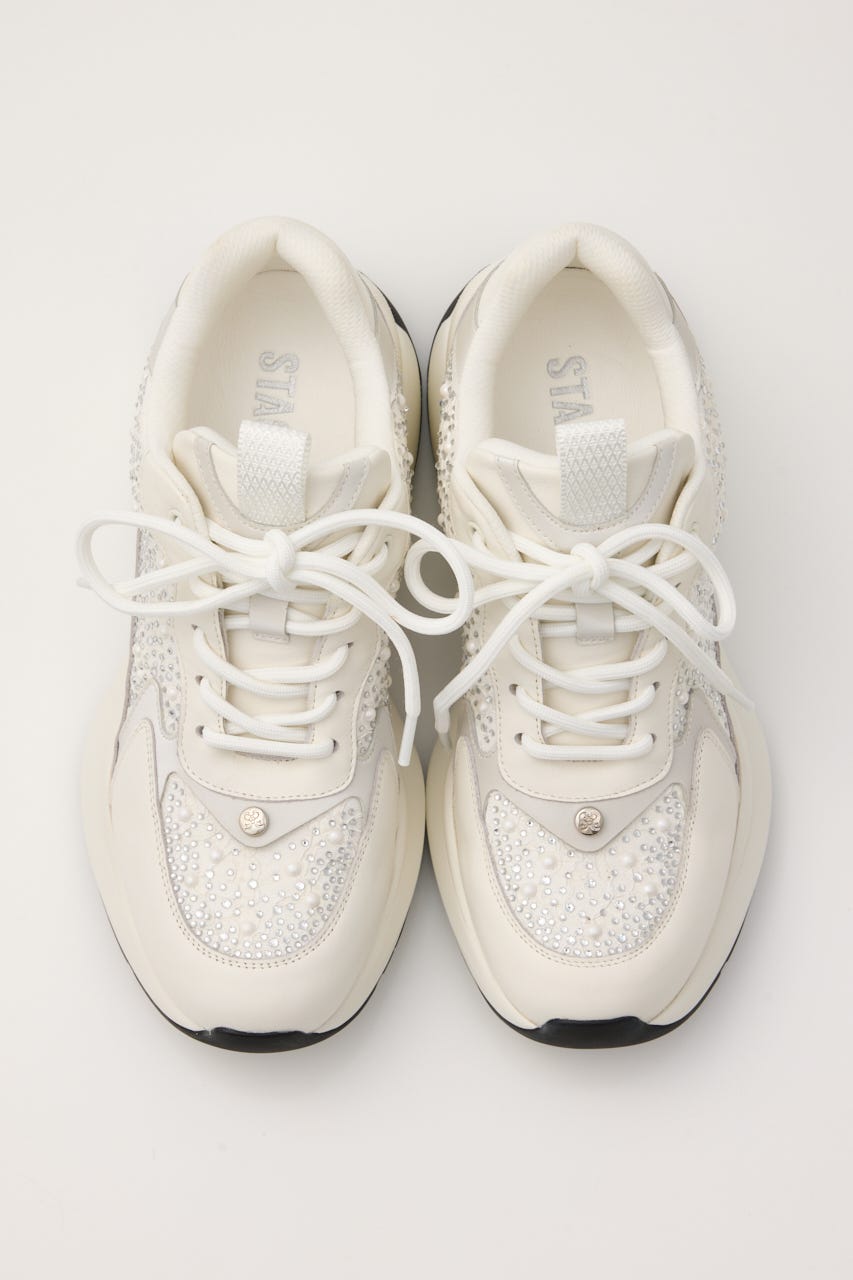 STACCATOらしい異素材コンビのハイヒールスニーカー。スポーティーな見た目のスニーカーにパール×ストーン装飾をした細かなデザインに個性が光る1足。『WHT』はレース地に装飾、『BLK』はツイード地に装飾された足元が華やかになる凝ったデザインです。