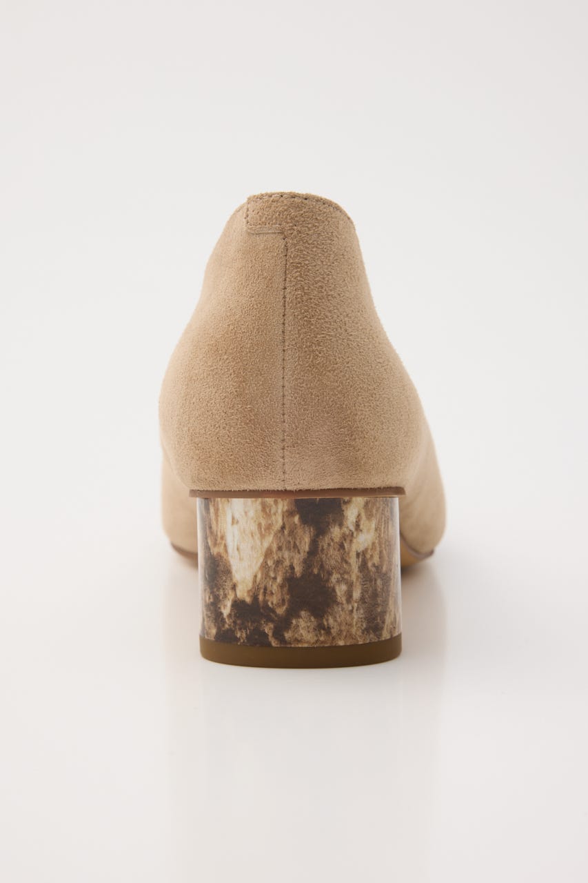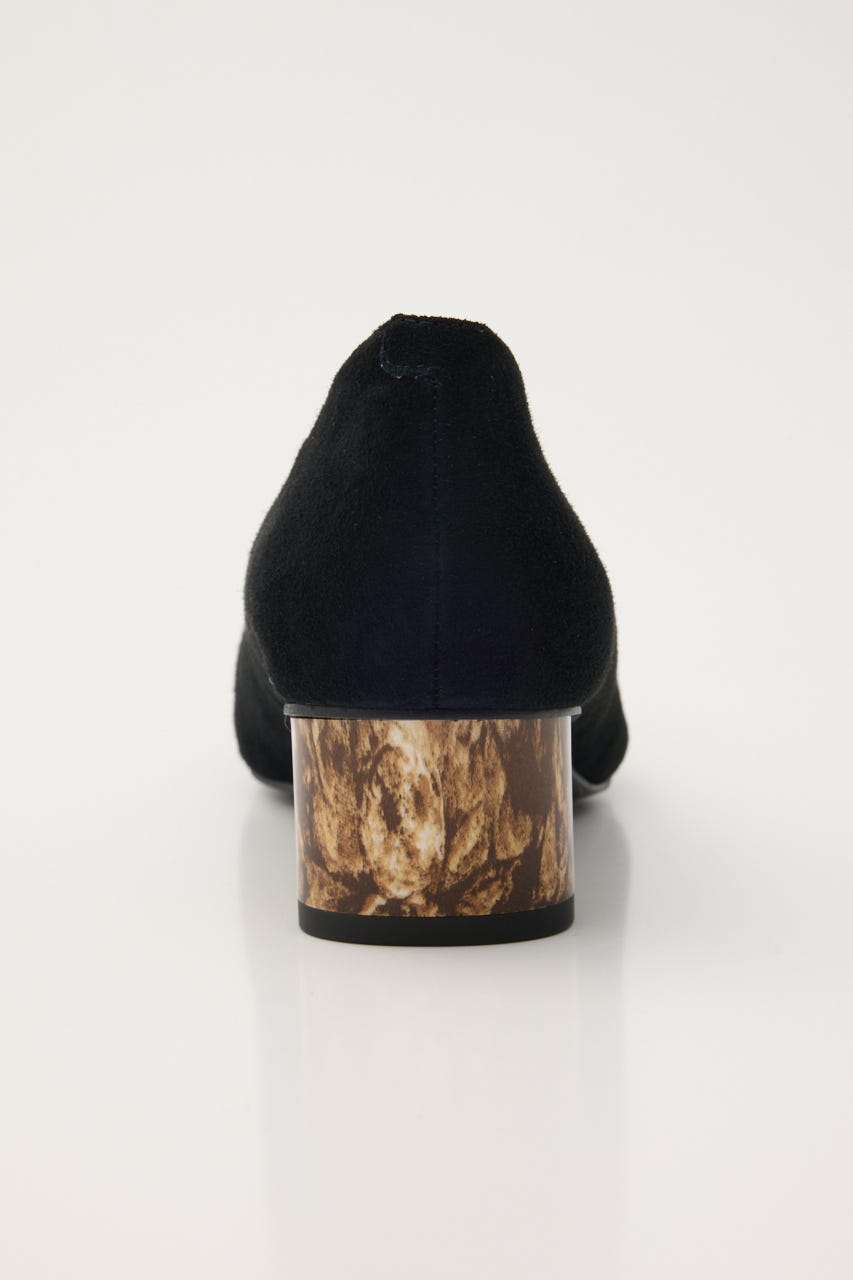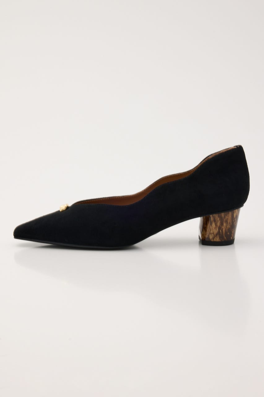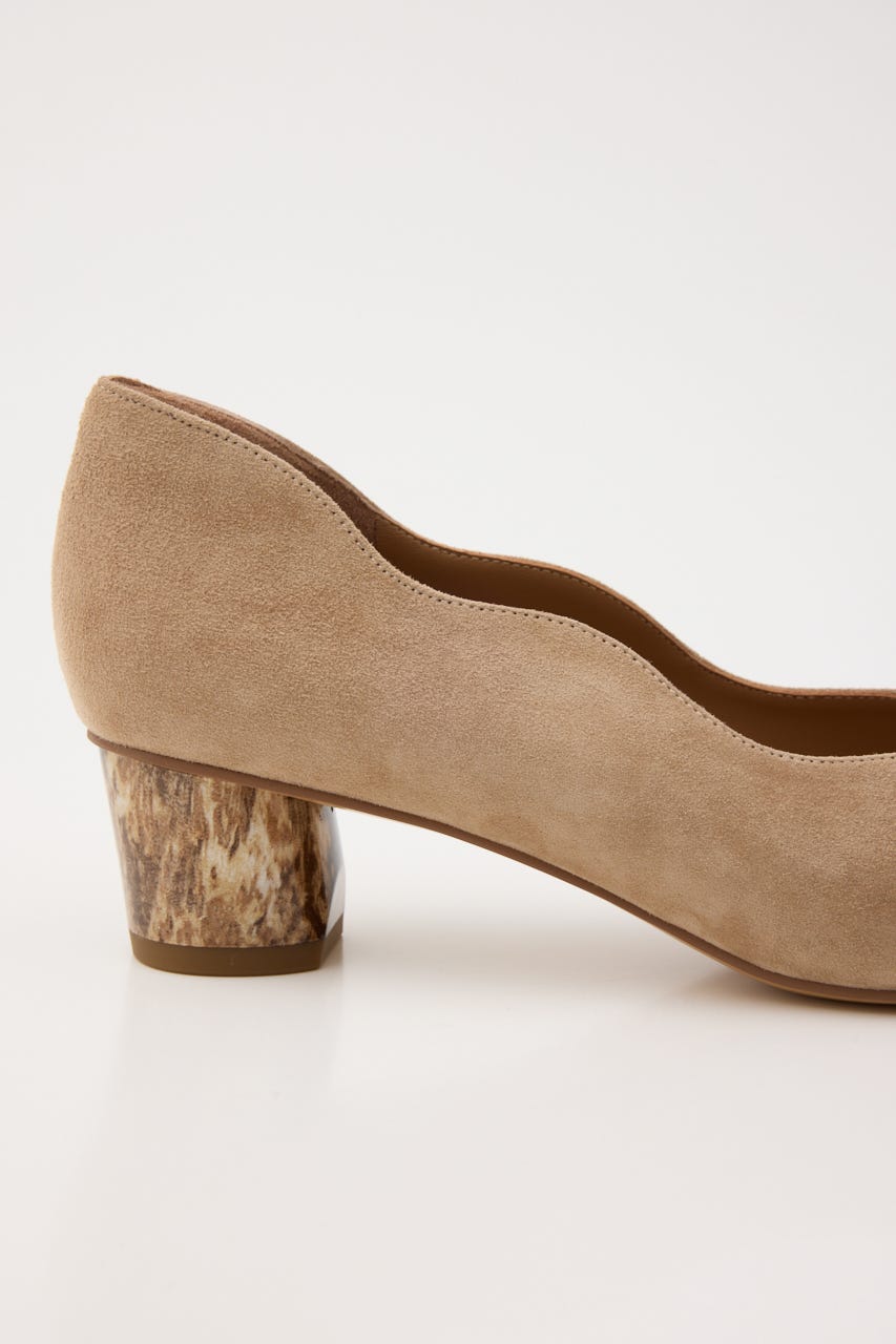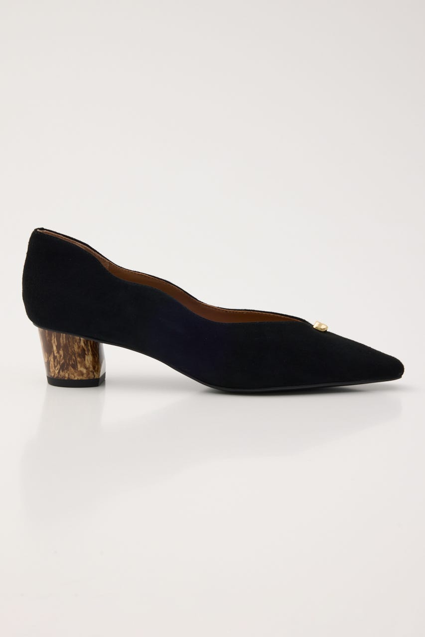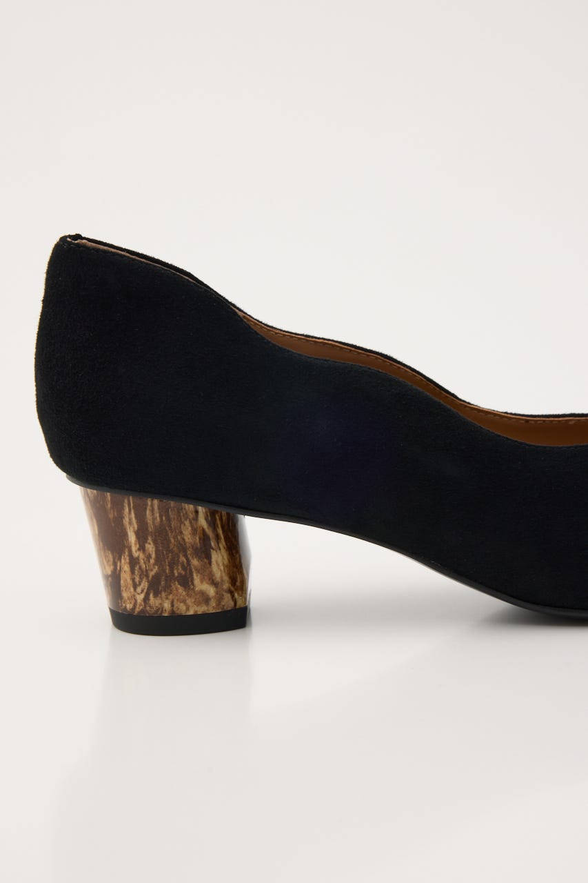レトロムード漂う、感度高めなデザインがきいたシューティー。履き口部分は可憐な印象のスカラップデザインにゴールドのビーンズもポイント。バックスタイルにもぬかりないマーブル柄のブロックヒールが安定感とコーディネートのアクセントに。エレガンはもちろんのことカジュアルなスタイルでもおしゃれかつレディらしいスタイルに格上げしてくれます。