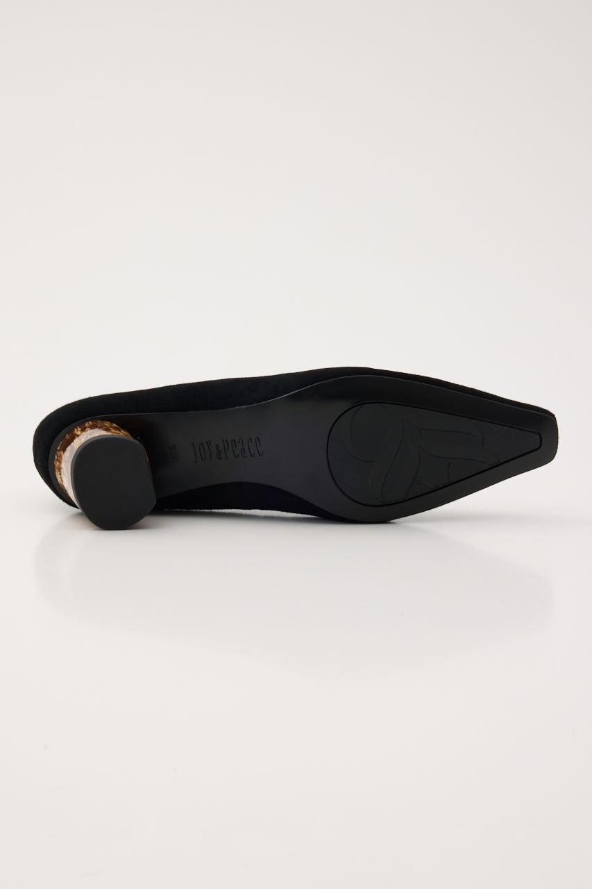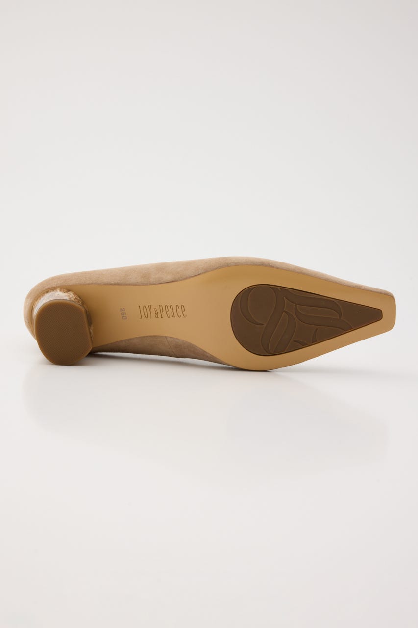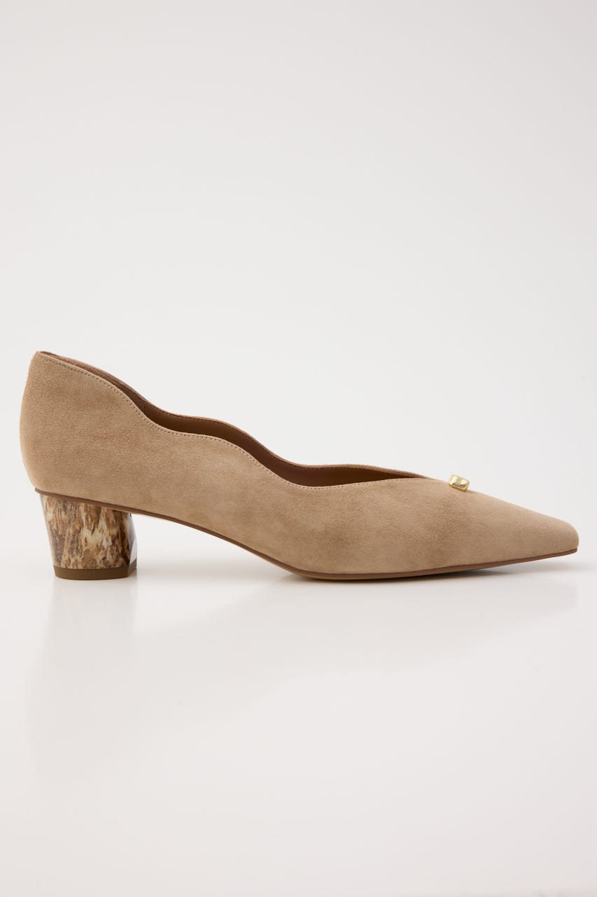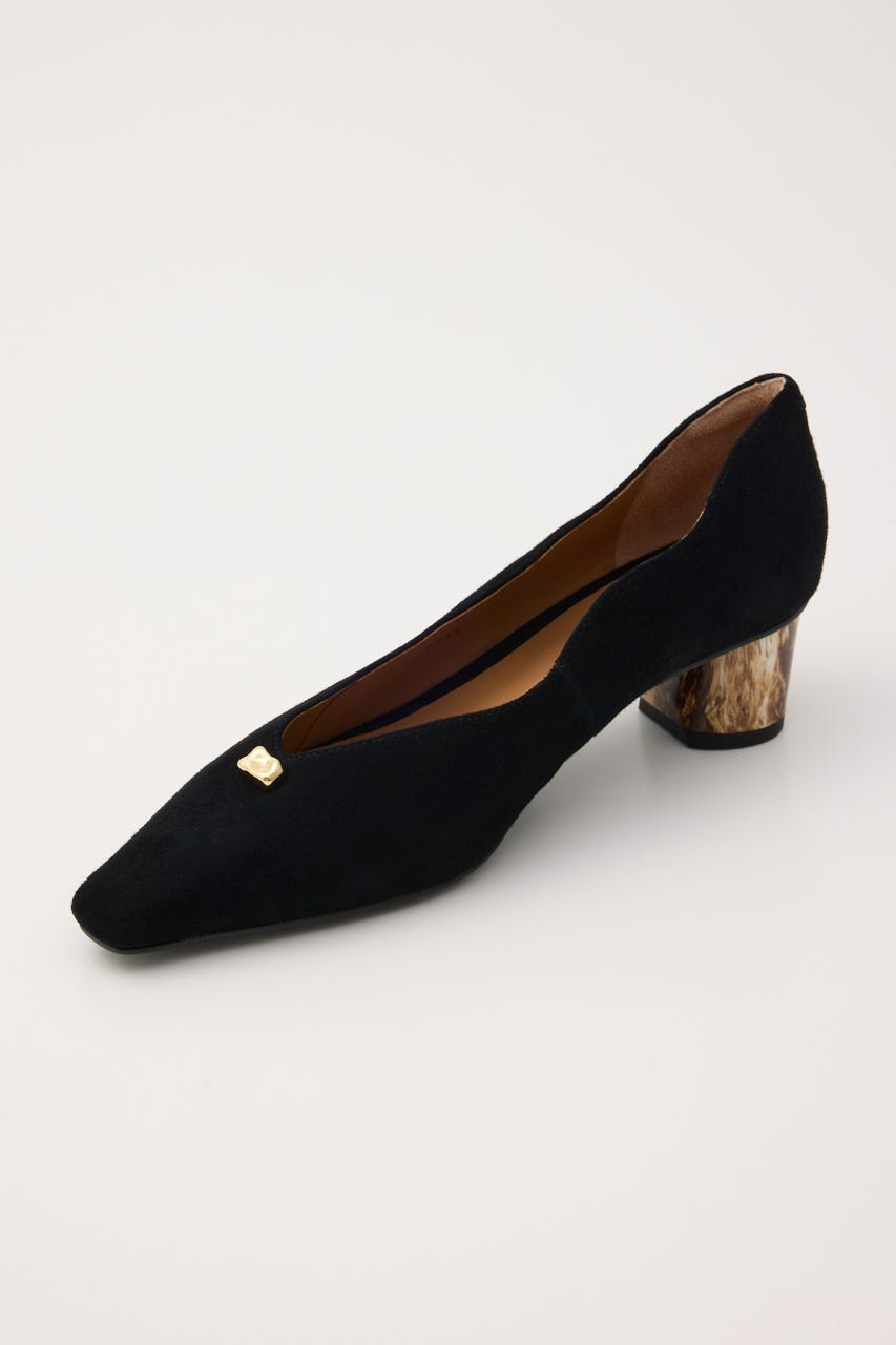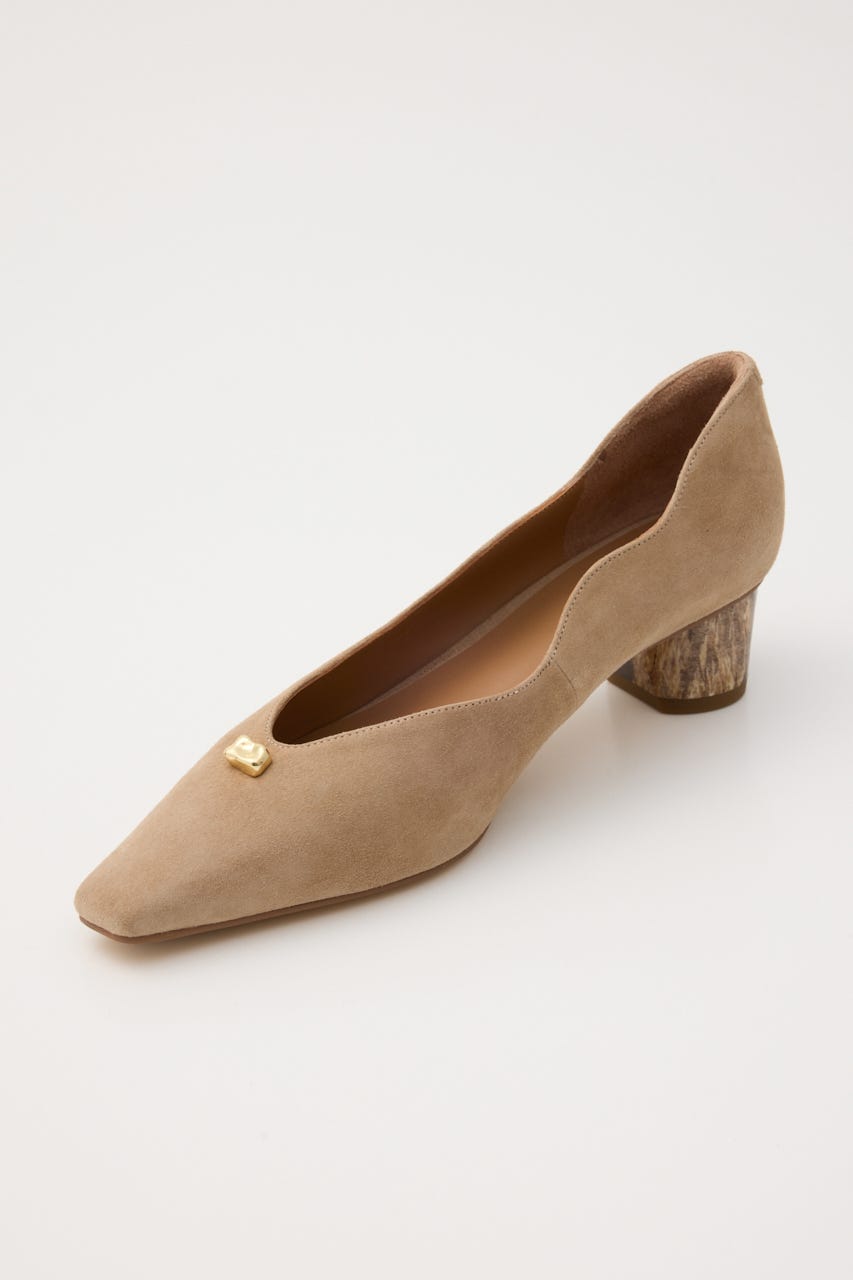 レトロムード漂う、感度高めなデザインがきいたシューティー。履き口部分は可憐な印象のスカラップデザインにゴールドのビーンズもポイント。バックスタイルにもぬかりないマーブル柄のブロックヒールが安定感とコーディネートのアクセントに。エレガンはもちろんのことカジュアルなスタイルでもおしゃれかつレディらしいスタイルに格上げしてくれます。