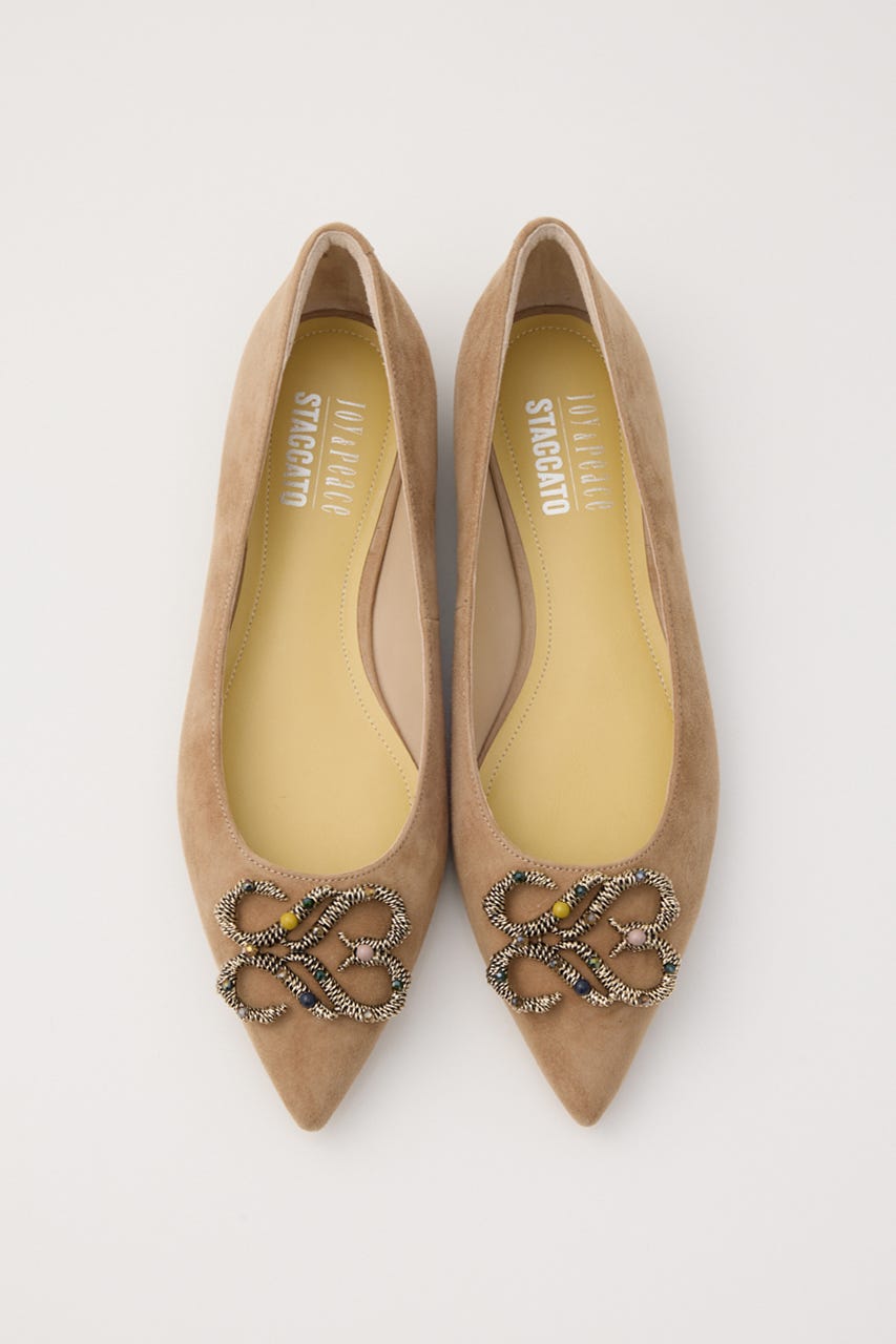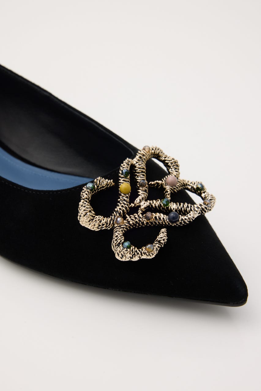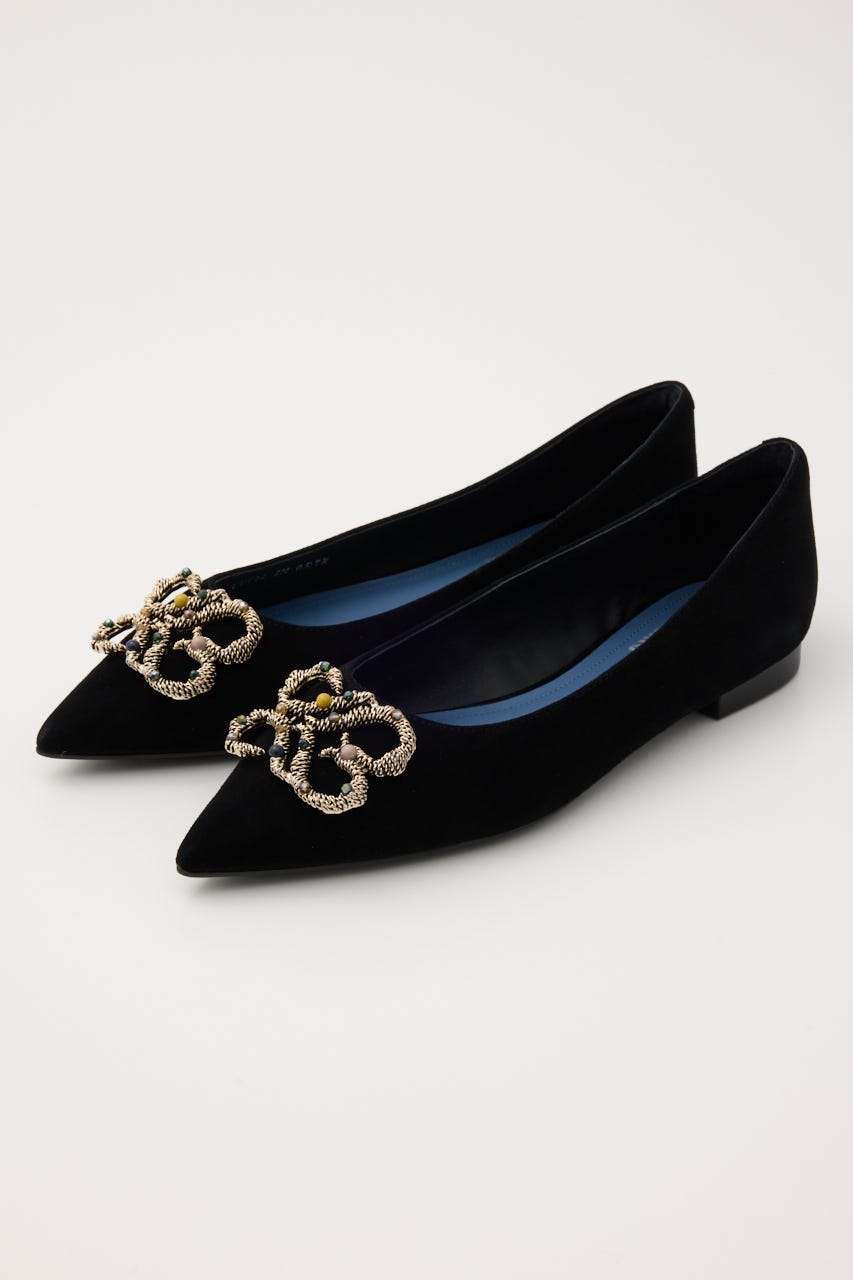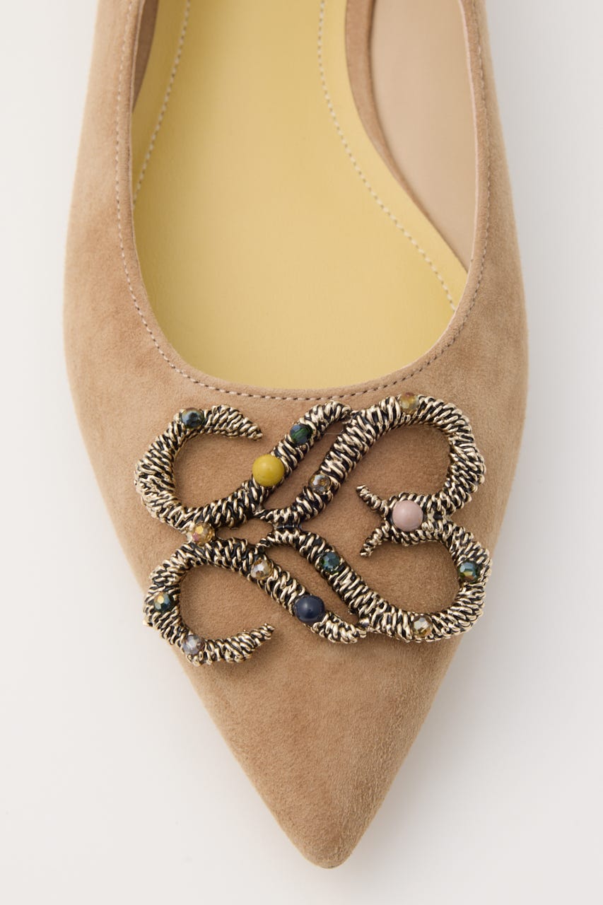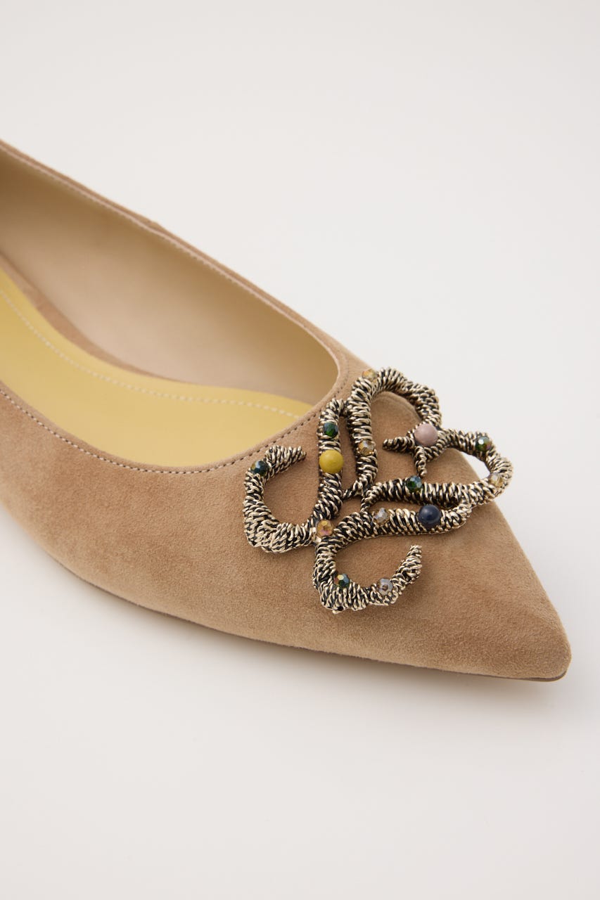 個性が光る、ブローチのようなアーティスティックなオリジナルバックルにカラフルなビーズを散りばめたカッターパンプス。綺麗目な装いにもカジュアルなスタイルにも合わせやすい、スタイリングの幅が広がる1足です。