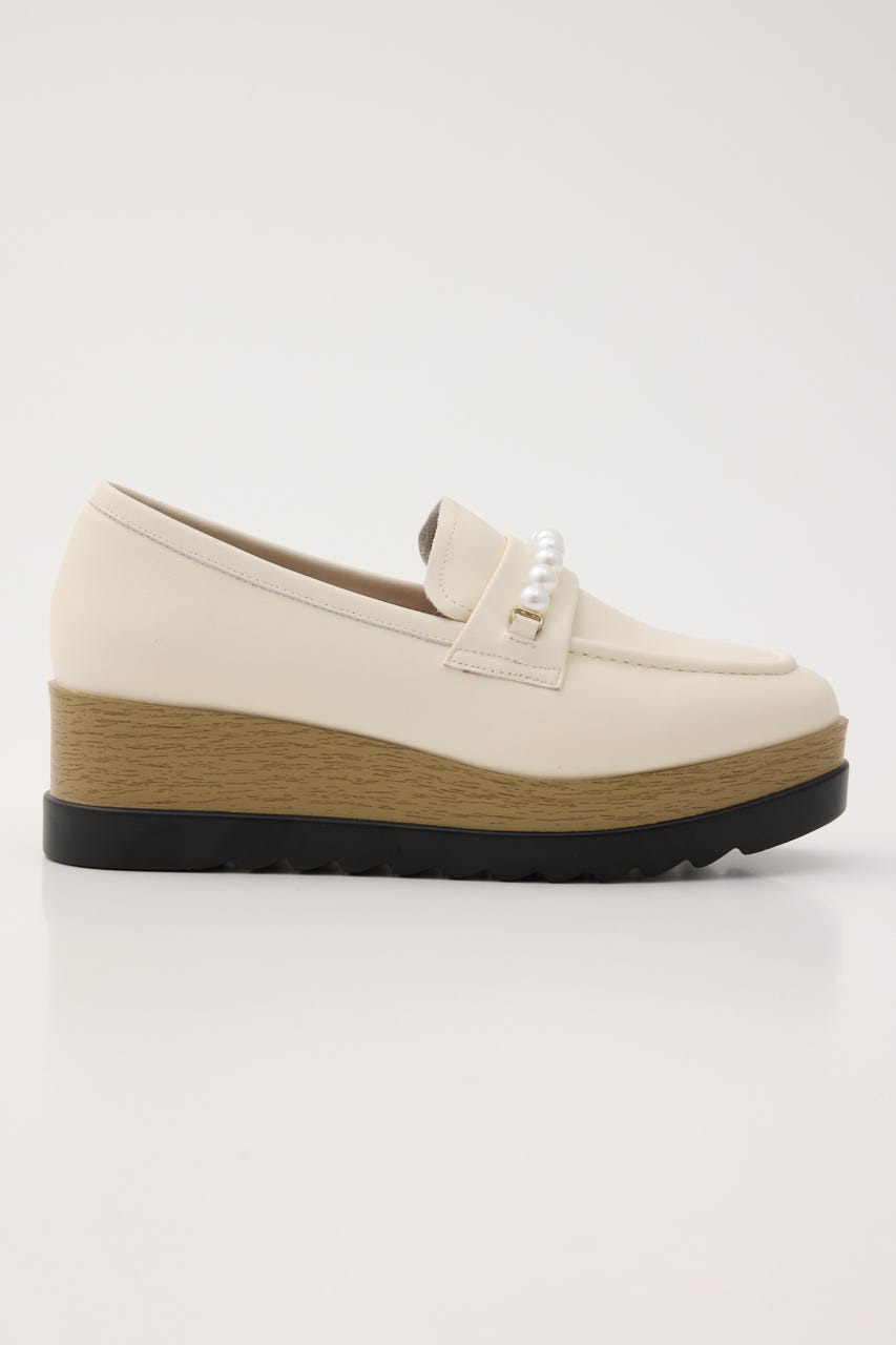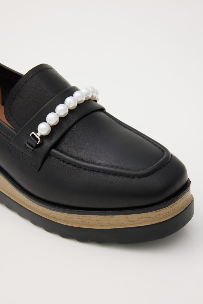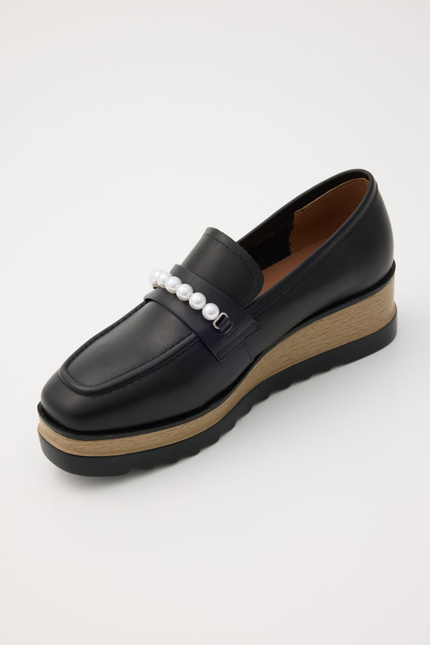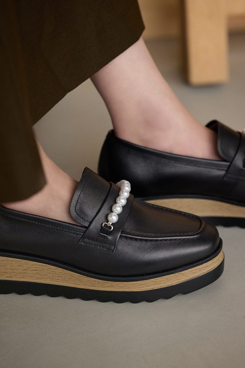 シーズンレスで大活躍してくれる、大人気の厚底シューズにお声の多かった待望の黒ソールが新登場。ウッド調ウェッジ×ブラックのシャークソールがモードで落ち着いた印象に。さらに新デザインのミニマルなパールベルトがカジュアルに見えがちなプラットフォームシューズでも足元をエレガント・上品に魅せてくれる。ローファーデザインなのでスリッポンタイプで履けるのもうれしいポイントです。
