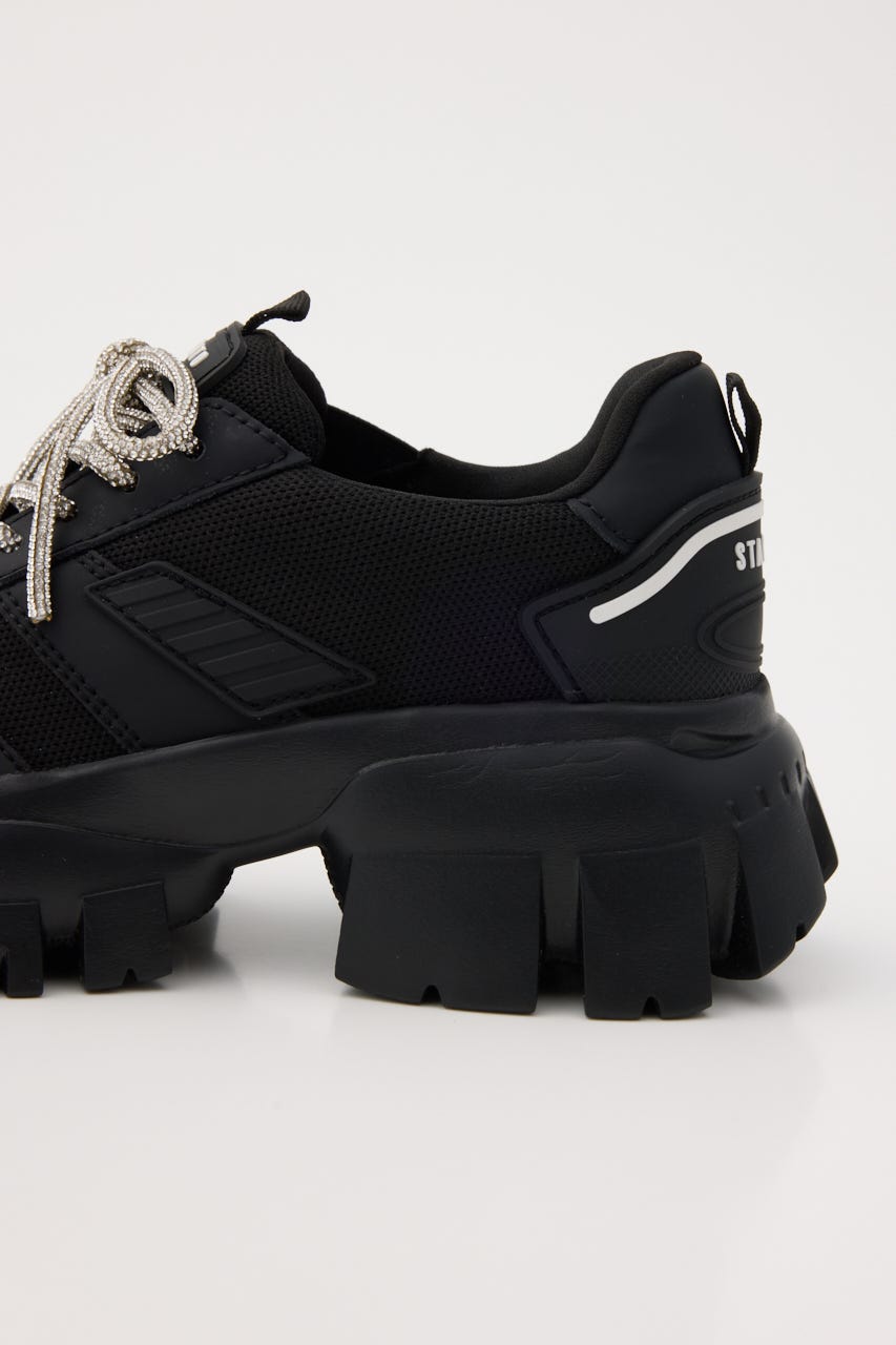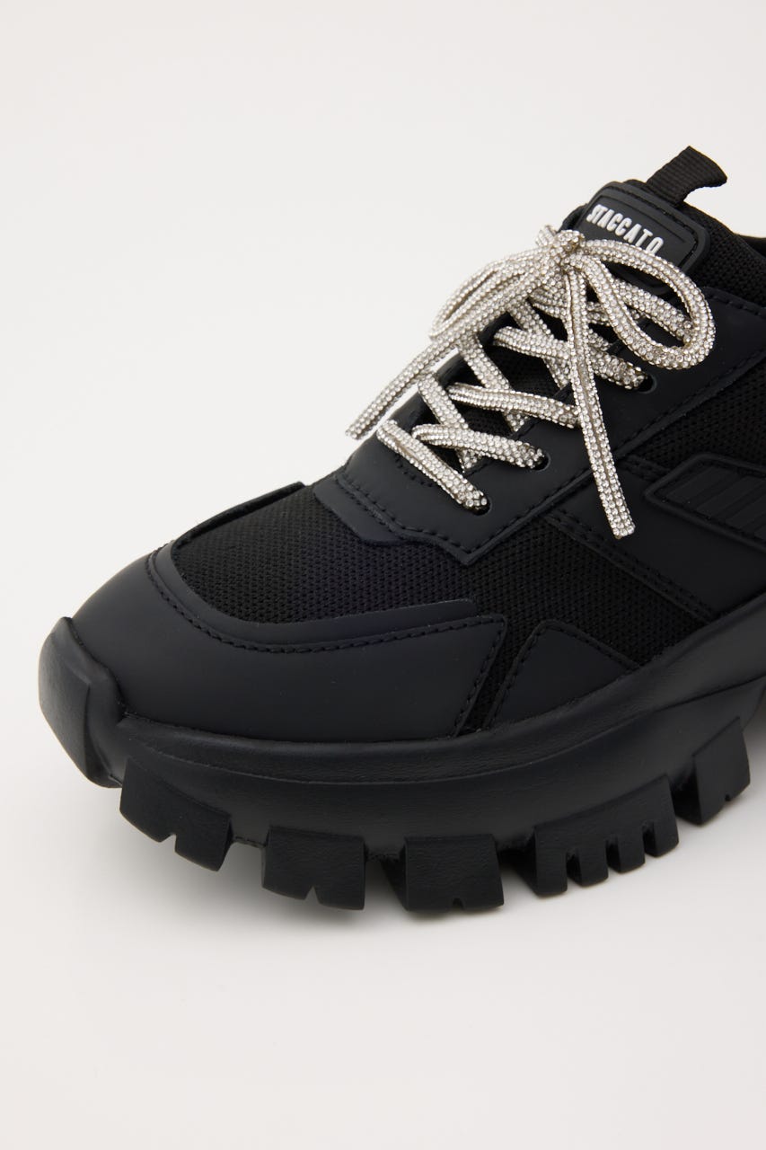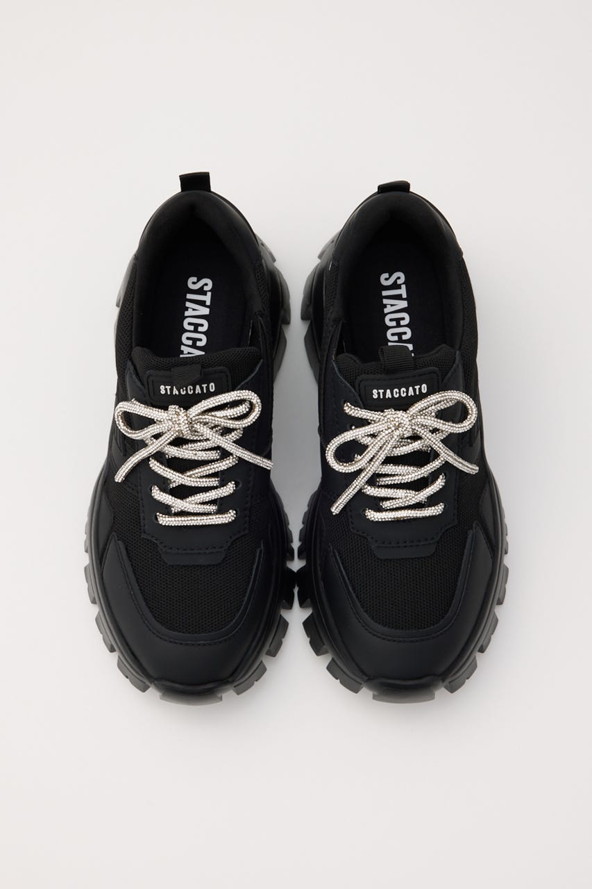 きらきらリボンのコードレースアップが人気の定番ボリュームソールスニーカーが、よりソフで滑らかなメッシュ素材トとなって新登場。スポーティーながら華やかなシューレースがハード見えしすぎずエレガントな印象に。またスニーカー見えながらサイドゴム仕様なのでシューレースを外さずスリッポンタイプで着用いただけます。
