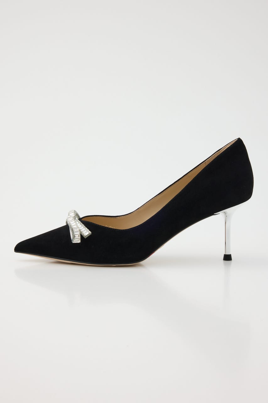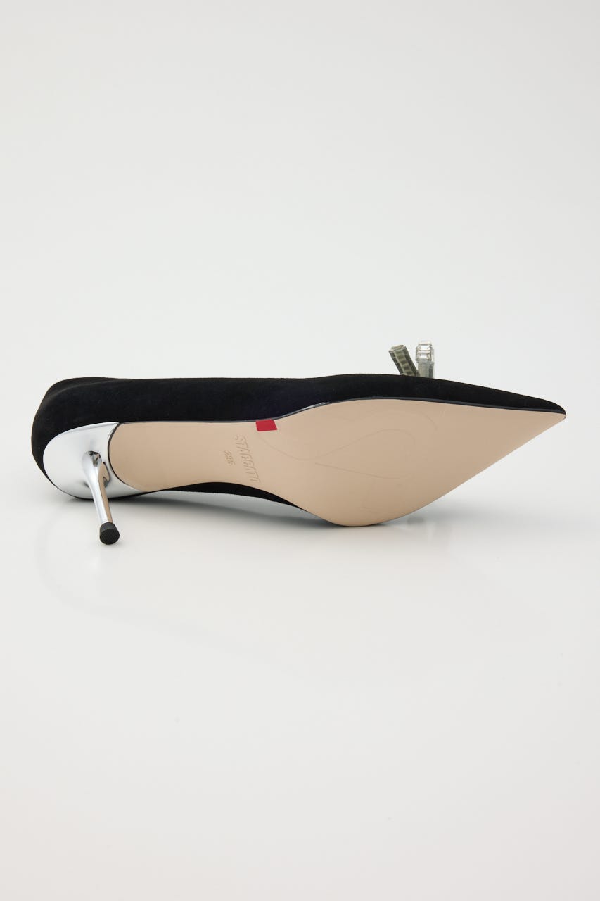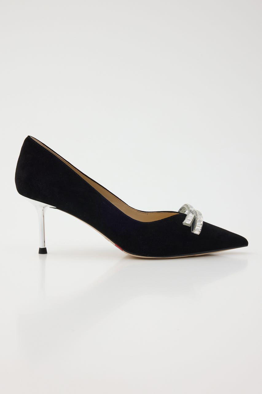 大人かわいい上品さが漂う、華やかな印象のピンヒールパンプス。柔らかスエード素材のデイリー使いにも◯な定番ブラックカラーにコントラストきいた極細のシルバーヒールがポイント。程よくフェミニンなきらきらのスリムリボンがより印象的な足元に魅せてくれます。