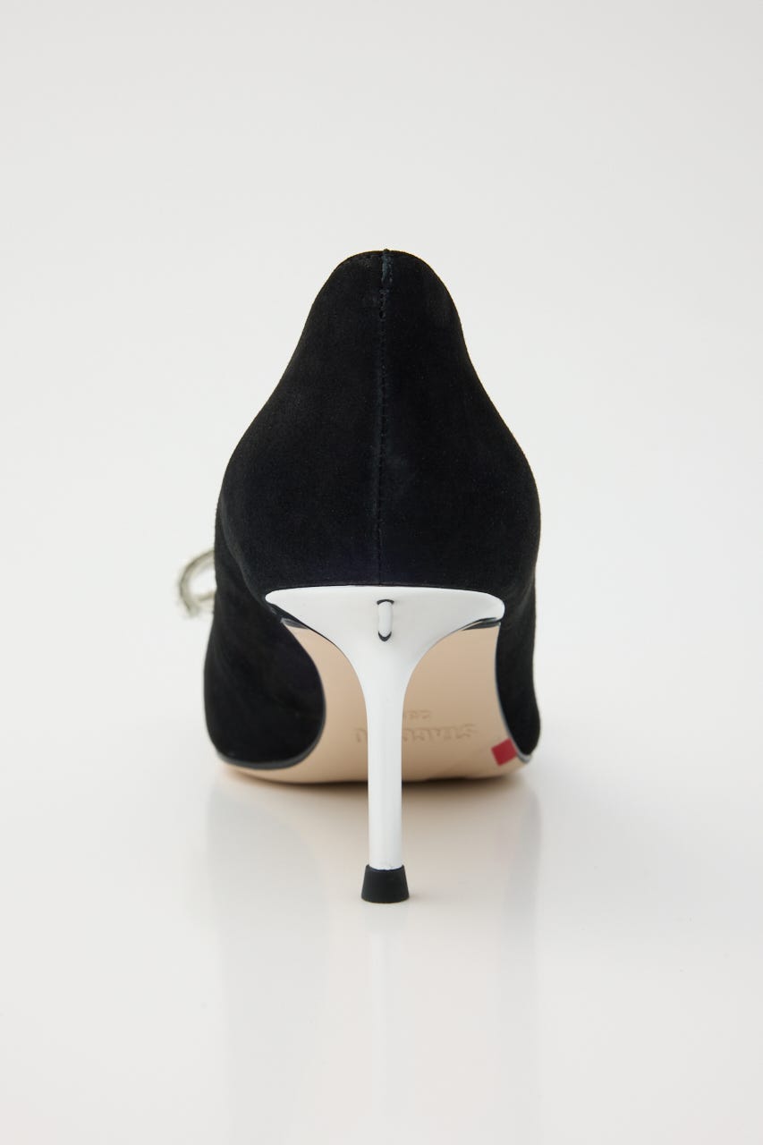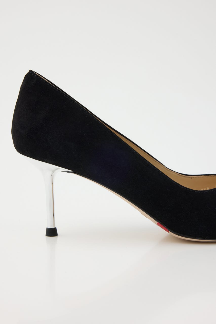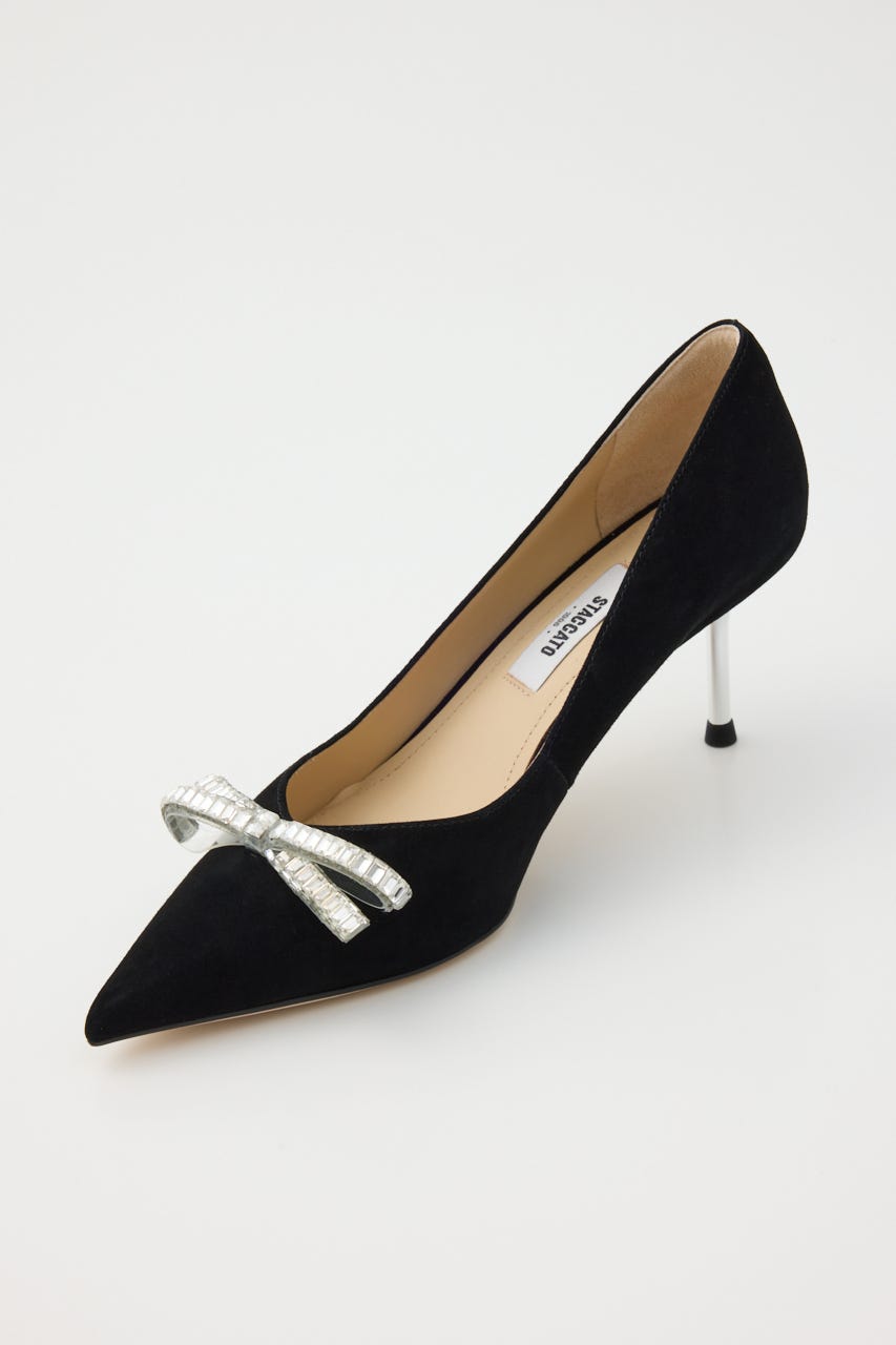 大人かわいい上品さが漂う、華やかな印象のピンヒールパンプス。柔らかスエード素材のデイリー使いにも◯な定番ブラックカラーにコントラストきいた極細のシルバーヒールがポイント。程よくフェミニンなきらきらのスリムリボンがより印象的な足元に魅せてくれます。