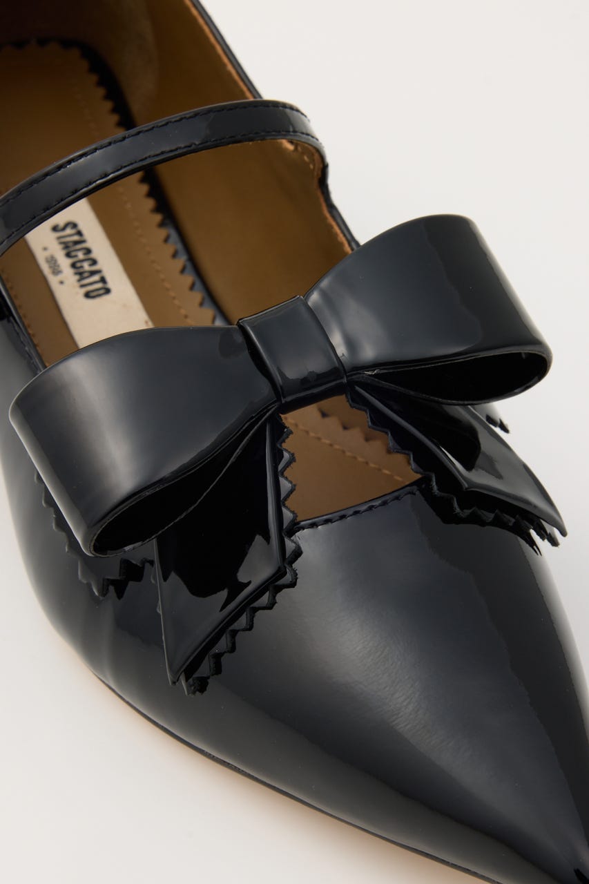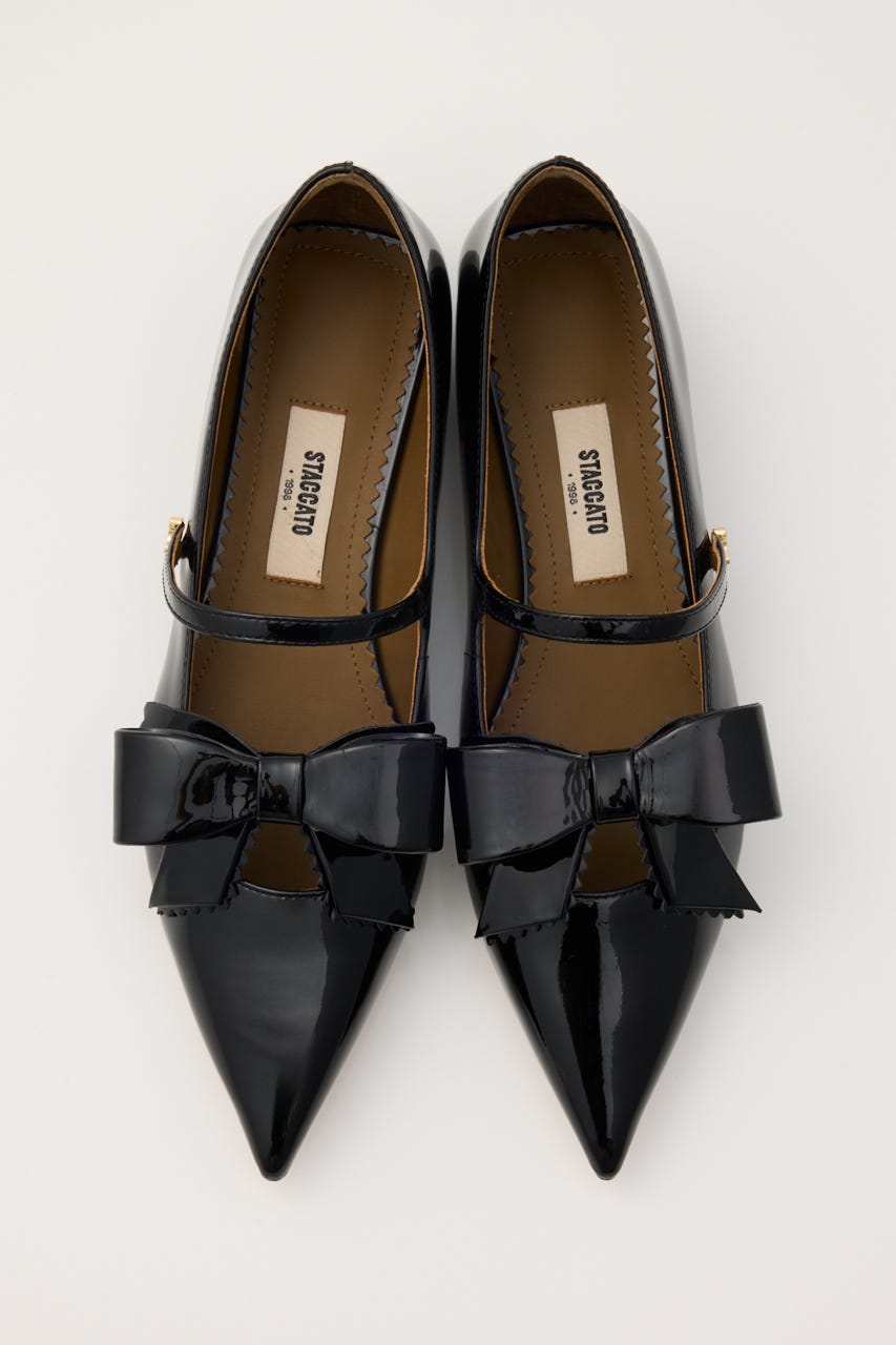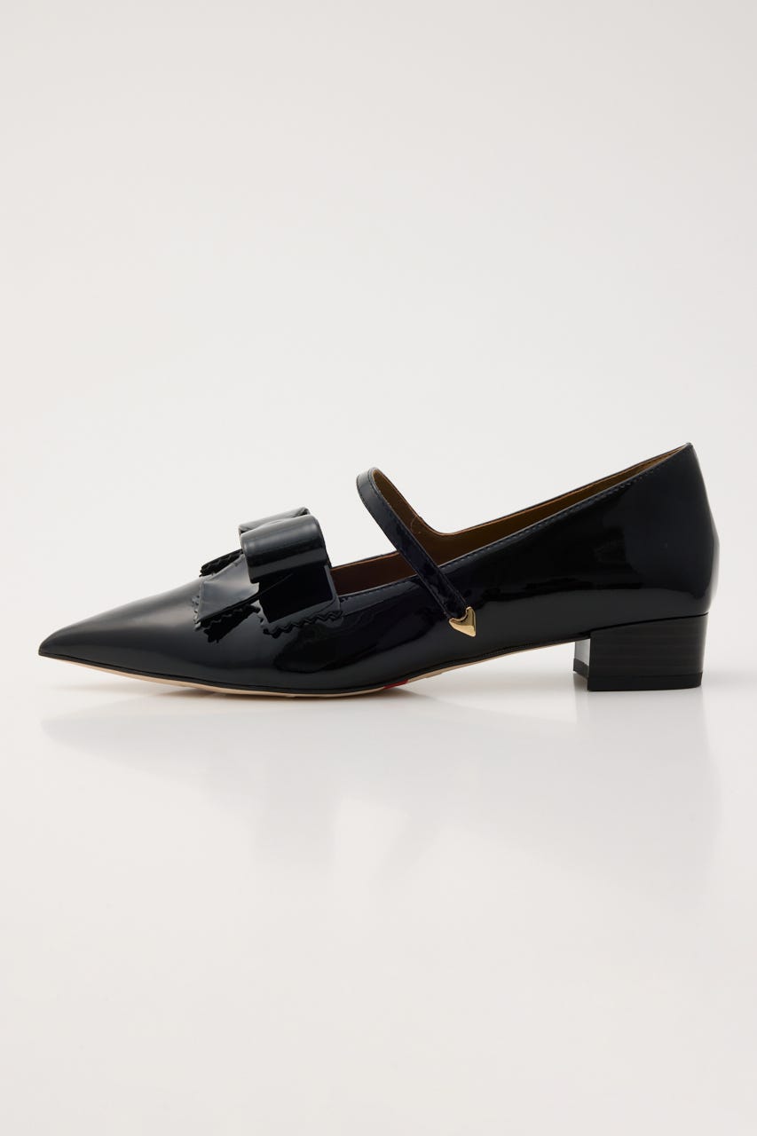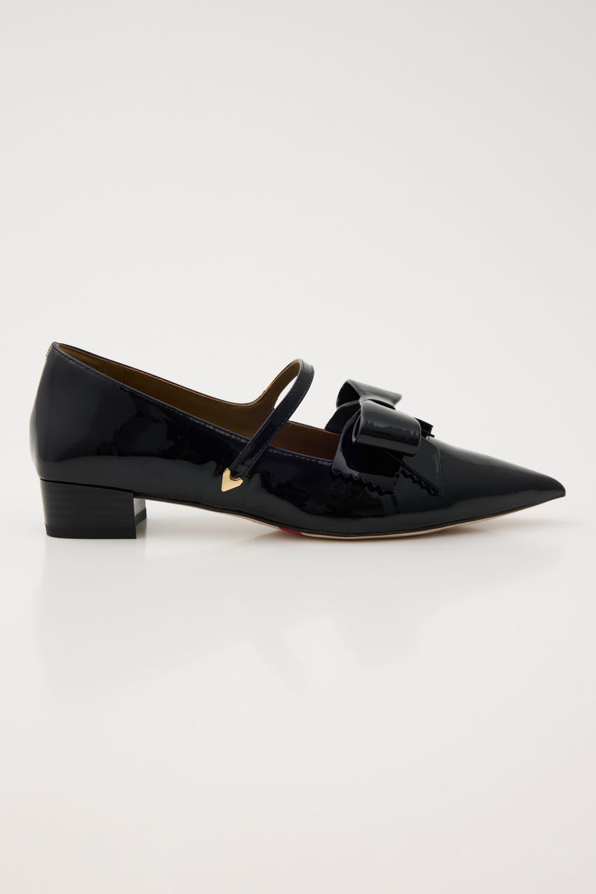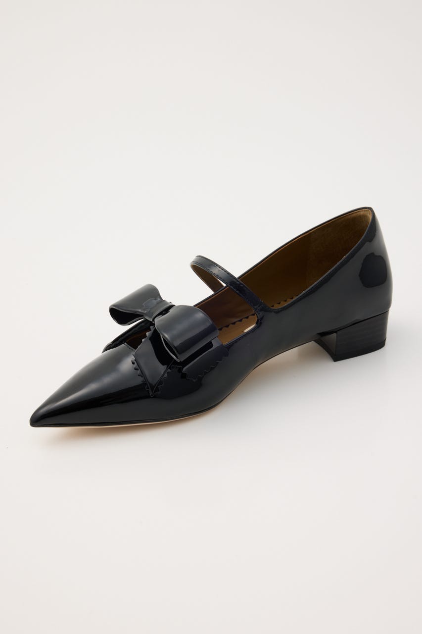 インパクト大のとびきりキュートなドレスシューズ。印象的なBIGリボンにスタイリッシュで妖艶な雰囲気のポインテッドトゥ、甲部分には華奢ベルトが脱げにくく足を支えてくれます。硬く見えがちながら足あたり柔らかなパテントレザーで窮屈感なくソフトな履き心地です。