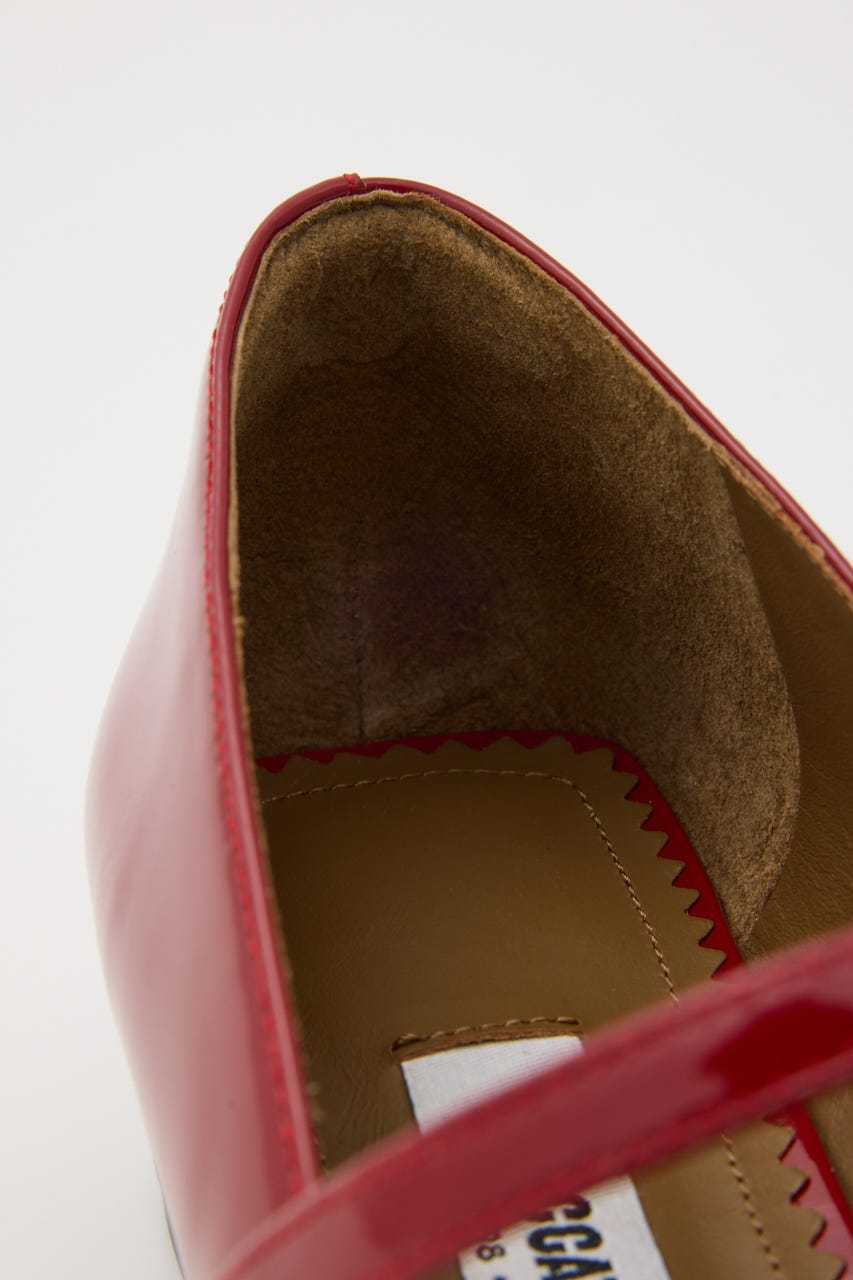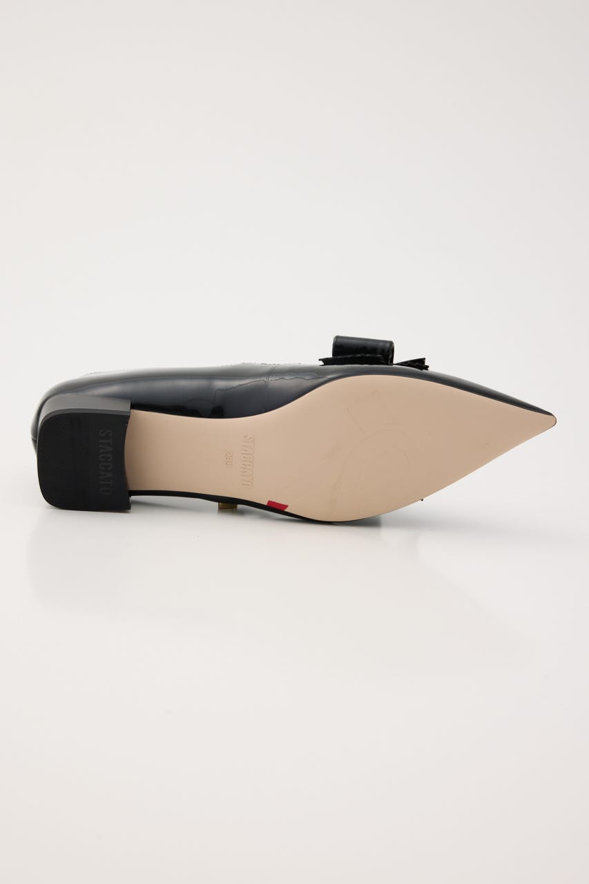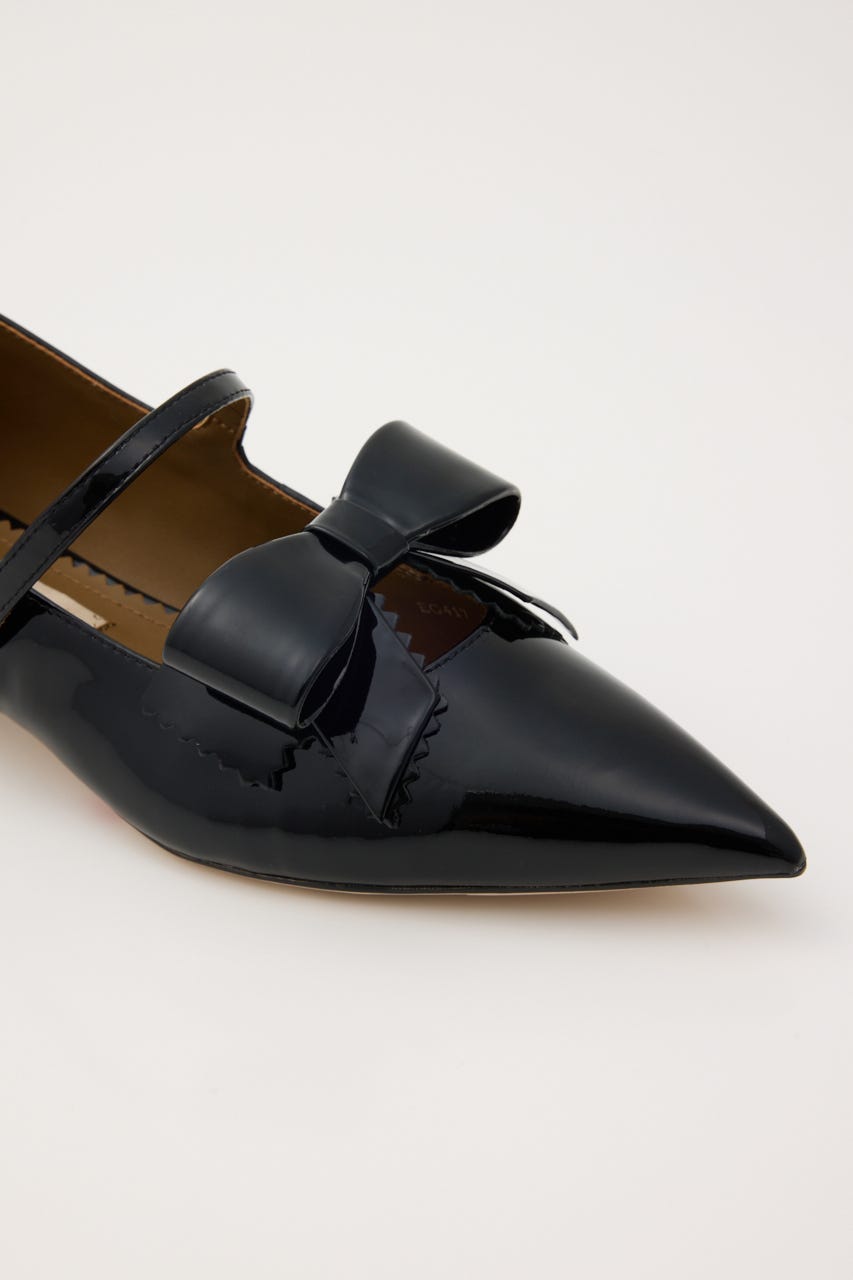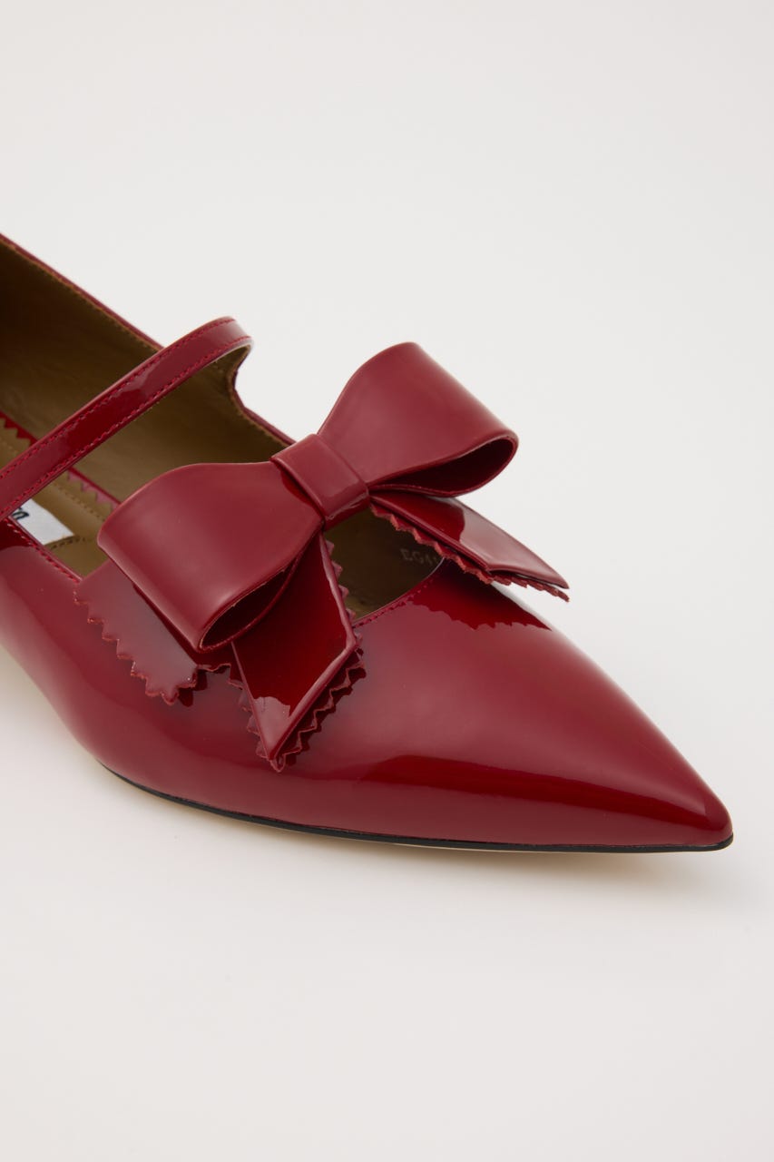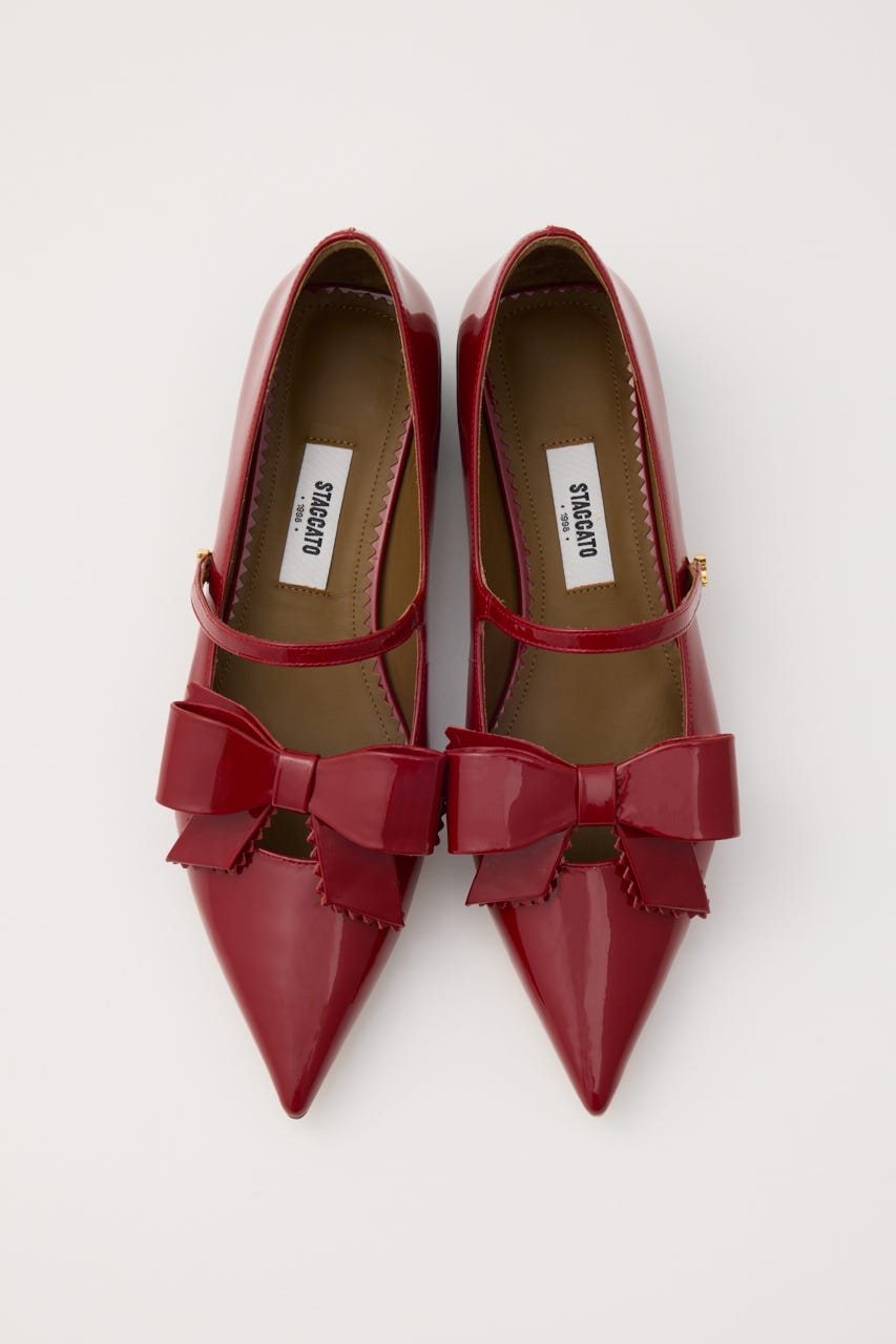 インパクト大のとびきりキュートなドレスシューズ。印象的なBIGリボンにスタイリッシュで妖艶な雰囲気のポインテッドトゥ、甲部分には華奢ベルトが脱げにくく足を支えてくれます。硬く見えがちながら足あたり柔らかなパテントレザーで窮屈感なくソフトな履き心地です。
