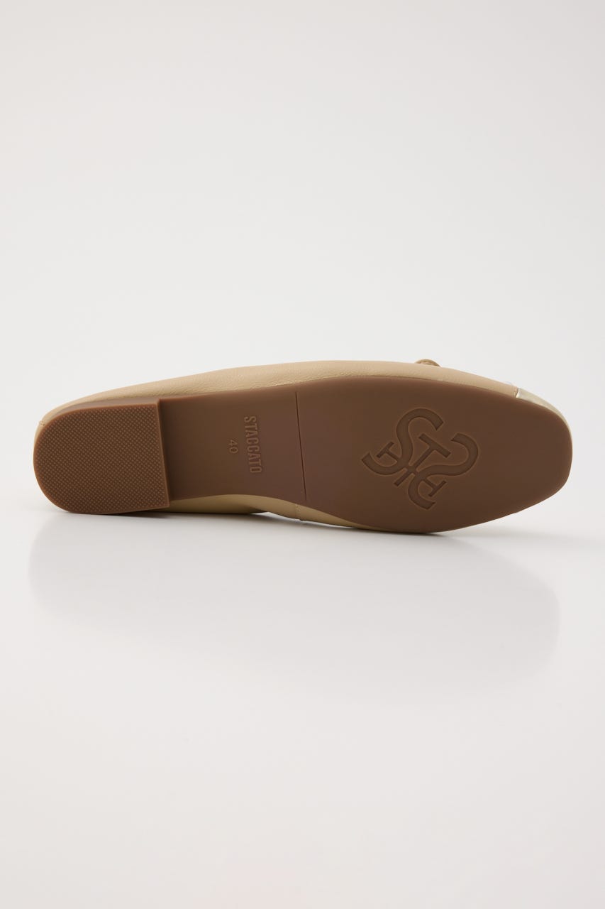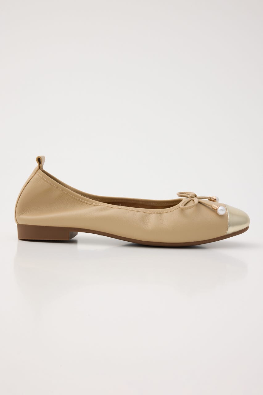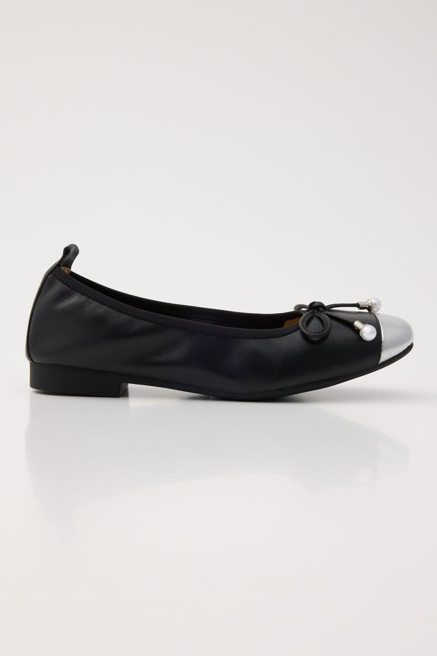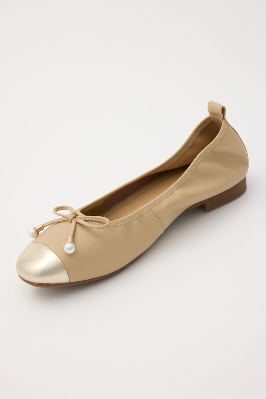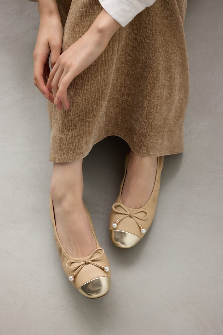 シーズンレスで履いていただけるパール付リボンが足元華やかな、柔軟性に優れたバレエシューズ。つま先部分にはシャイニーな異素材の切替もポイントです。ふかふかのインソールが足裏に吸い付き、ソフトかつしなやかでフィット感も◎ ヒールのないフラットデザインながらカジュアルになりすぎず煌びやかな足元を演出してくれます。