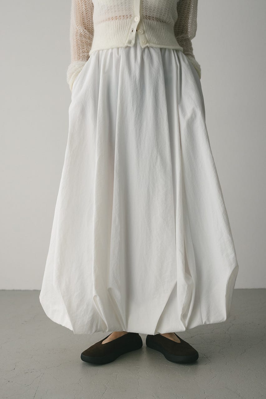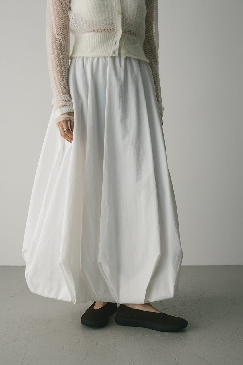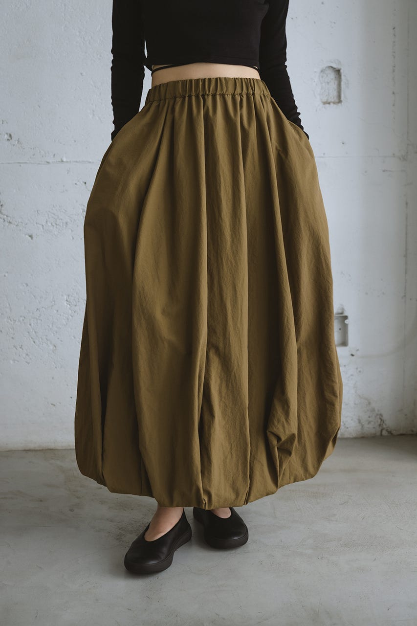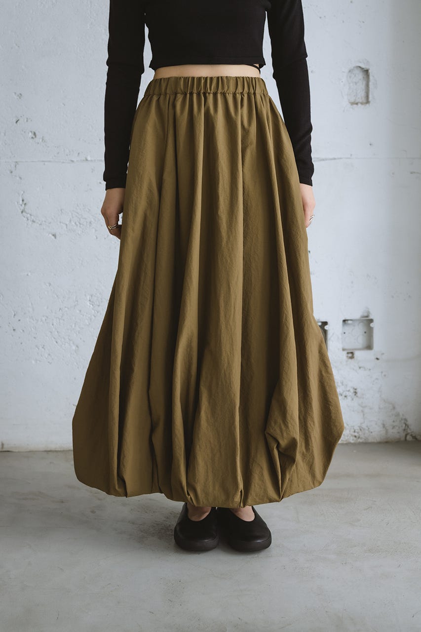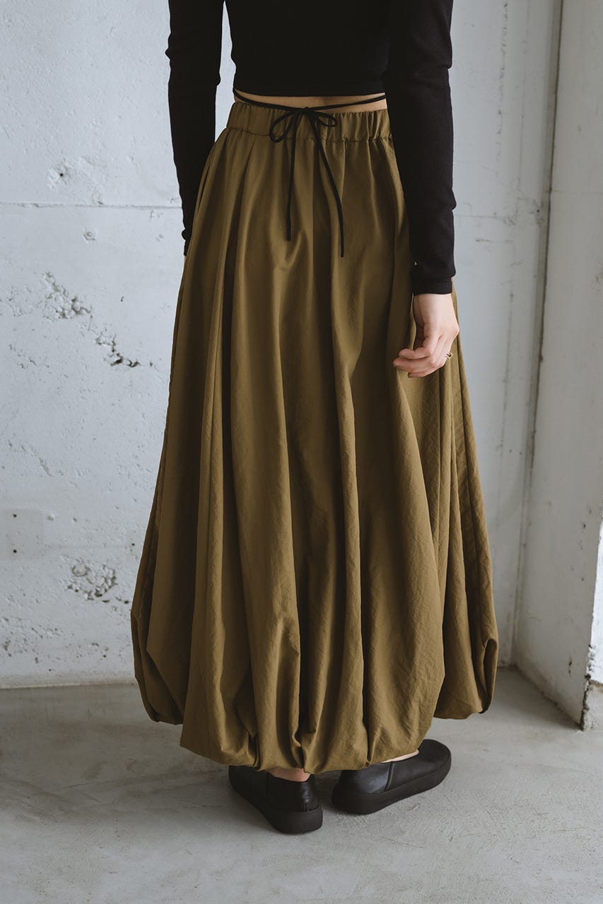 ドライでマットなナイロンタッチ素材でふんわり仕上げた華やかなバルーンギャザースカート。