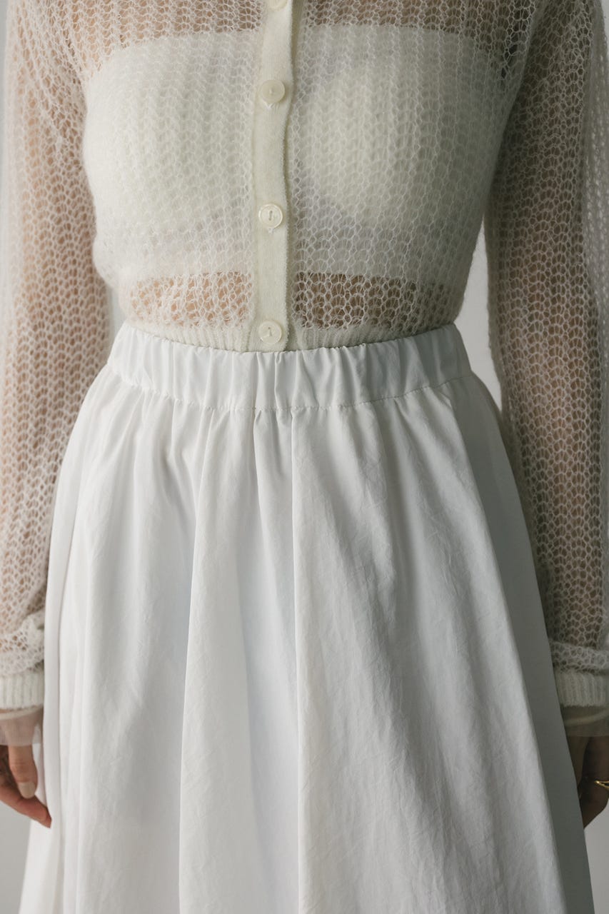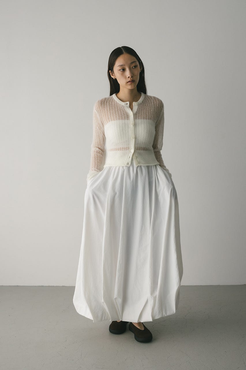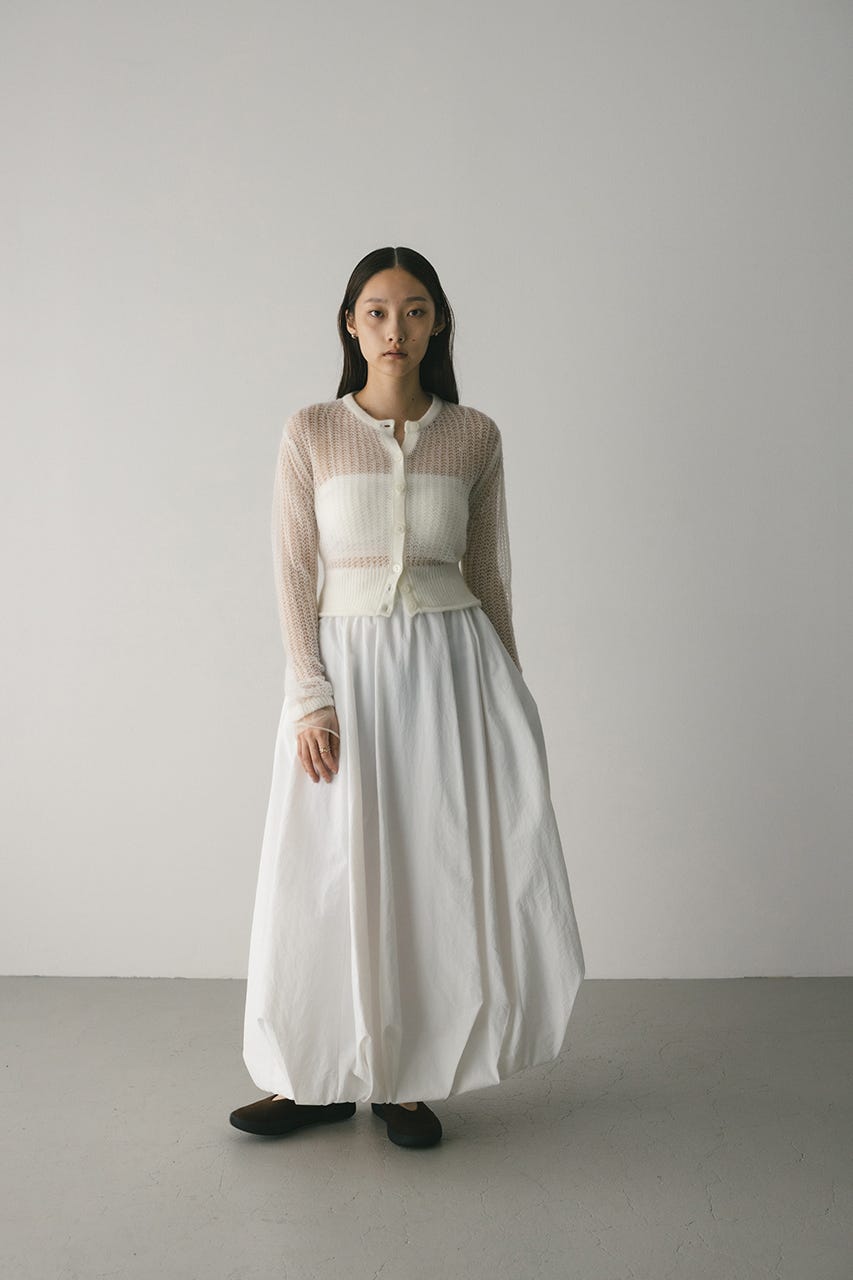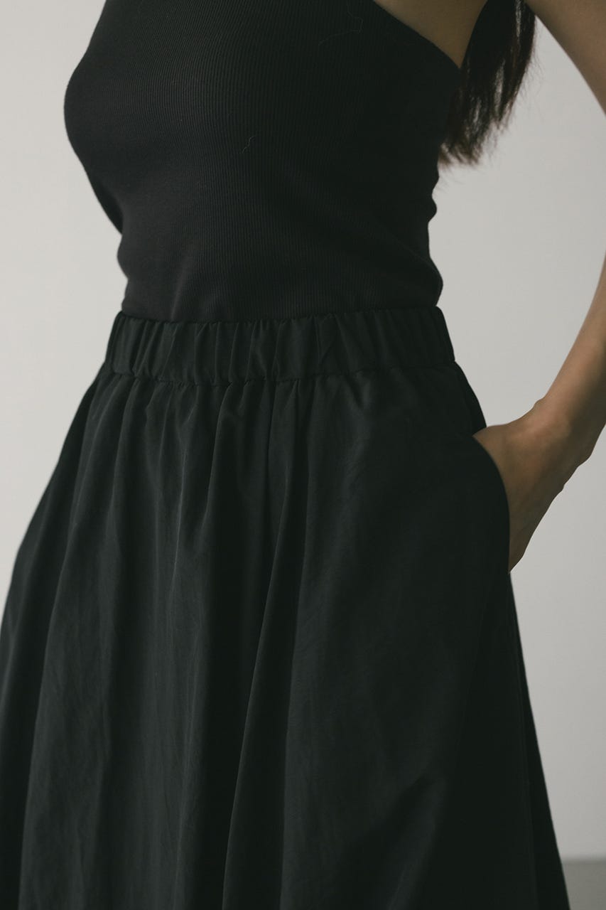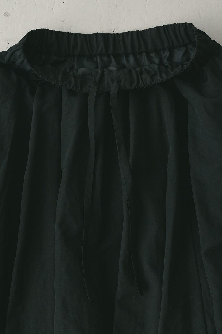 ドライでマットなナイロンタッチ素材でふんわり仕上げた華やかなバルーンギャザースカート。