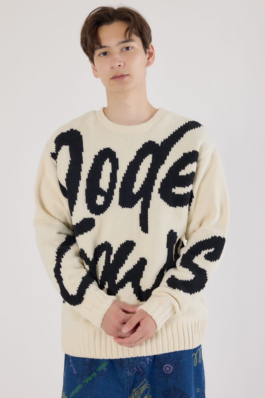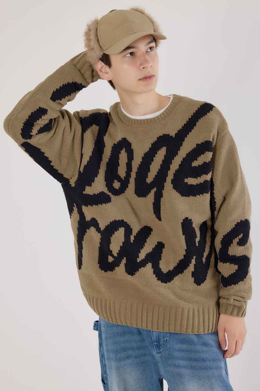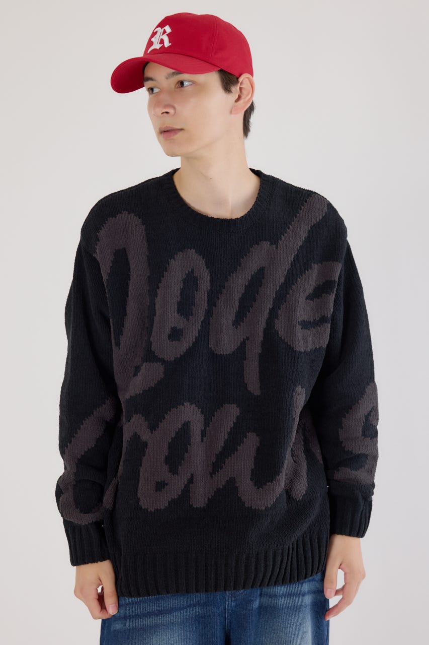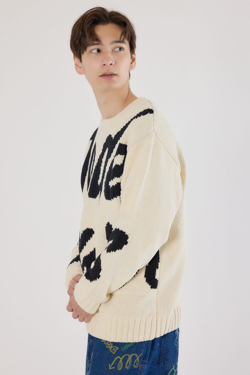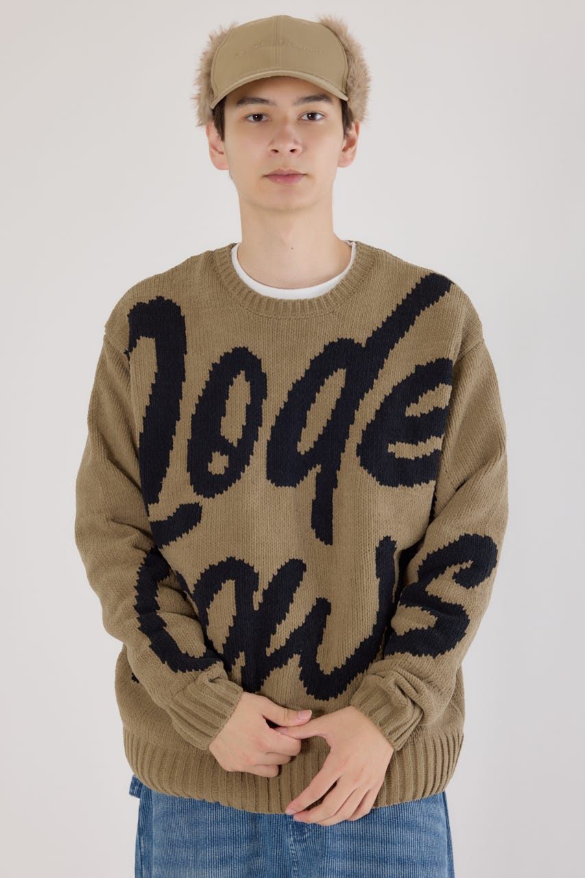 身頃からアームにかけて大胆にロゴが入ったキャッチーなニットプルオーバー。