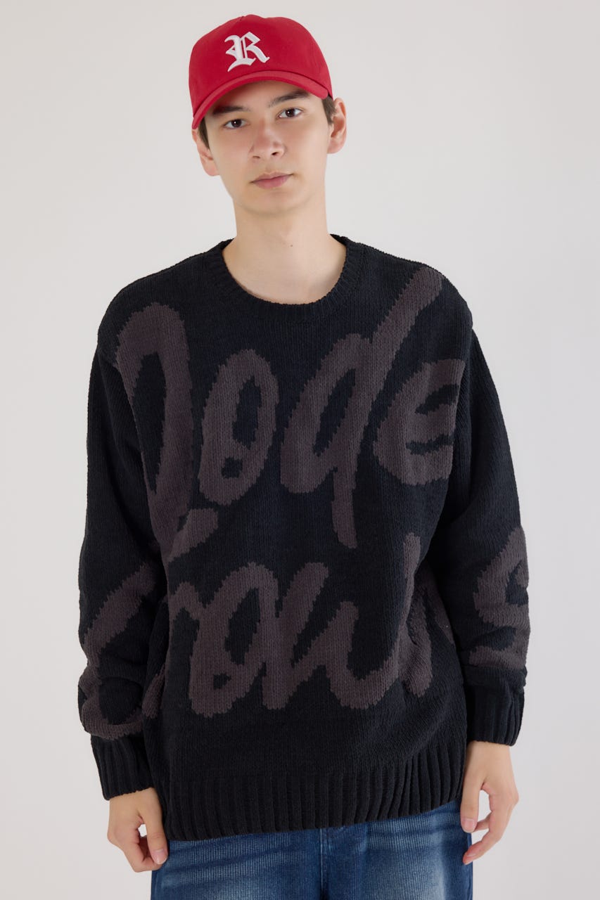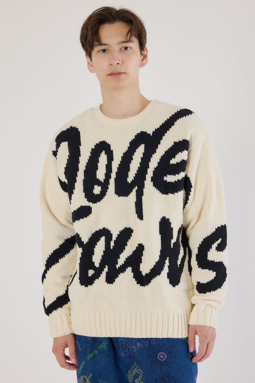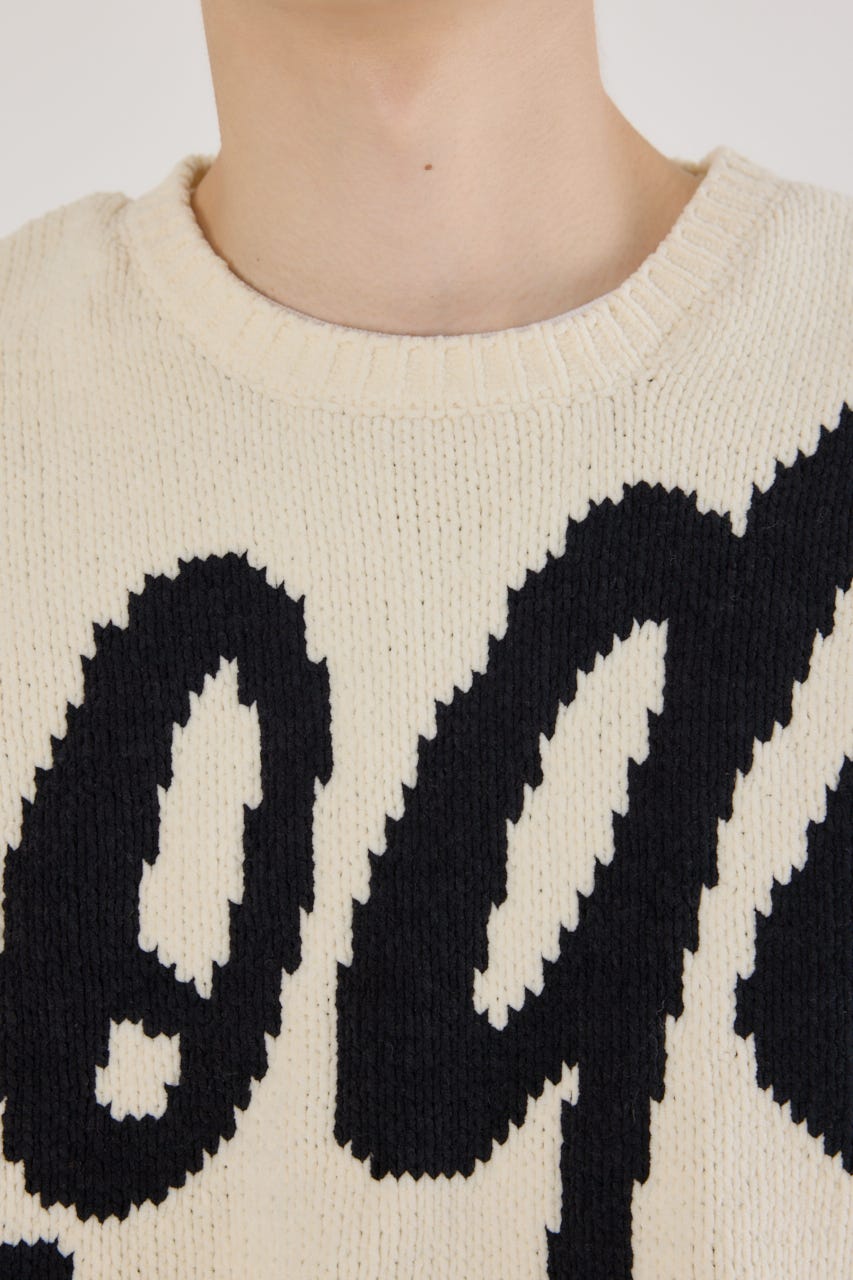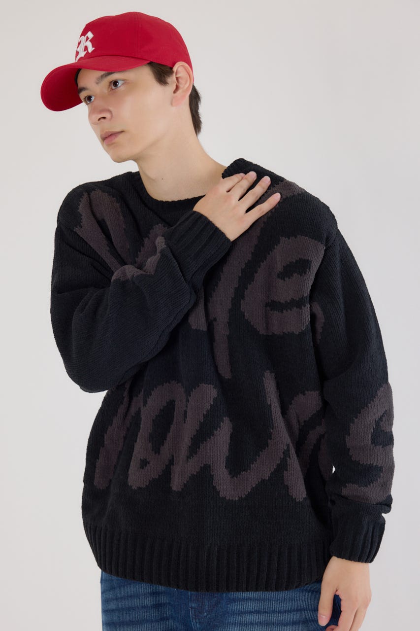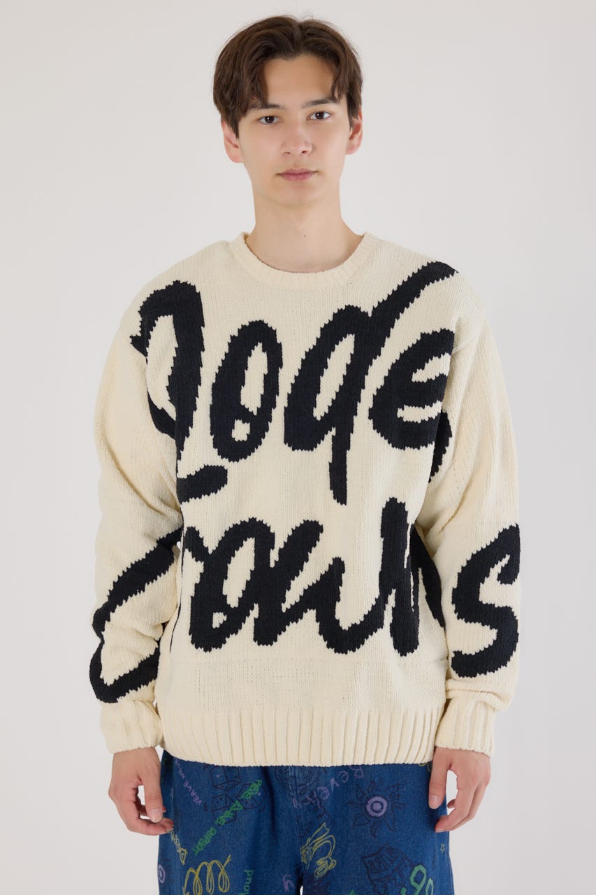 身頃からアームにかけて大胆にロゴが入ったキャッチーなニットプルオーバー。