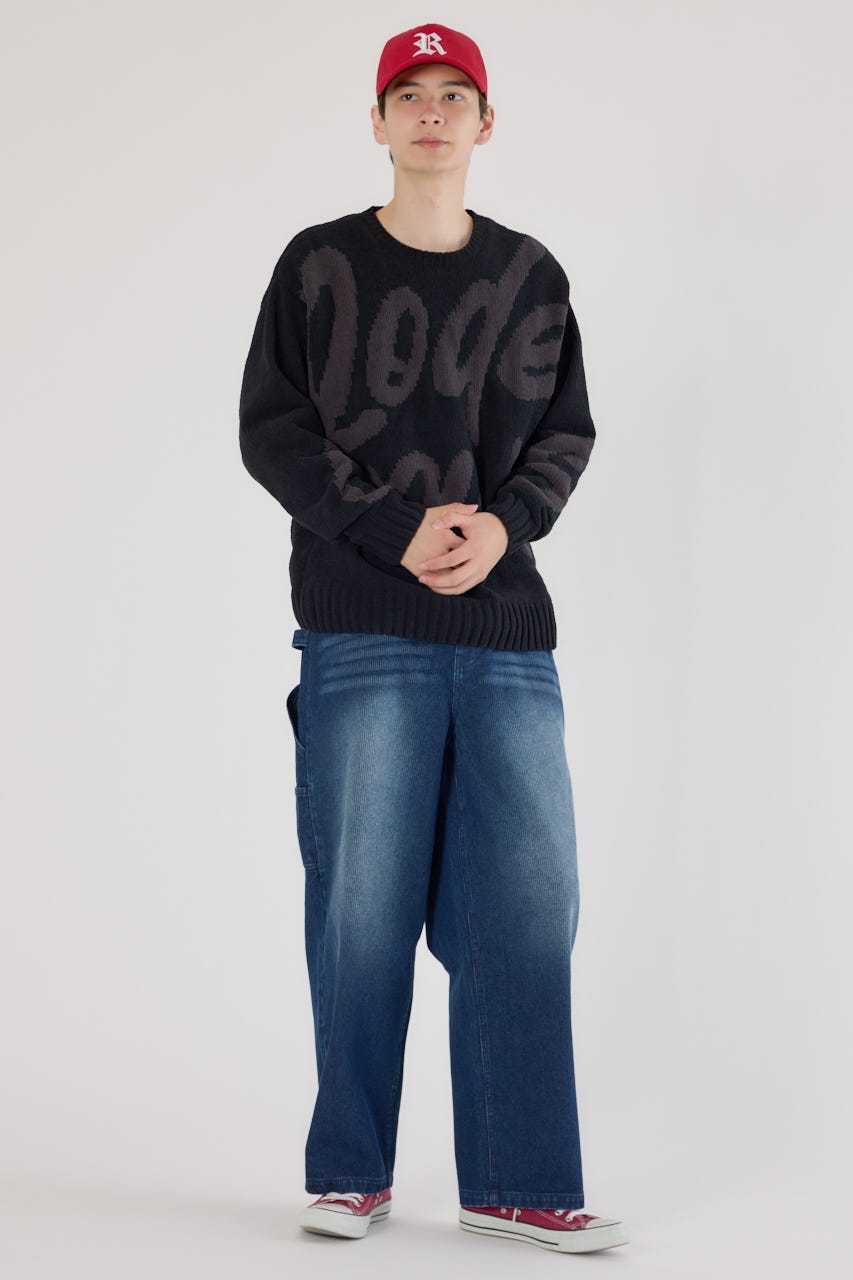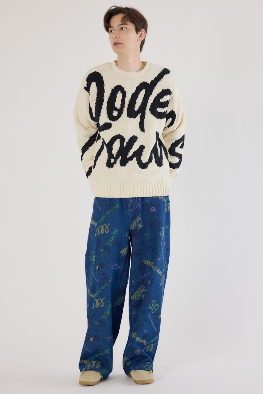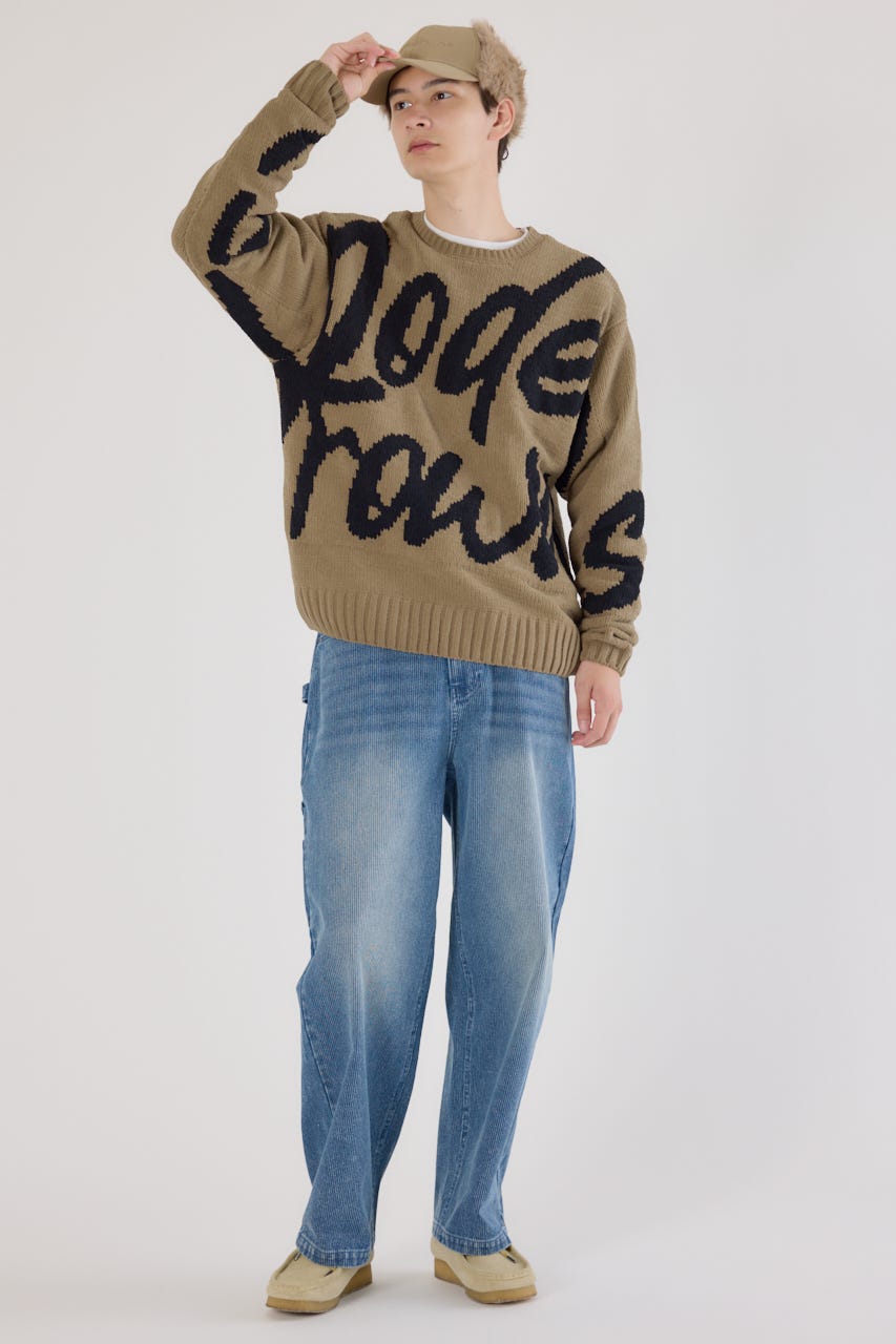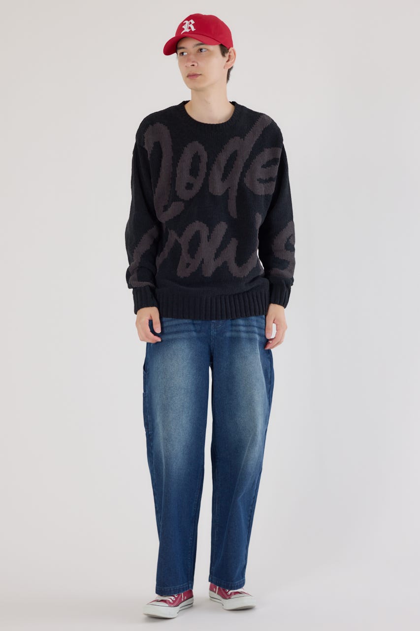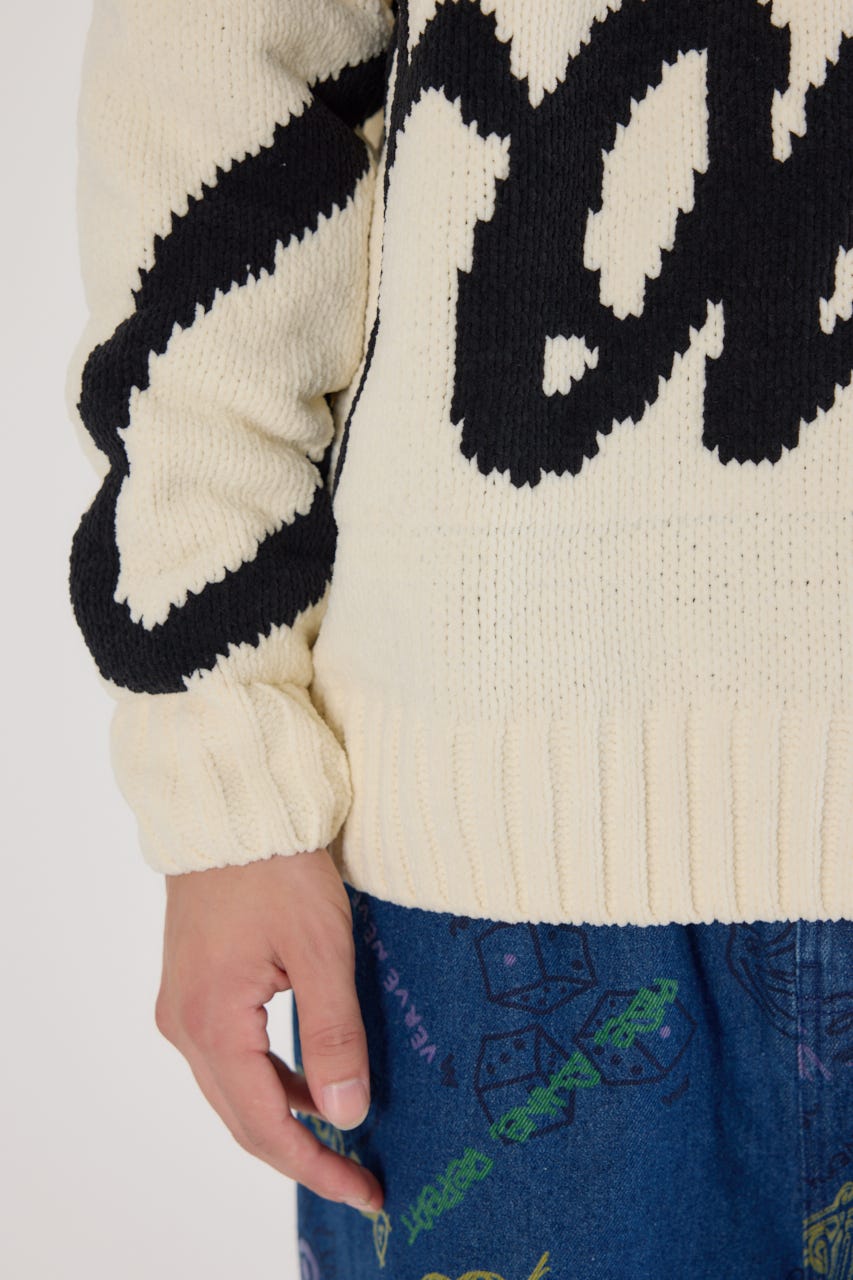 身頃からアームにかけて大胆にロゴが入ったキャッチーなニットプルオーバー。