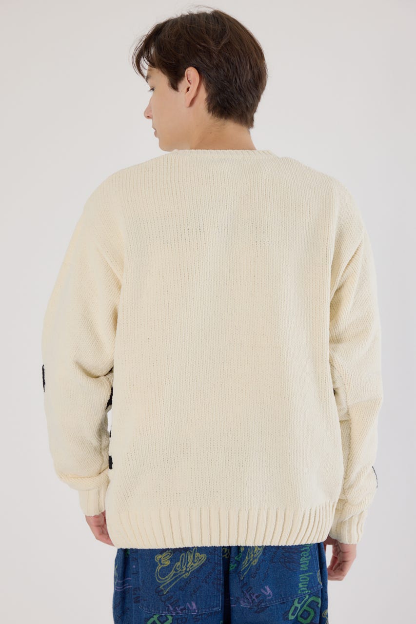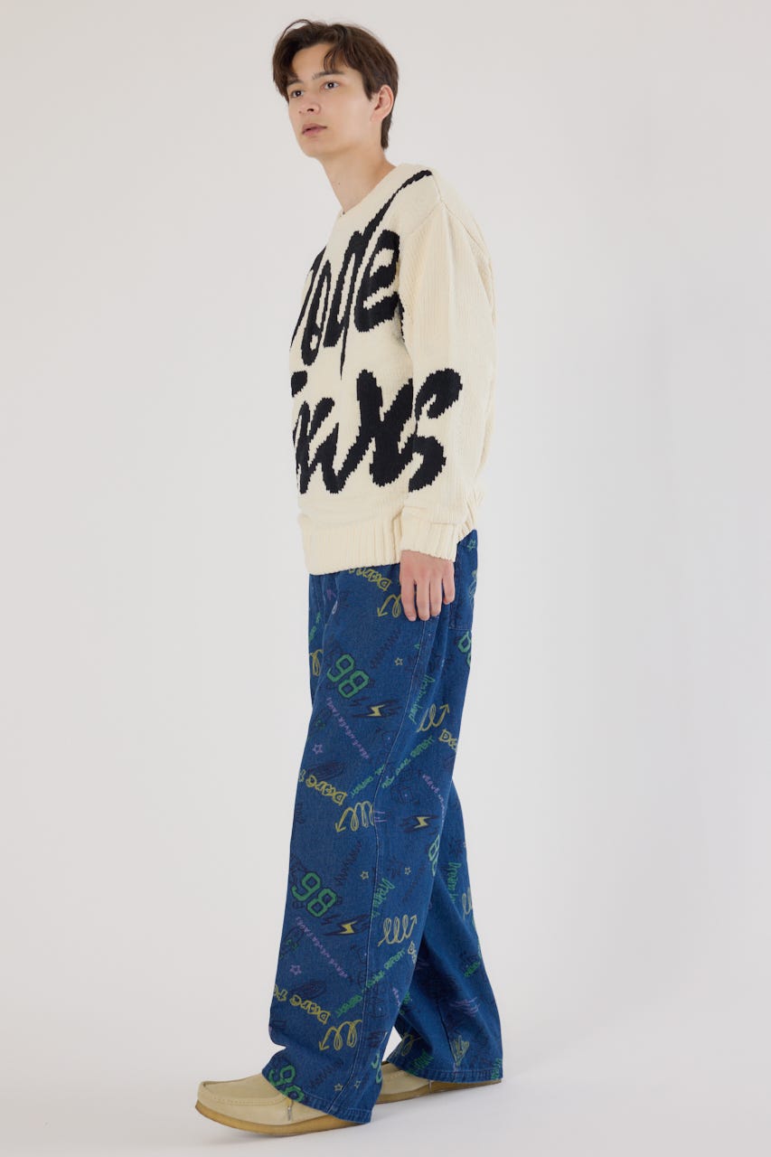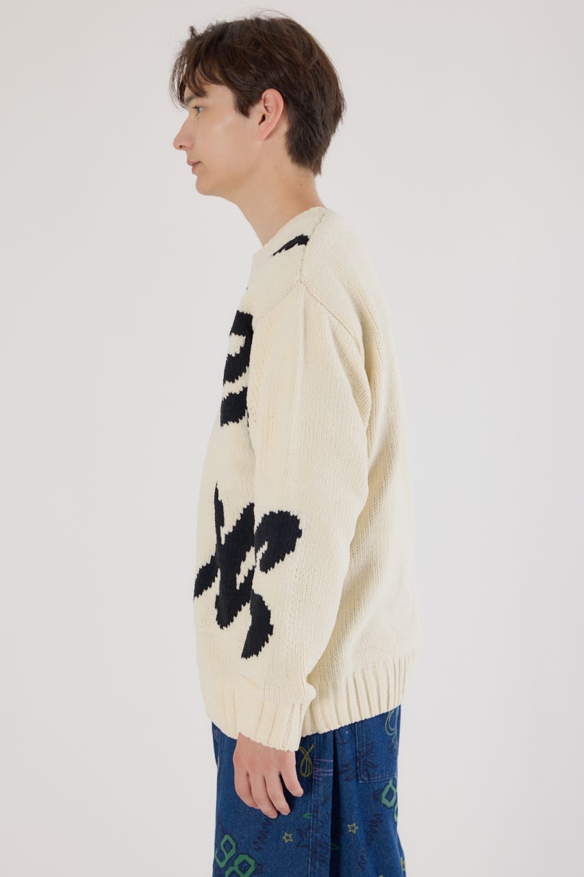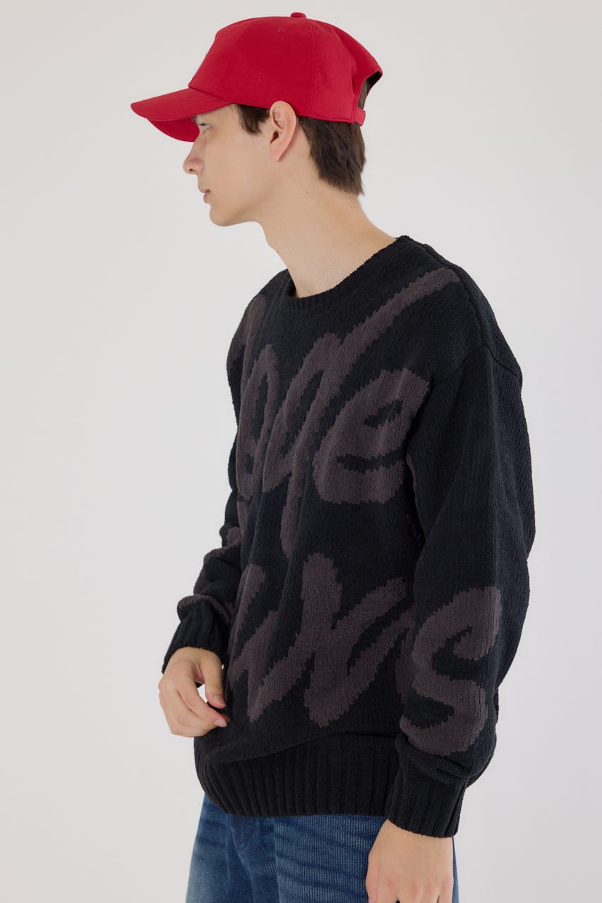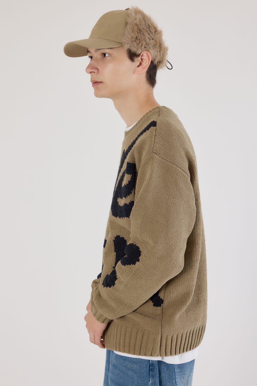 身頃からアームにかけて大胆にロゴが入ったキャッチーなニットプルオーバー。