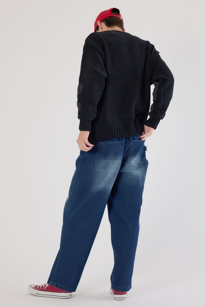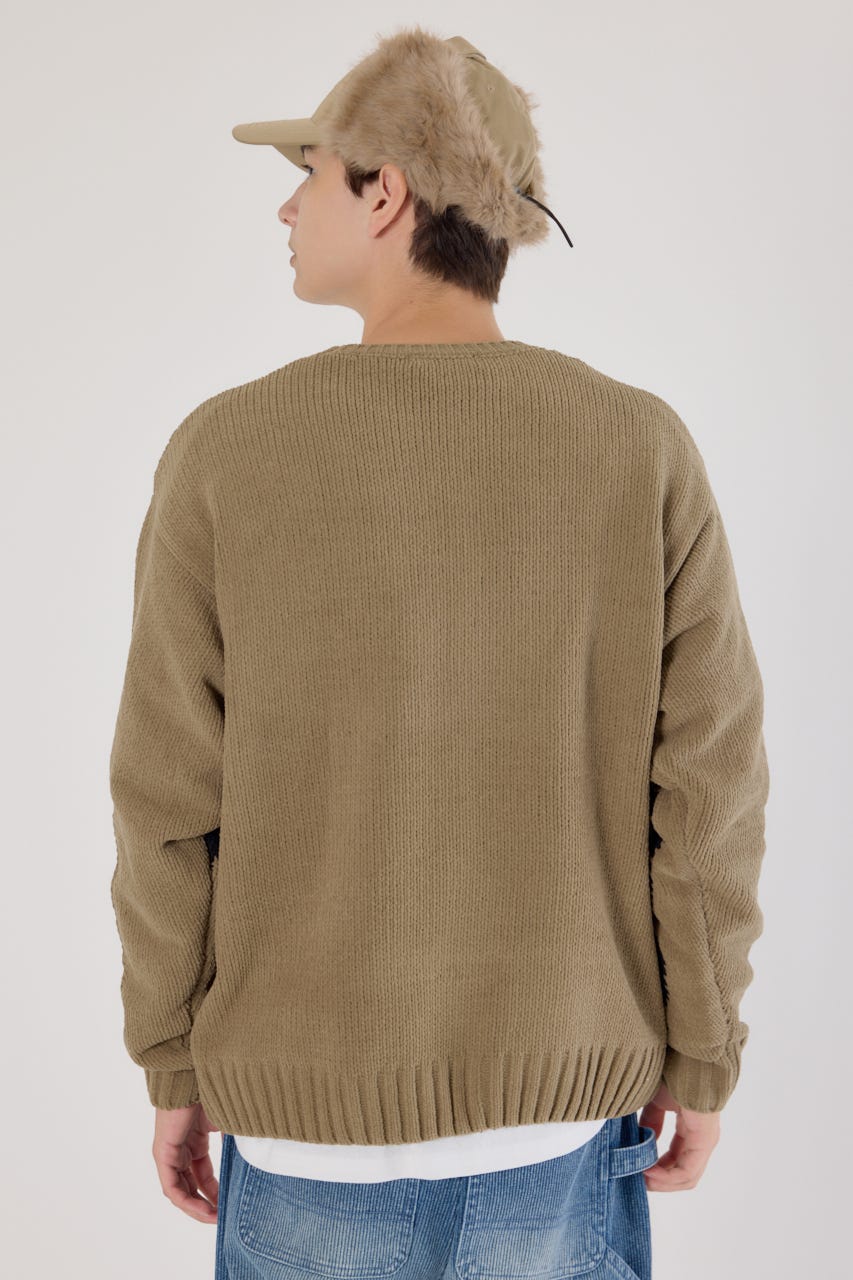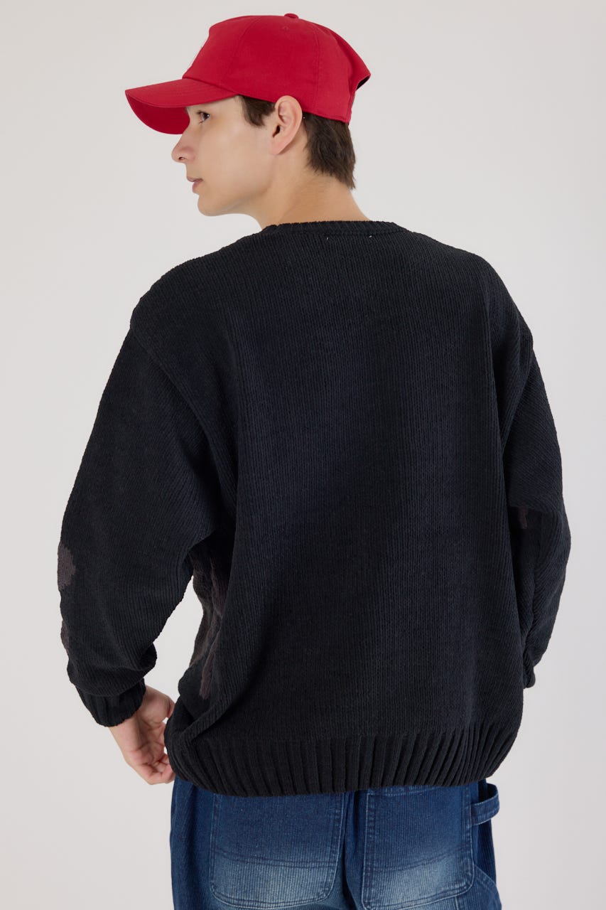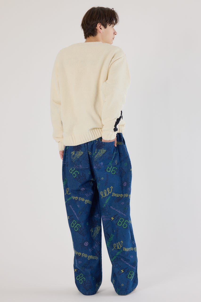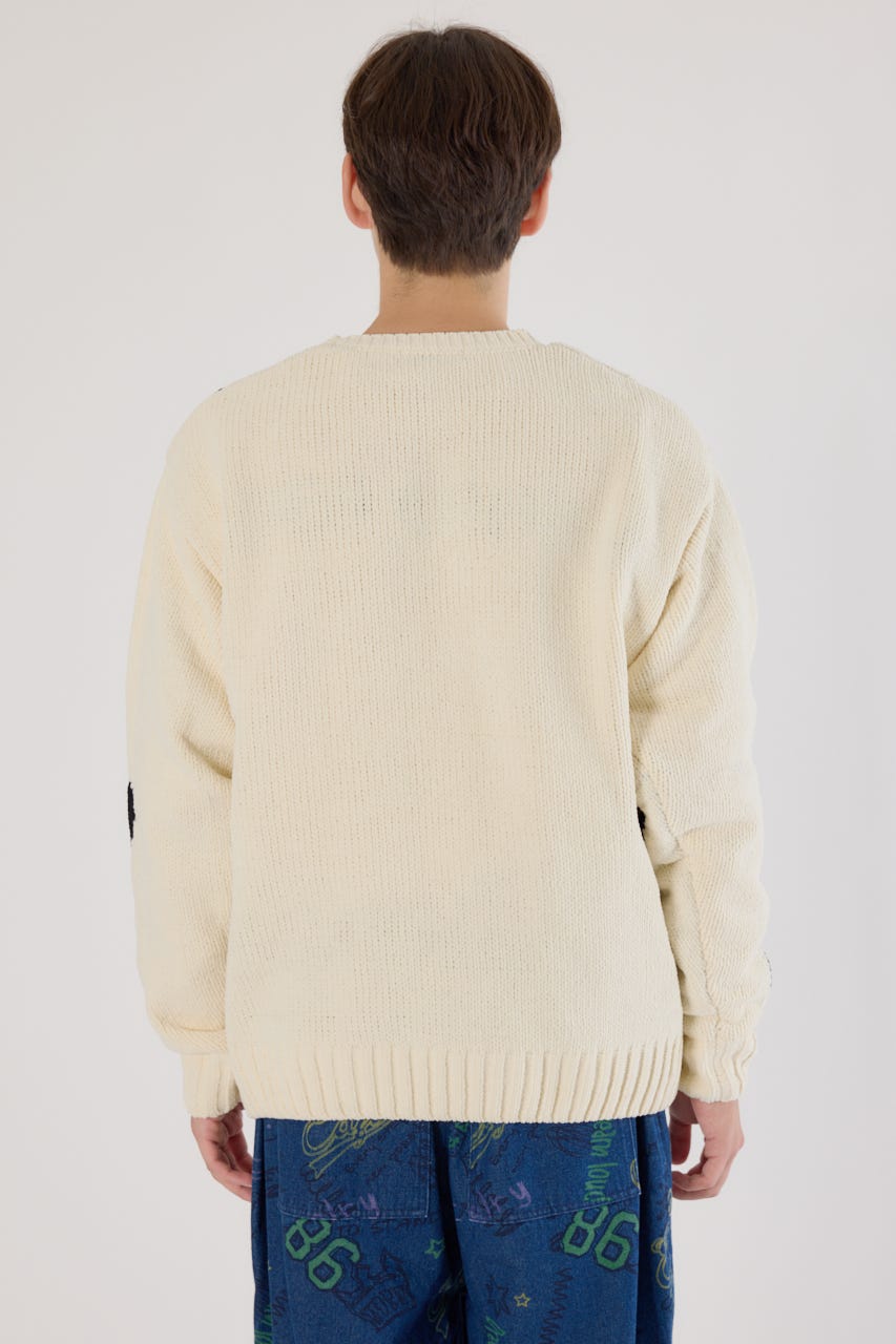 身頃からアームにかけて大胆にロゴが入ったキャッチーなニットプルオーバー。