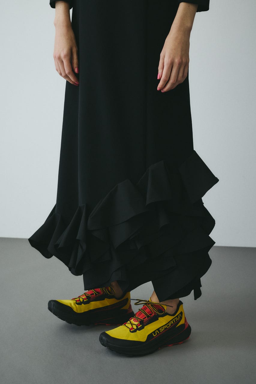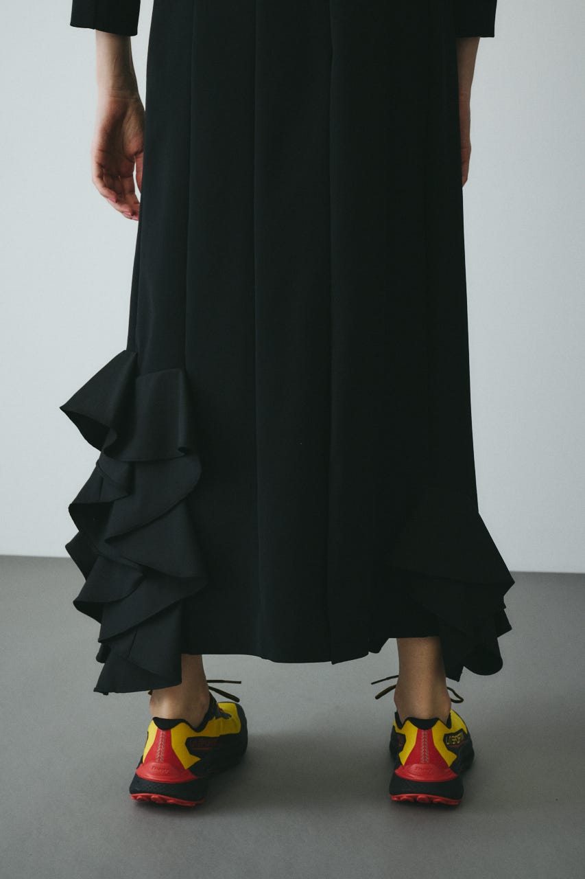 ミニマルなシルエットに裾の立体的なフリルをあしらったロングドレス