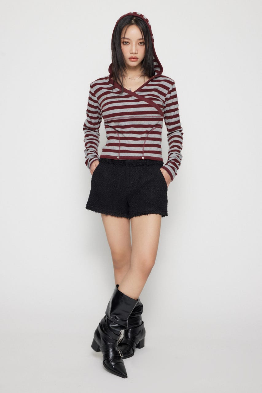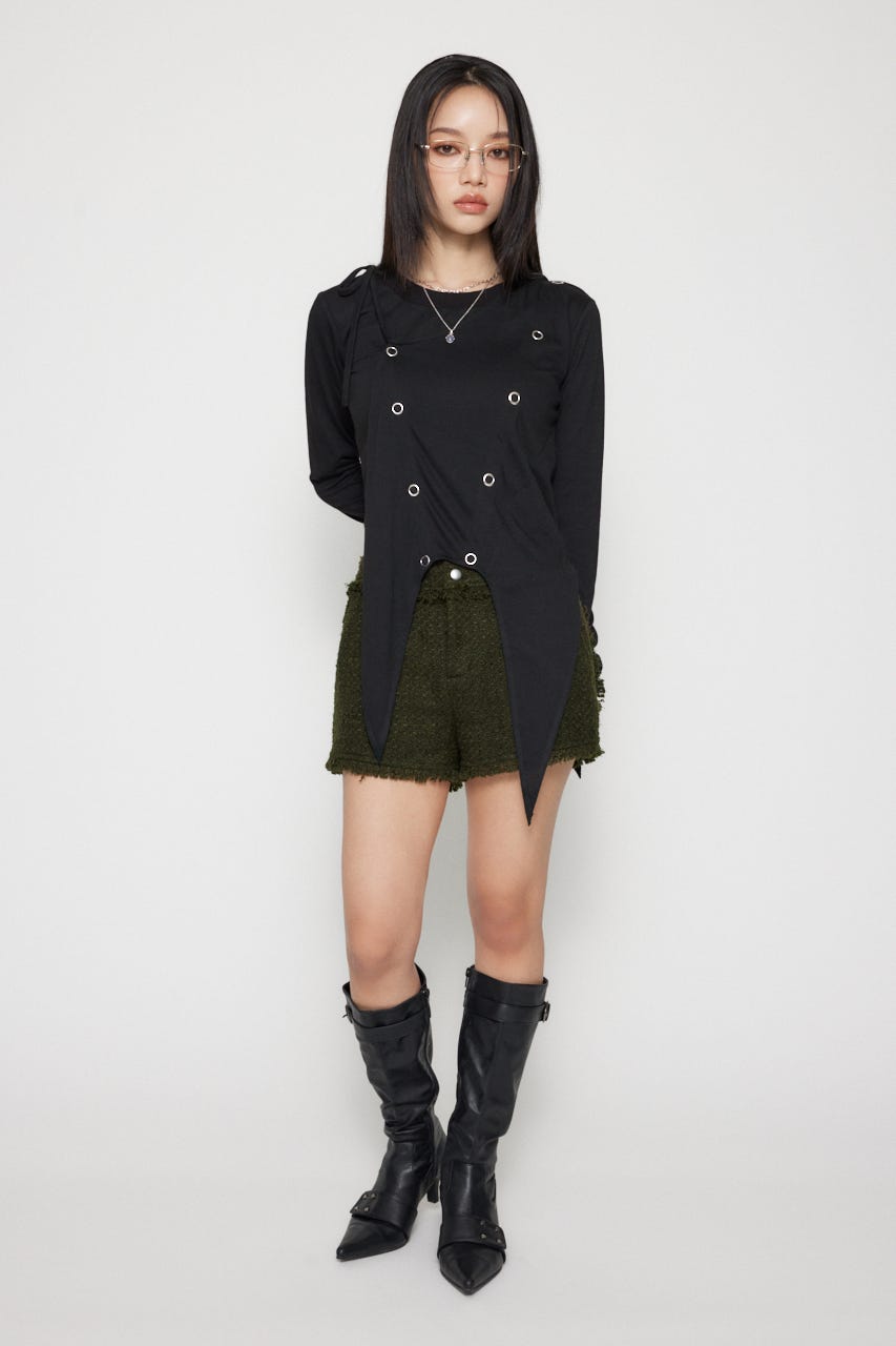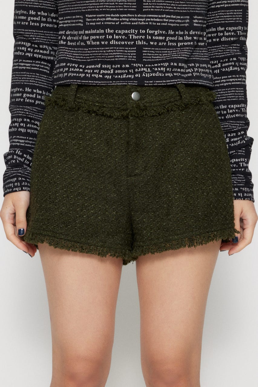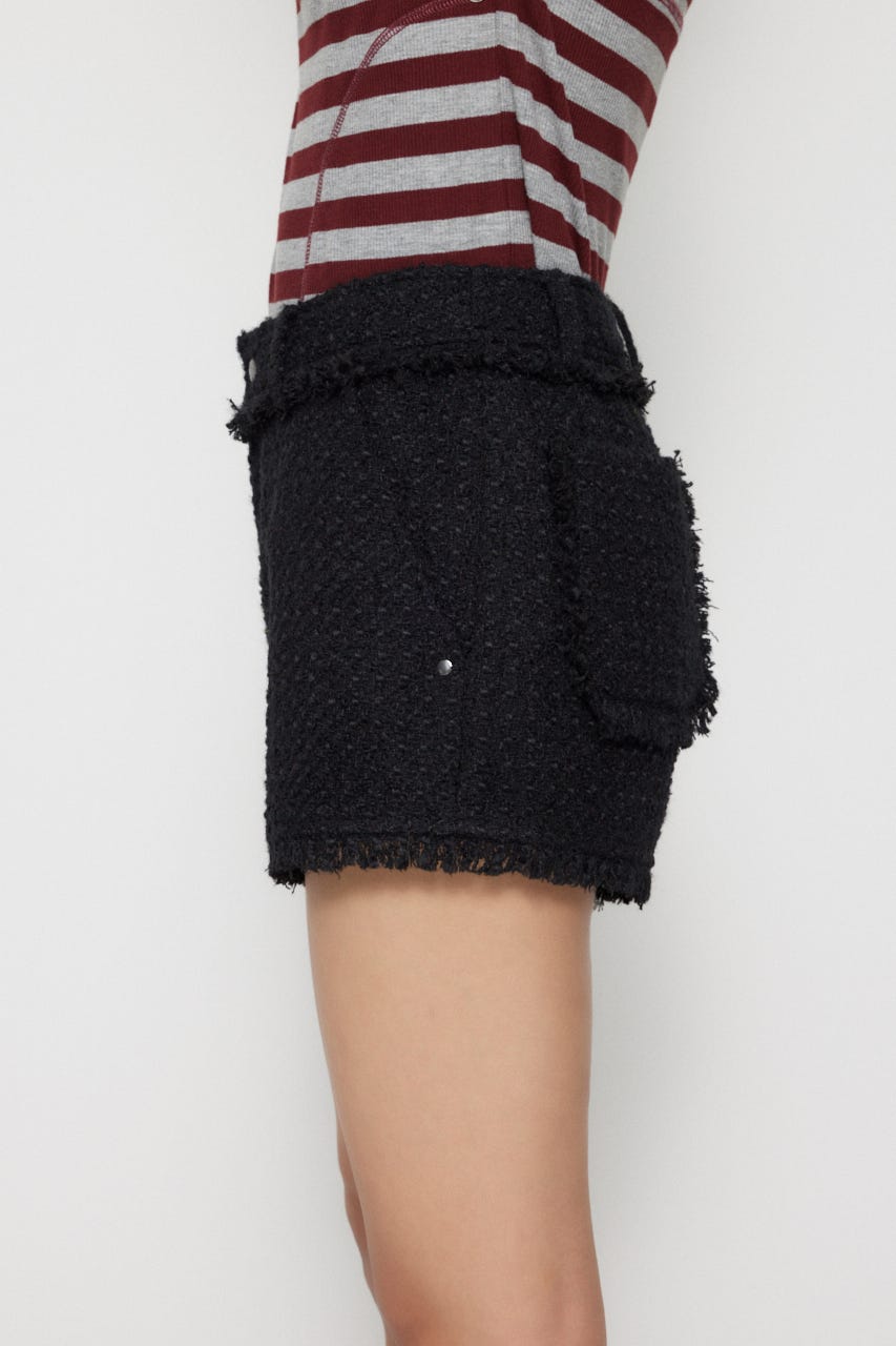 ■POINT:裾のフリンジがポイントのツイードショートパンツ。