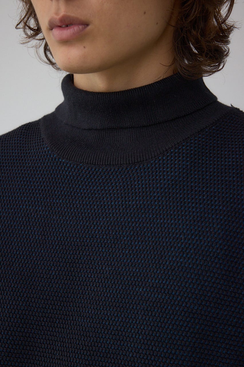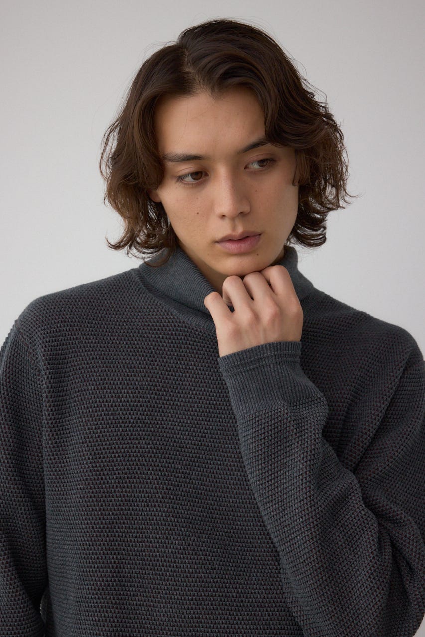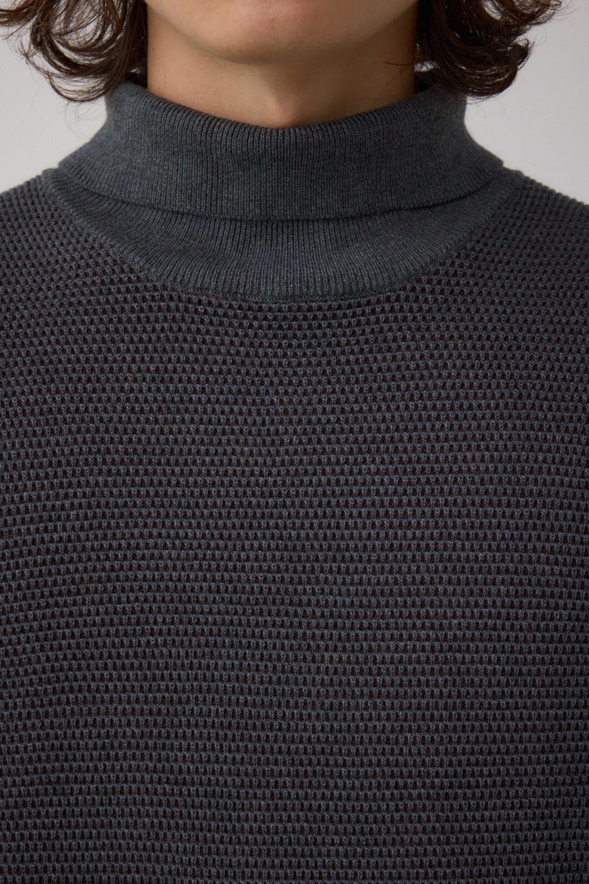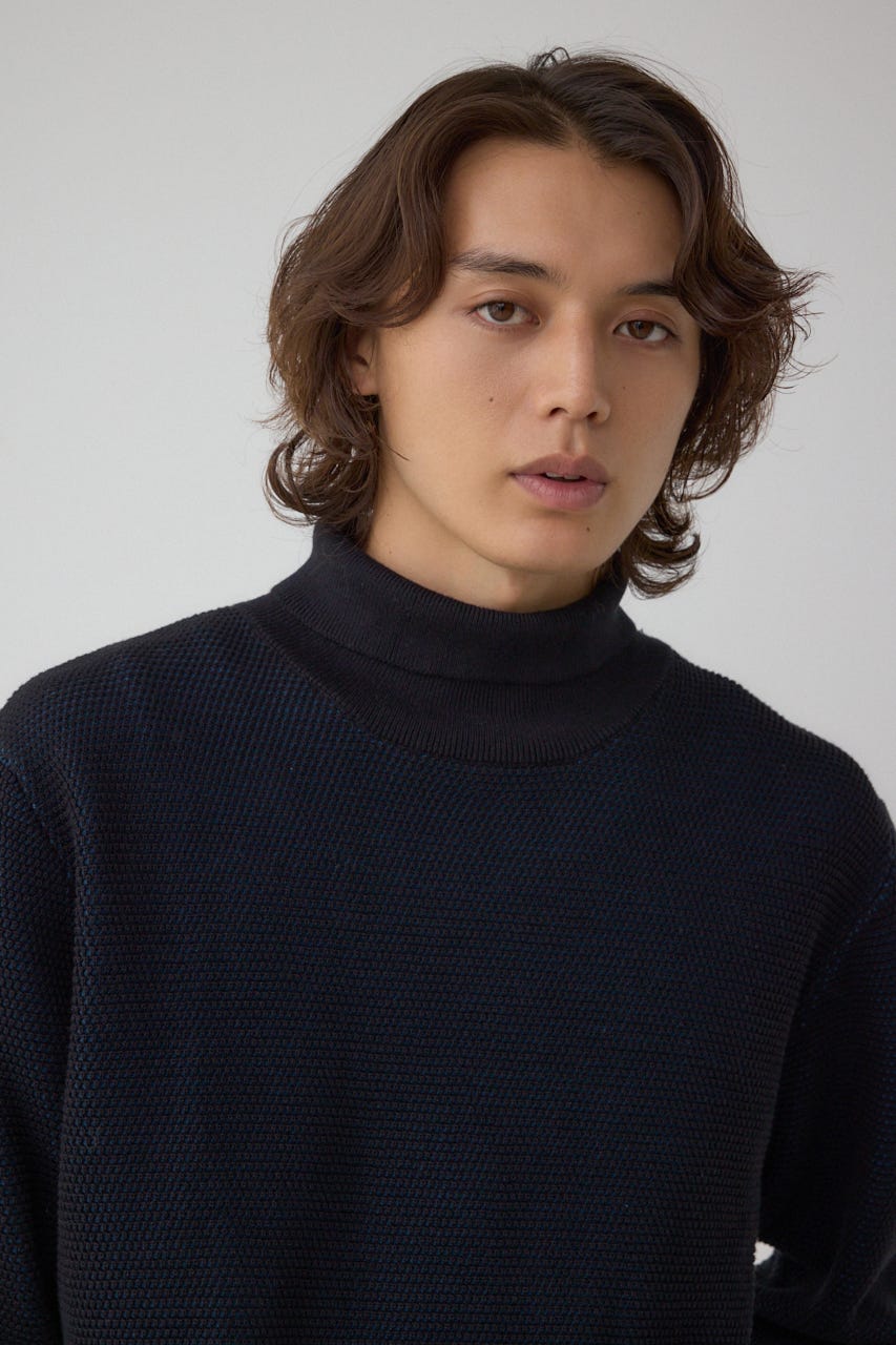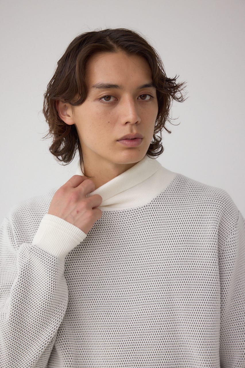 ハニカム編みのしっかりとしたボディに配色の編み柄を効かせたタートルネックニットです。