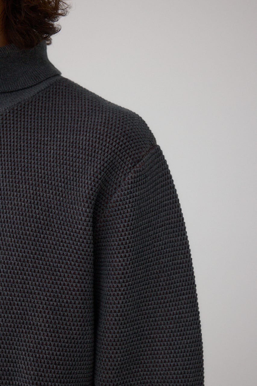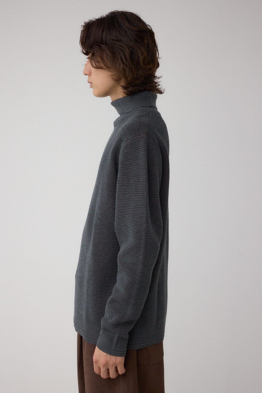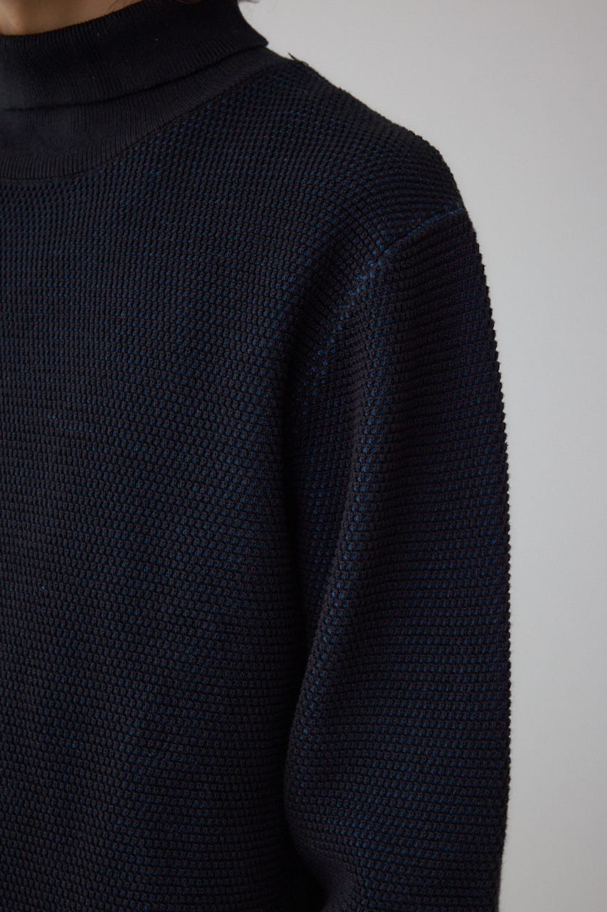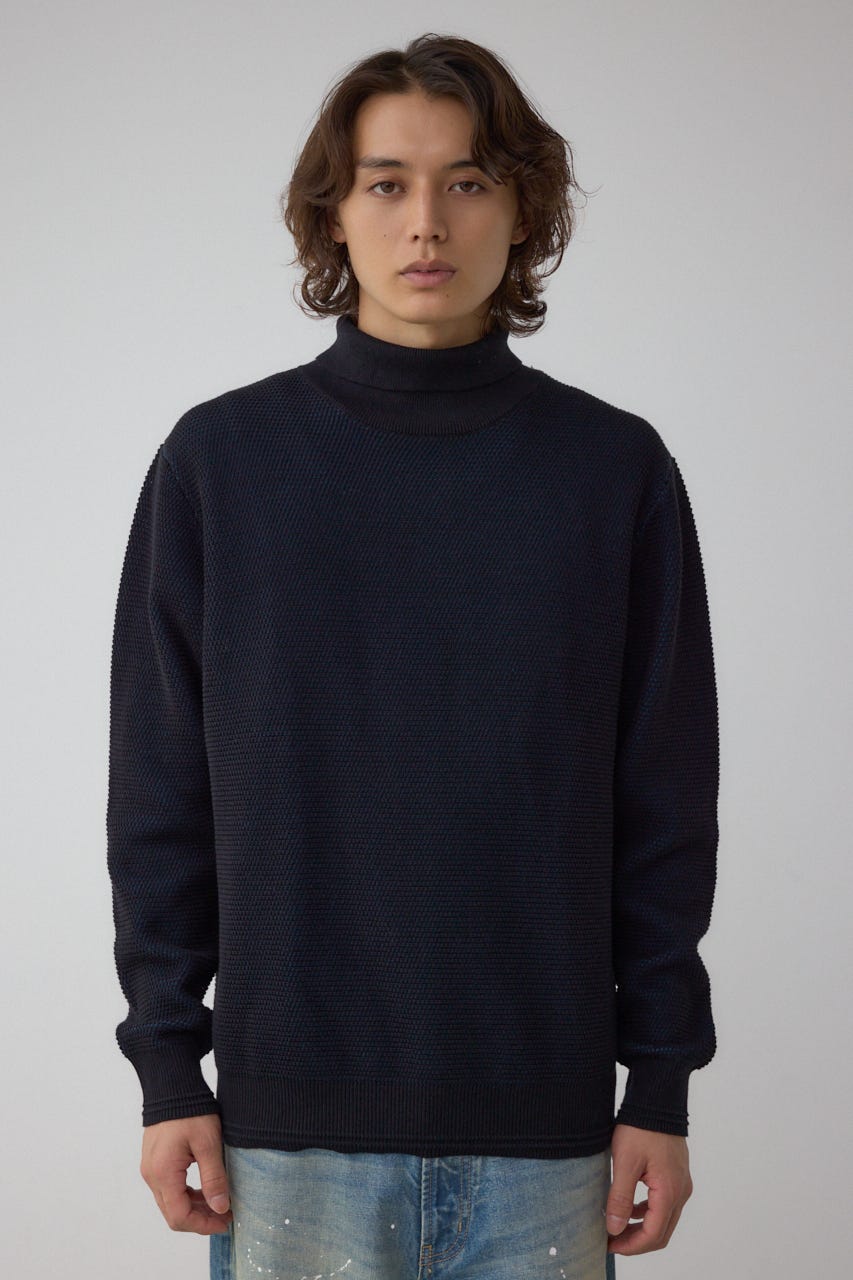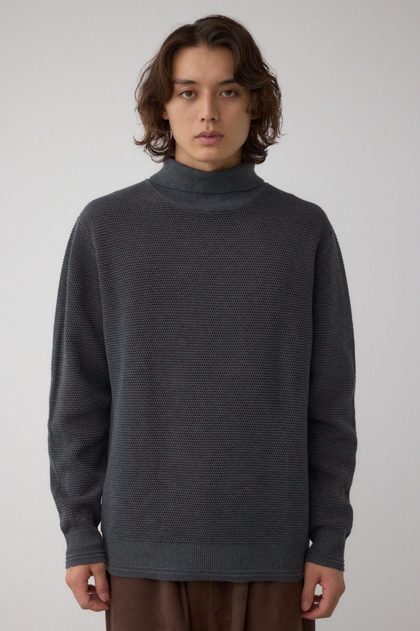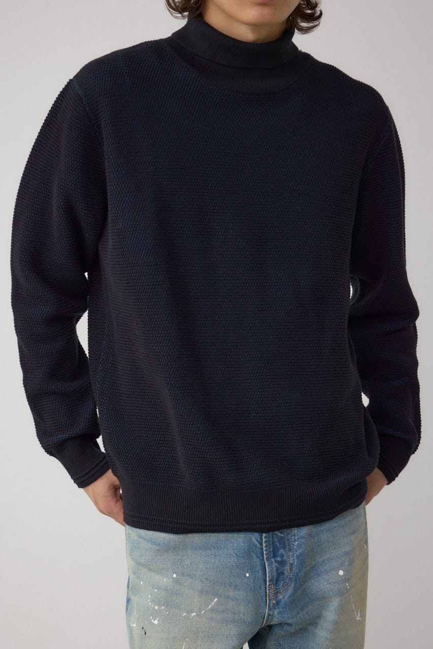 ハニカム編みのしっかりとしたボディに配色の編み柄を効かせたタートルネックニットです。