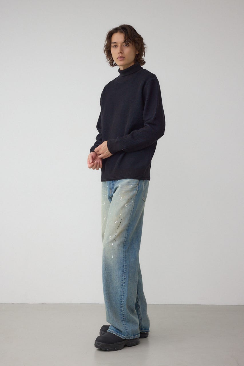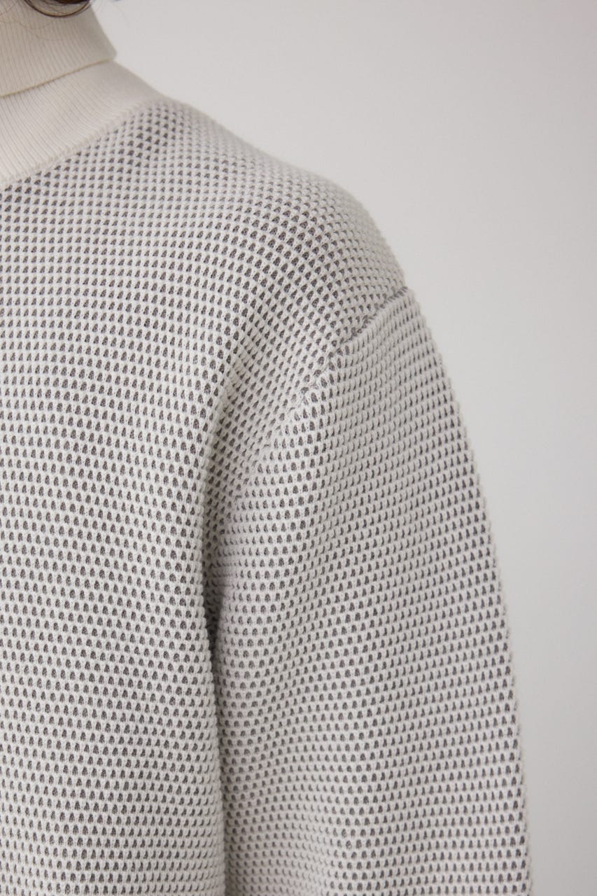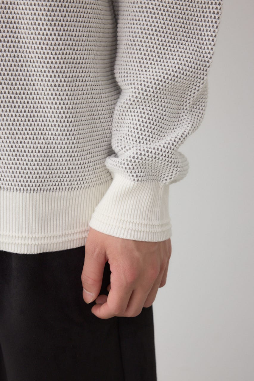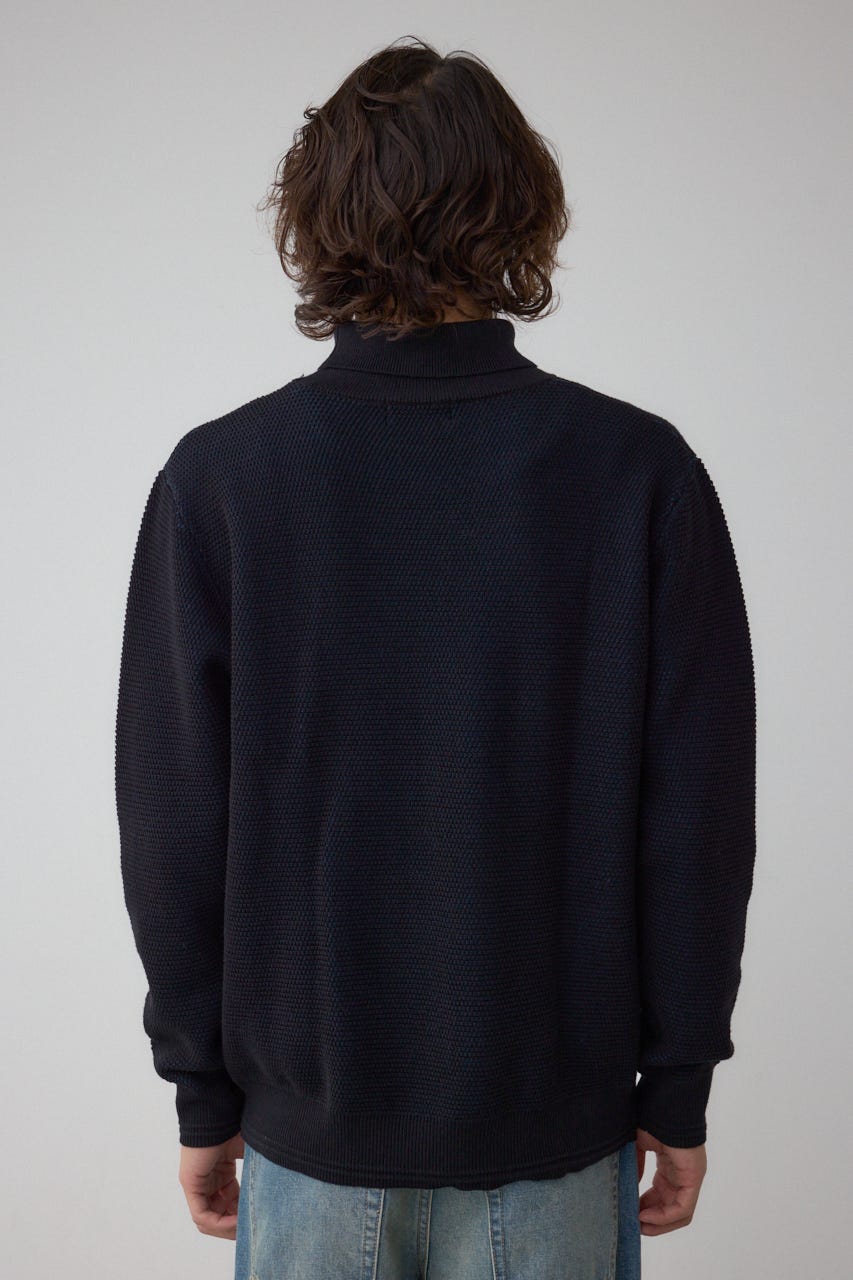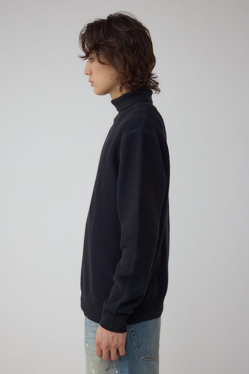 ハニカム編みのしっかりとしたボディに配色の編み柄を効かせたタートルネックニットです。