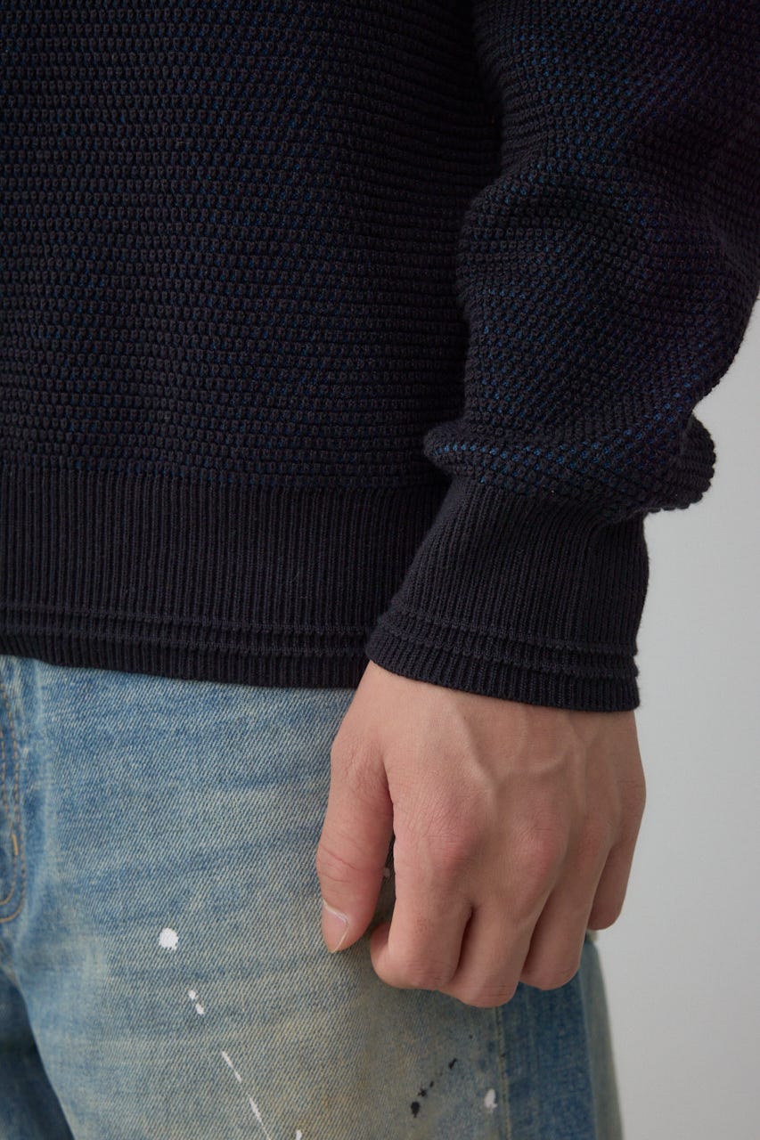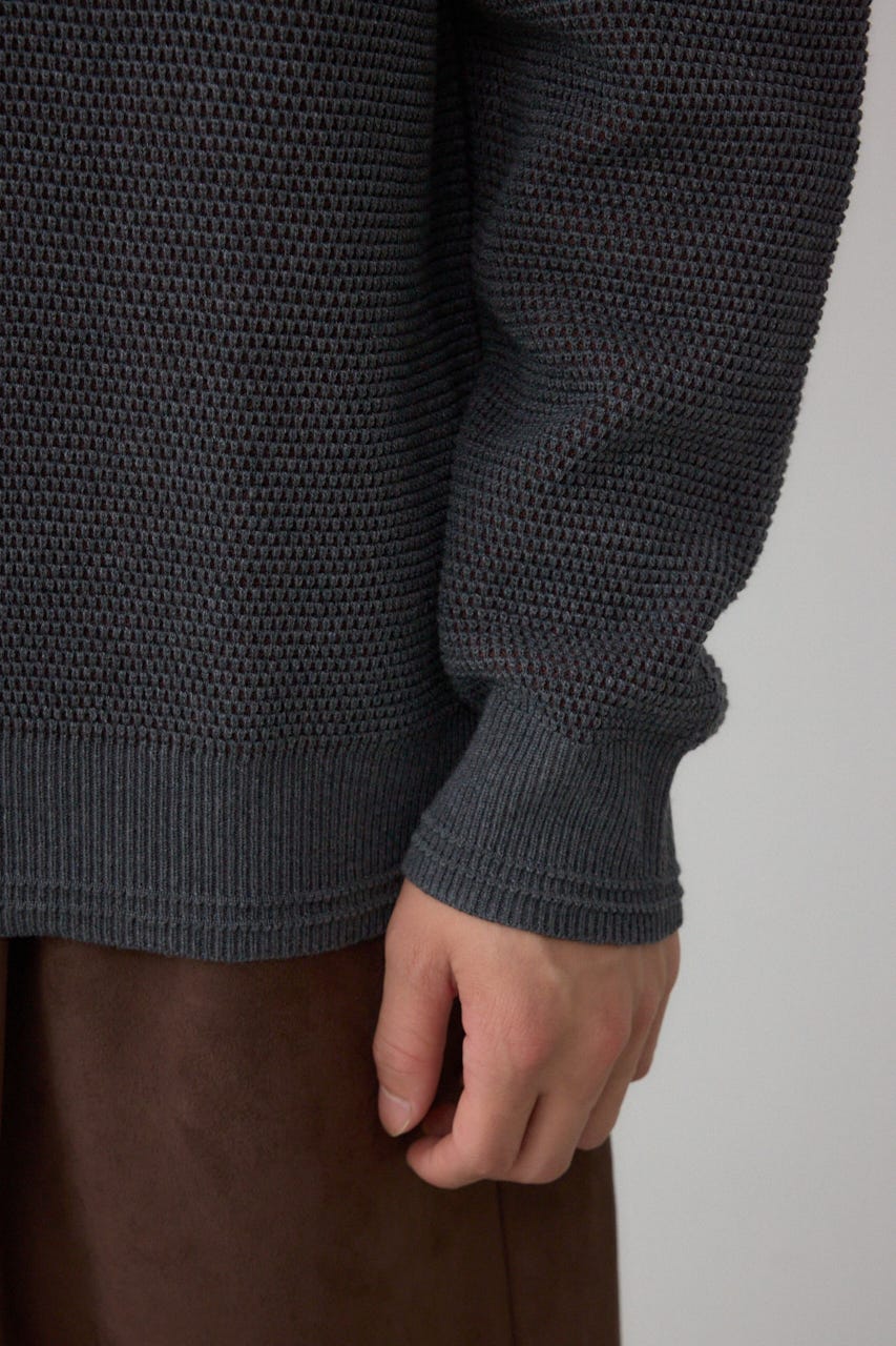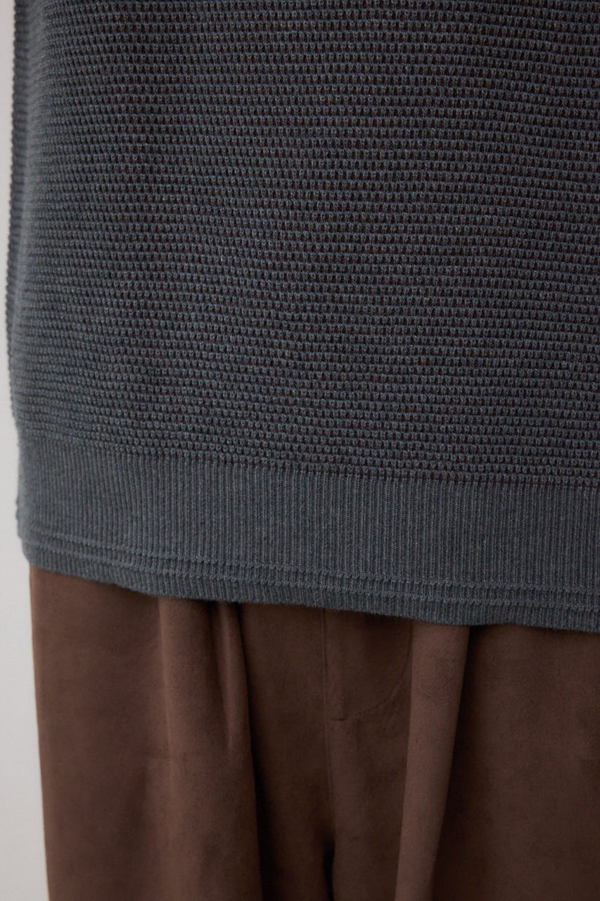 詰まったネックで防寒性が高く、ミニマルながら編地の表情がポイントになる一着。