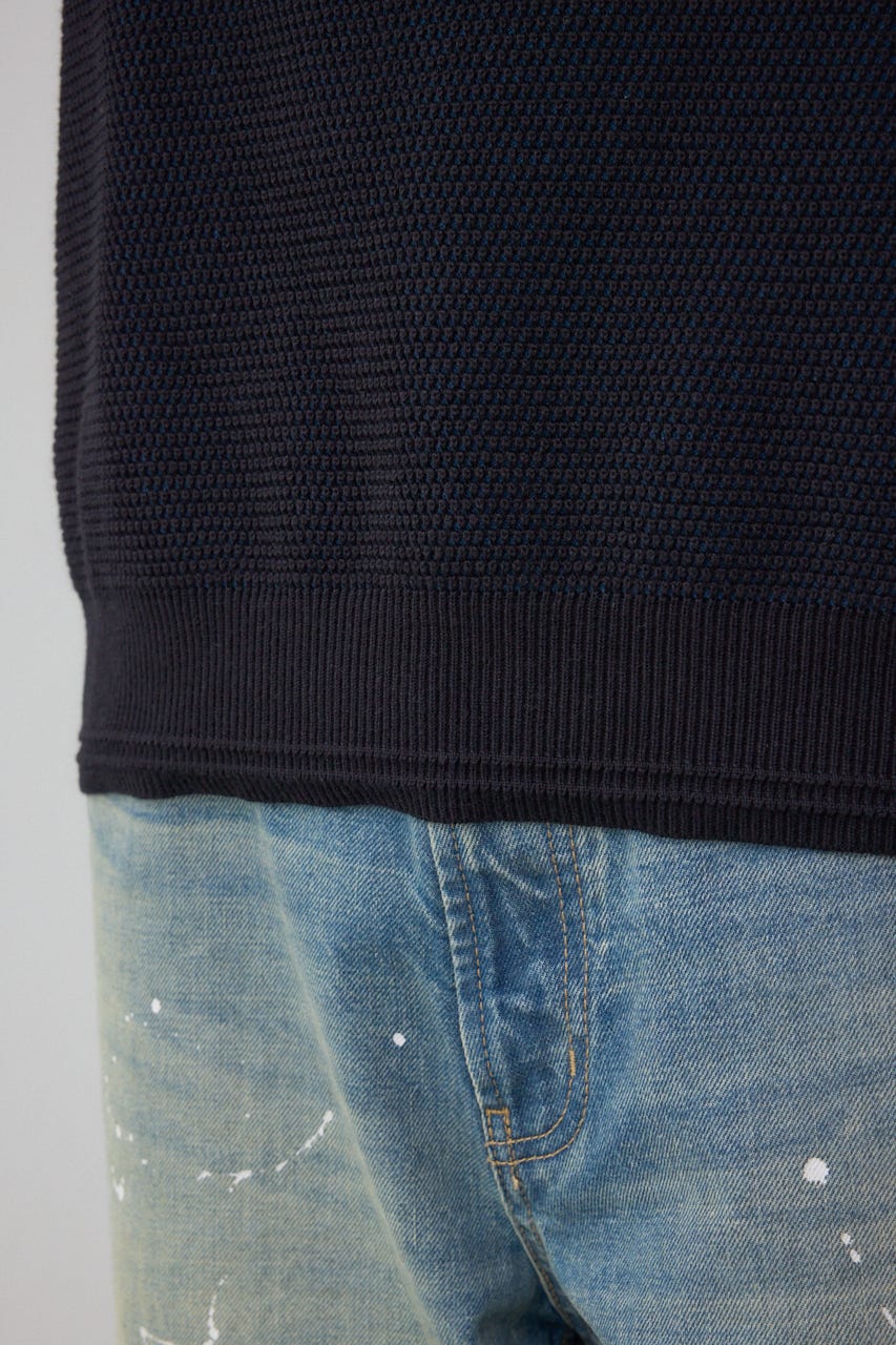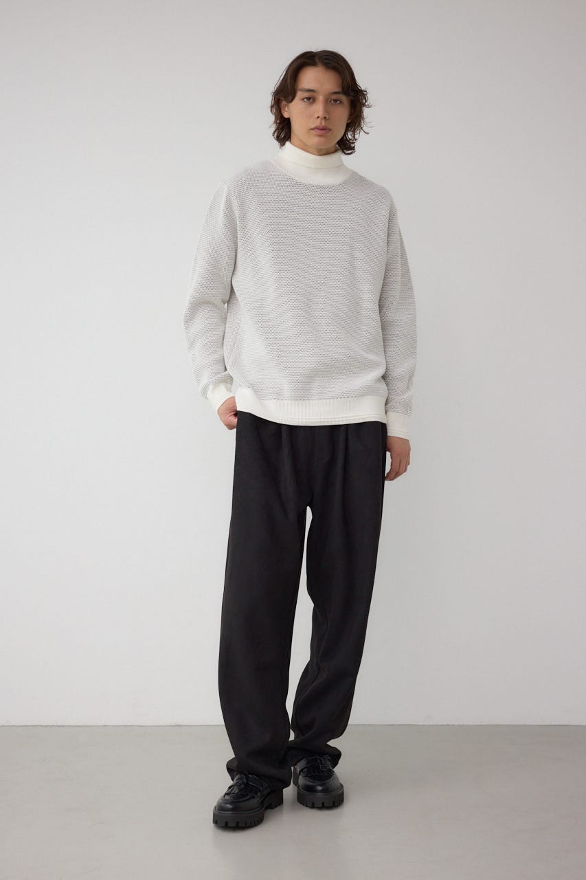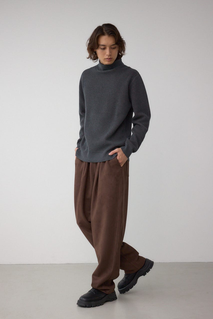 詰まったネックで防寒性が高く、ミニマルながら編地の表情がポイントになる一着。