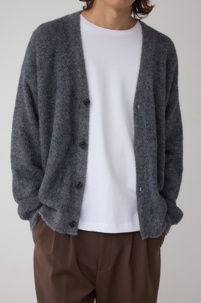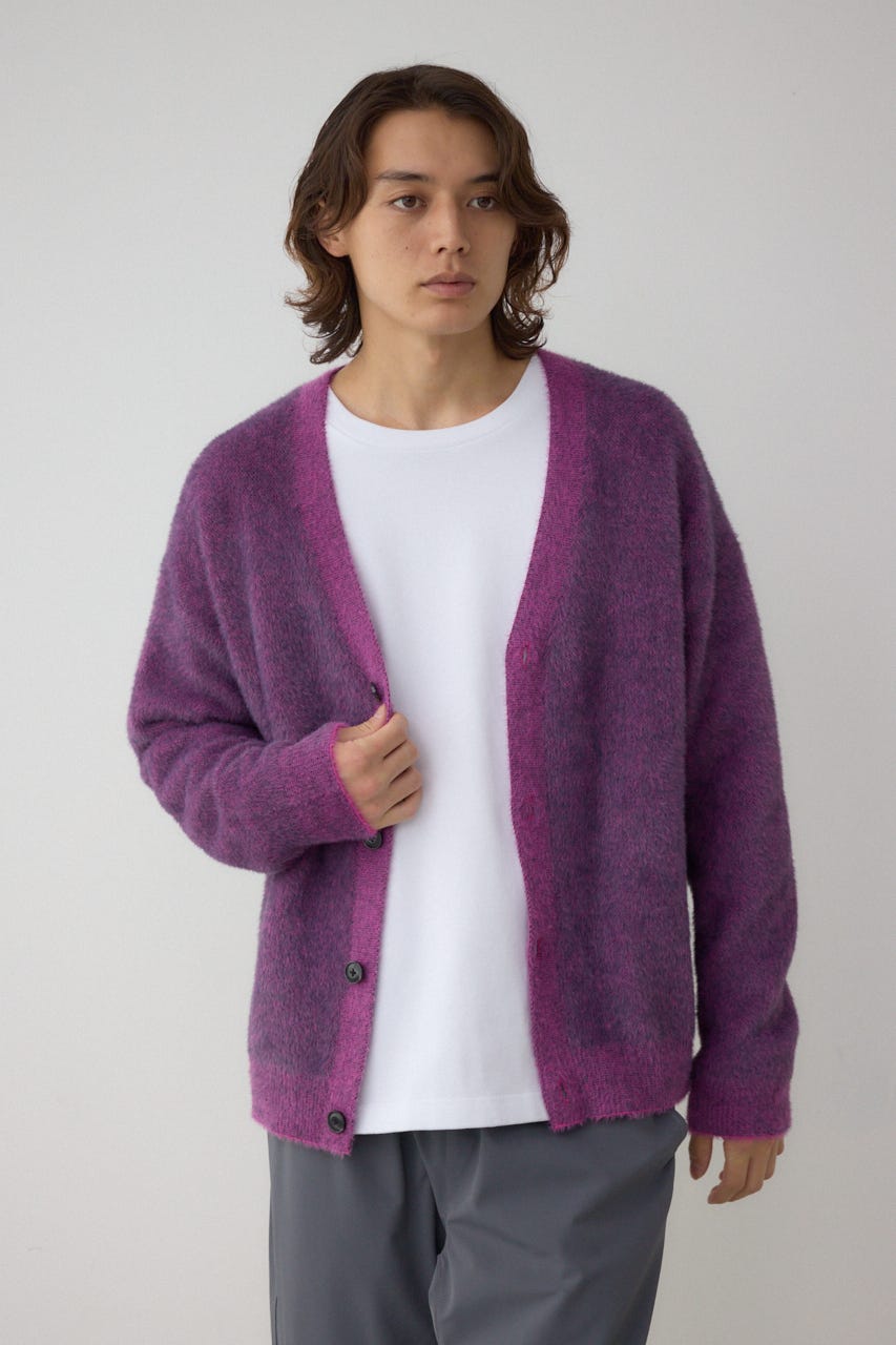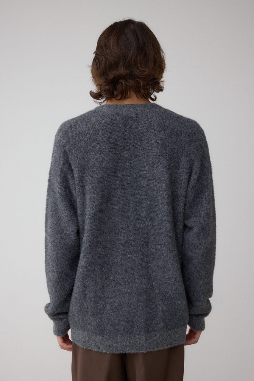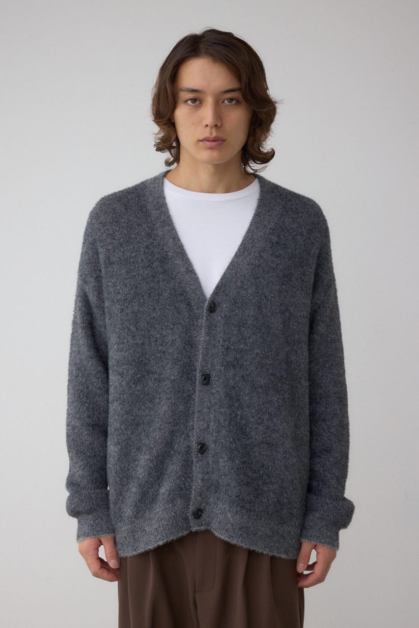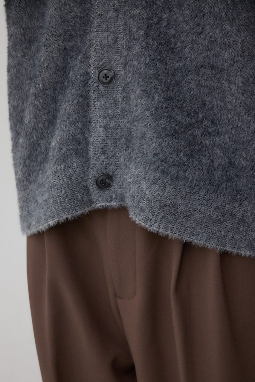 毛足のあるシャギー糸でツイード調の配色ジャガードを表現した暖かみのあるカーディガンです。