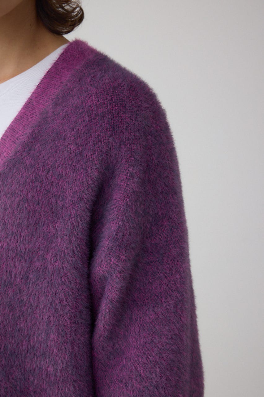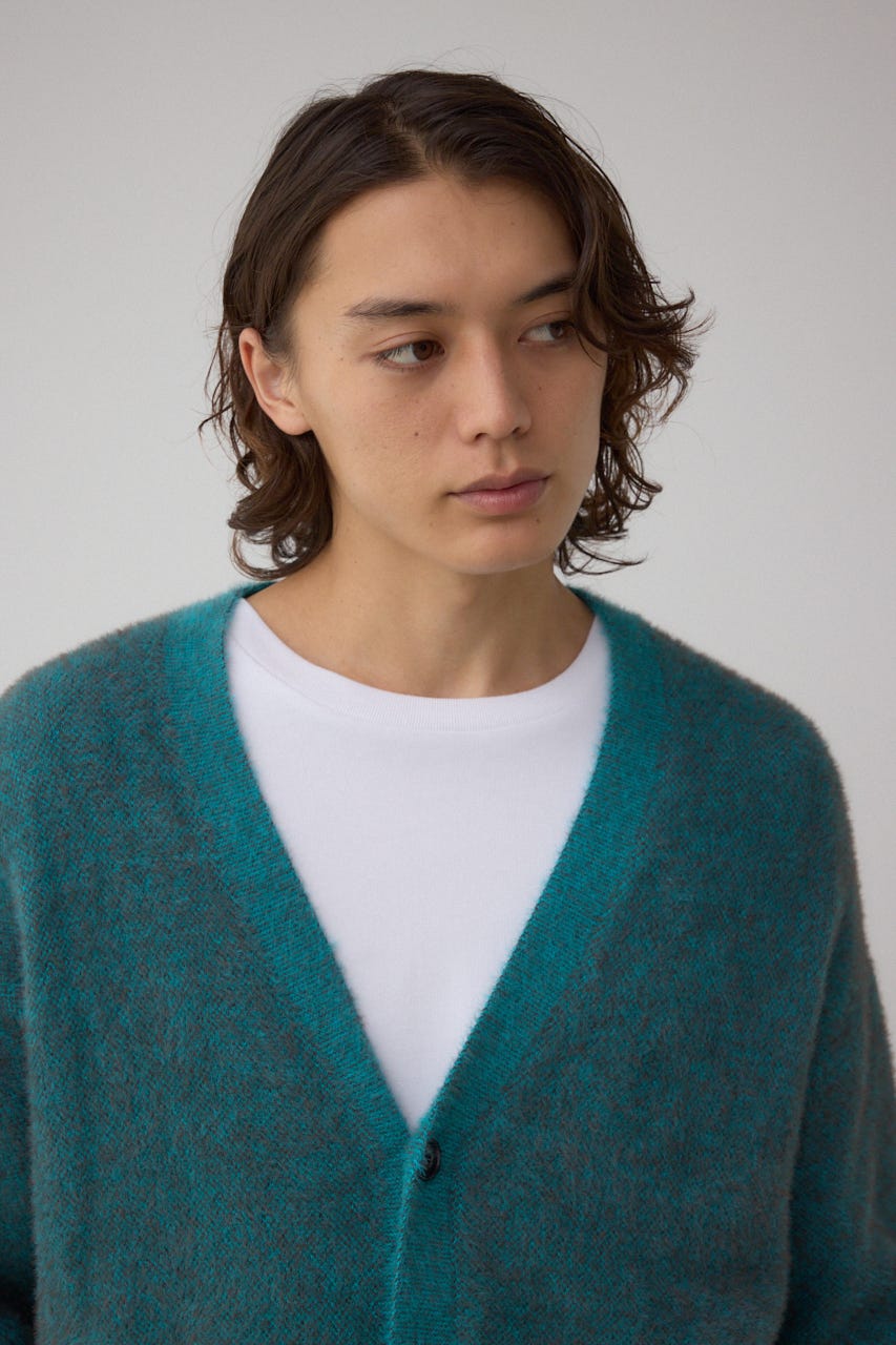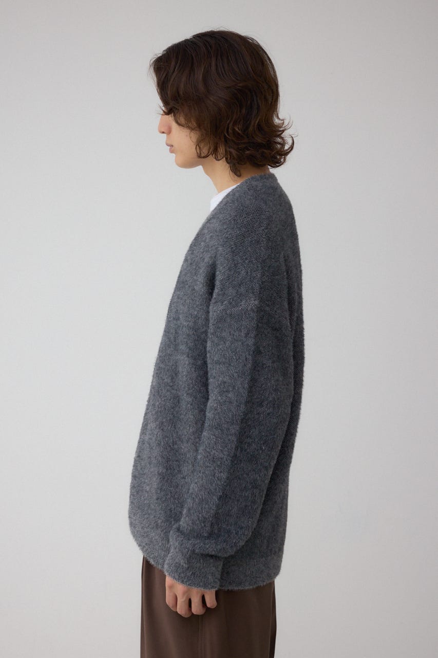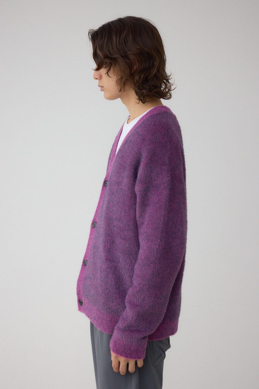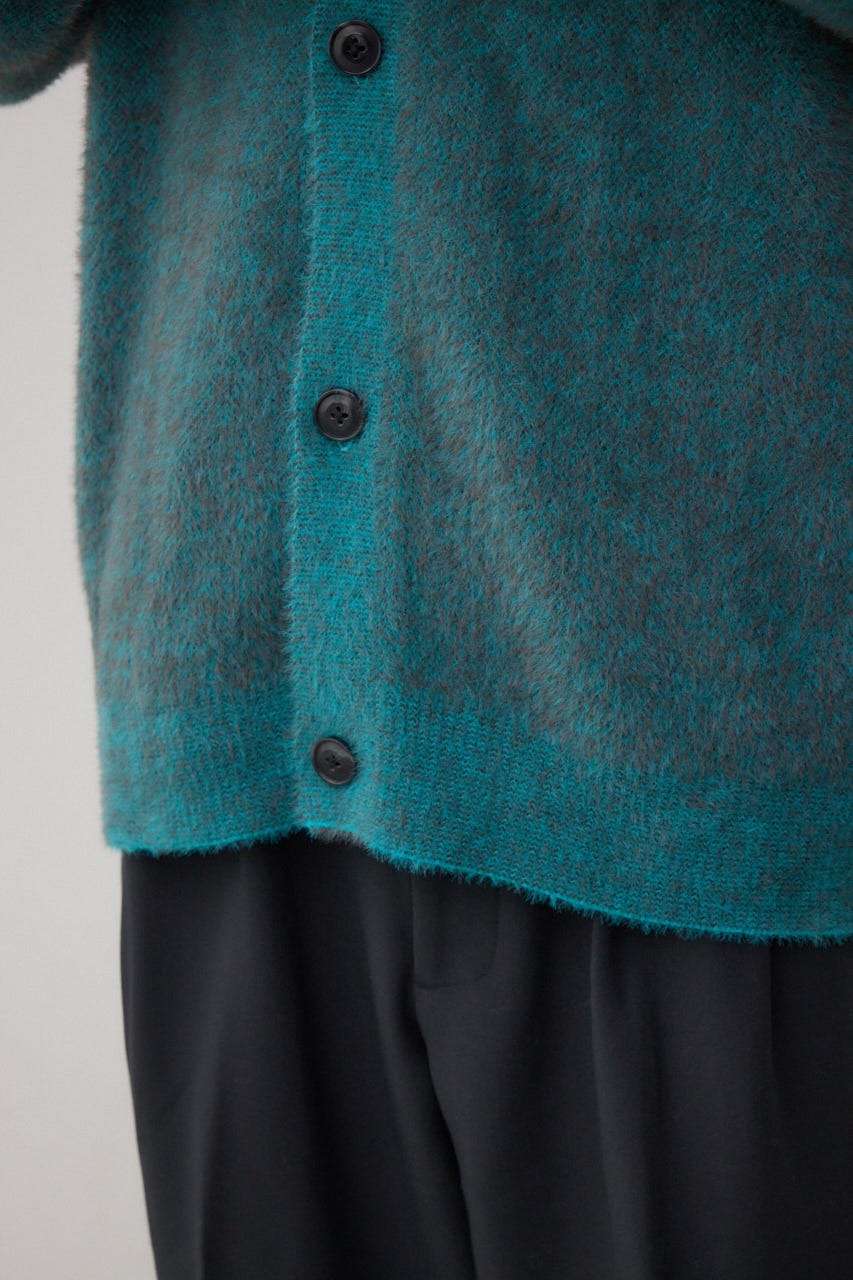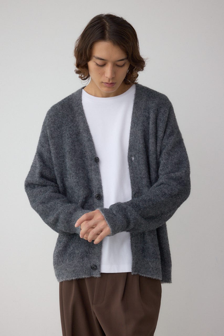 毛足のあるシャギー糸でツイード調の配色ジャガードを表現した暖かみのあるカーディガンです。